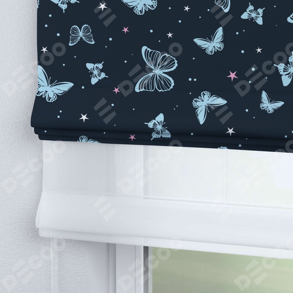 Римская штора день-ночь производителя «Cortin», используется для проёма, пошита из двух полотен, с лицевой блэкаут с нанесением сублимационной печати «Неоновые бабочки», вторая ткань тюль (по стандарту комплектуется тюль белого цвета артикул V-01). Имеет универсальный механизм и подходит для монтажа: на потолок, на стену и в нишу.
