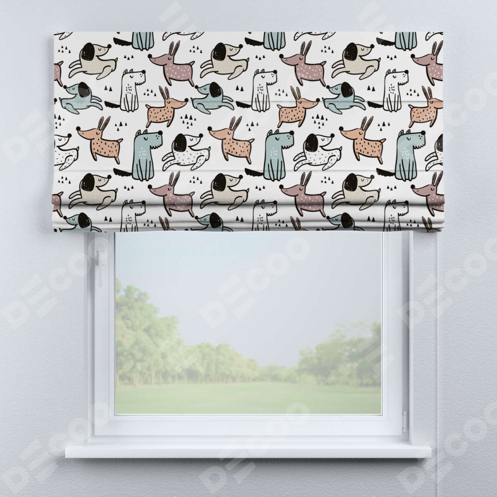 Римская штора производителя «Cortin», используется для проёма, пошита из ткани блэкаут с нанесением сублимационной печати «Очаровательные щеночки». Имеет универсальный механизм и подходит для монтажа: на потолок, на стену и в нишу.