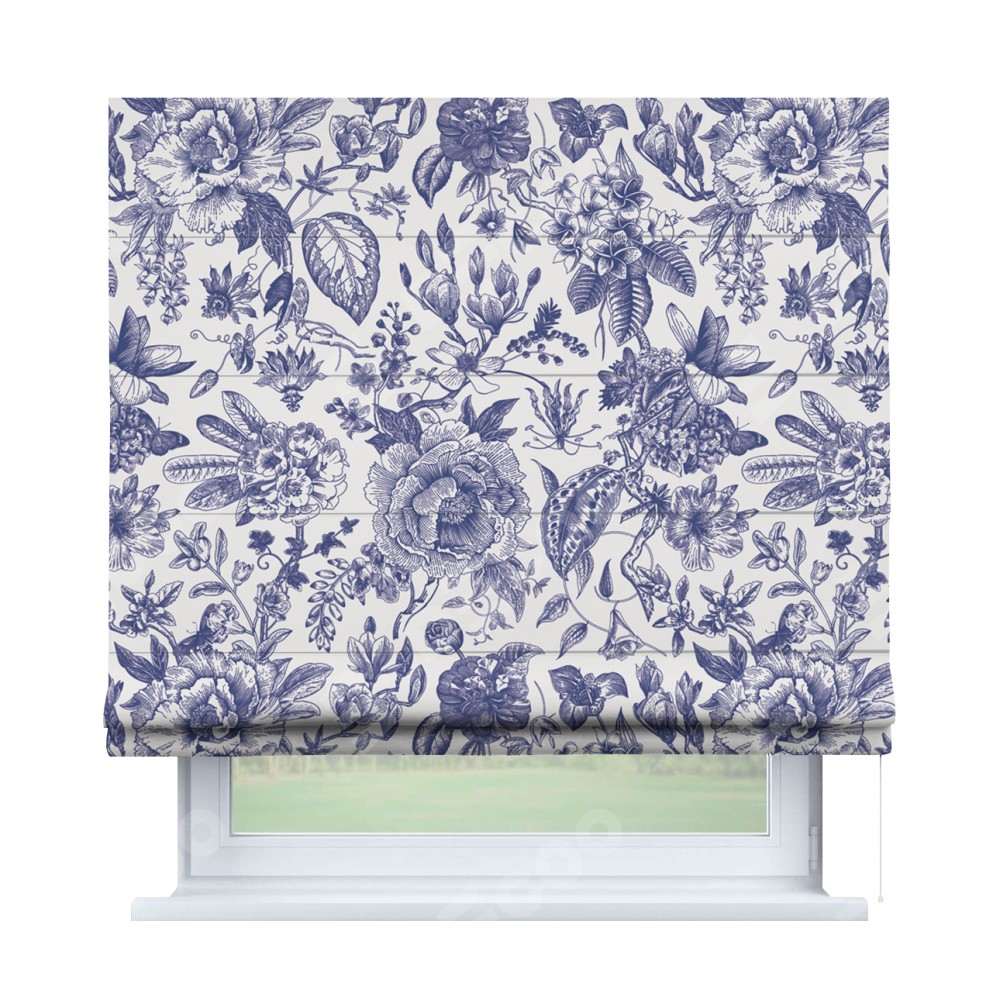 Римская штора производителя «Cortin», используется для проёма, пошита из ткани блэкаут с нанесением сублимационной печати «Прованс в синем». Имеет универсальный механизм и подходит для монтажа: на потолок, на стену и в нишу.