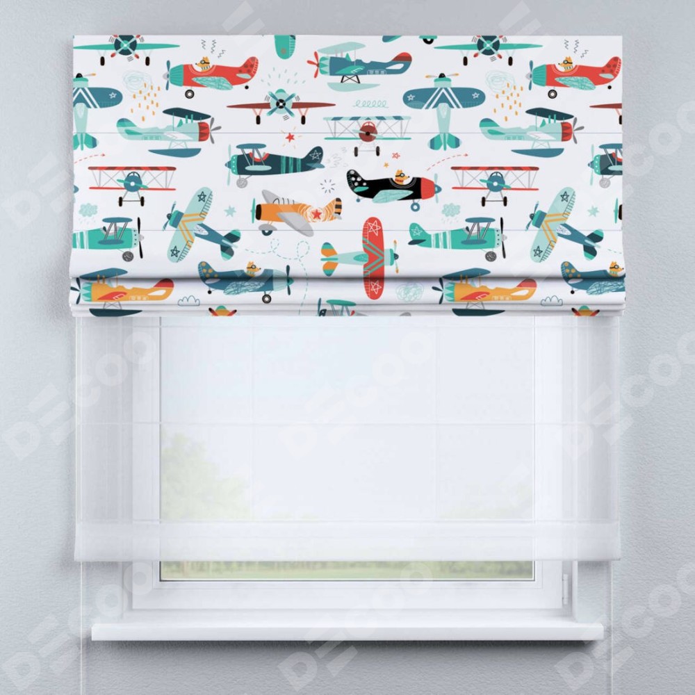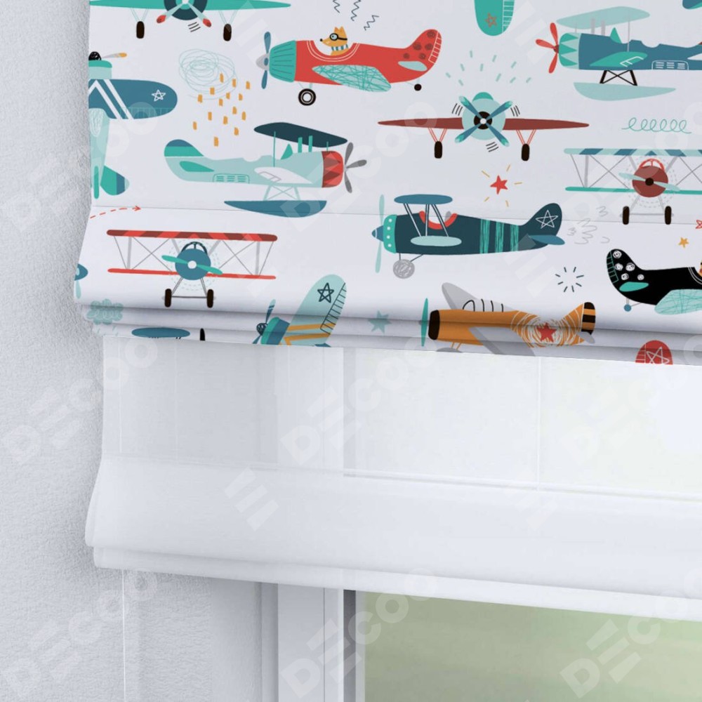 Римская штора день-ночь производителя «Cortin», используется для проёма, пошита из двух полотен, с лицевой блэкаут с нанесением сублимационной печати «Самолёты и пилоты», вторая ткань тюль (по стандарту комплектуется тюль белого цвета артикул V-01). Имеет универсальный механизм и подходит для монтажа: на потолок, на стену и в нишу.