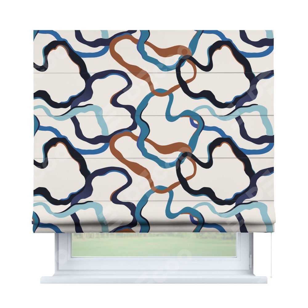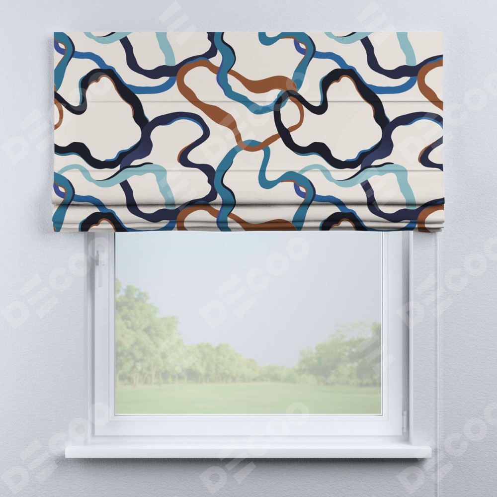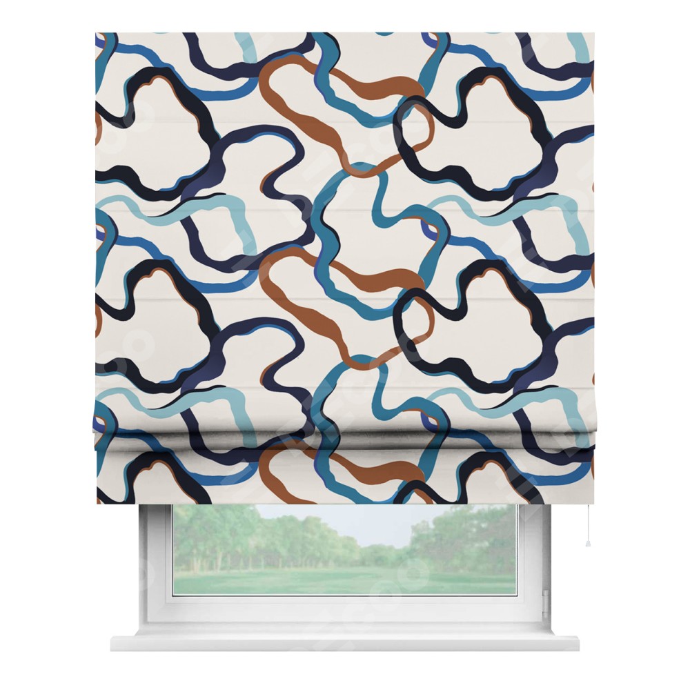 Римская штора производителя «Cortin», используется для проёма, пошита из ткани блэкаут с нанесением сублимационной печати «Волнистые ленты». Имеет универсальный механизм и подходит для монтажа: на потолок, на стену и в нишу.