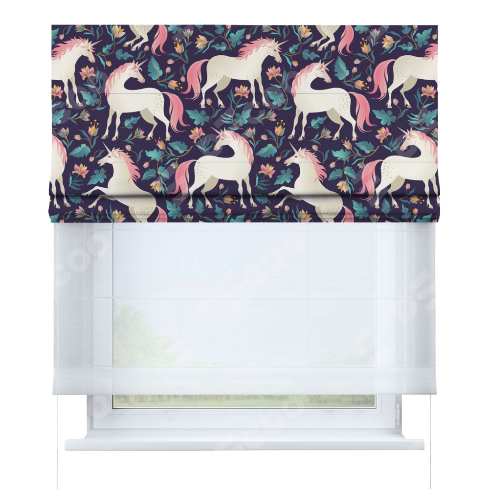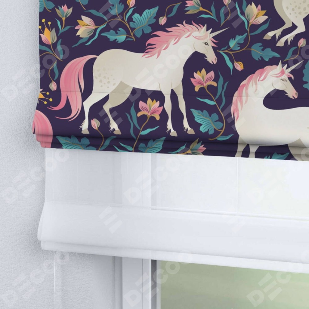 Римская штора день-ночь производителя «Cortin», используется для проёма, пошита из двух полотен, с лицевой блэкаут с нанесением сублимационной печати «Сказочные единороги», вторая ткань тюль (по стандарту комплектуется тюль белого цвета артикул V-01). Имеет универсальный механизм и подходит для монтажа: на потолок, на стену и в нишу.