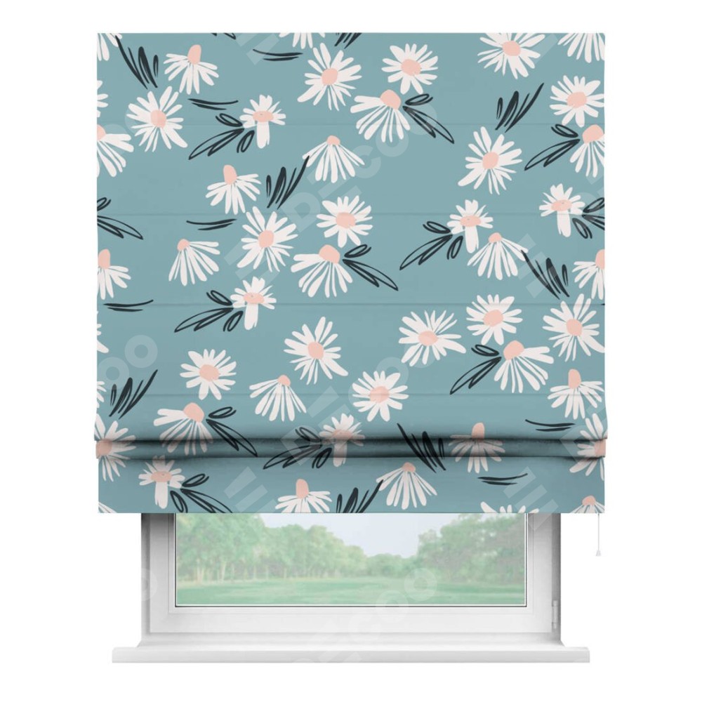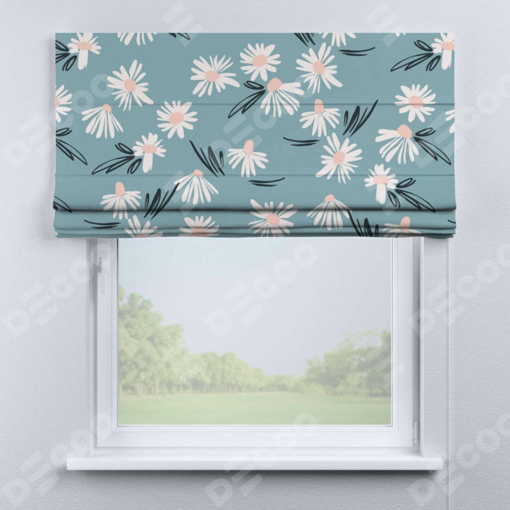 Римская штора производителя «Cortin», используется для проёма, пошита из ткани блэкаут с нанесением сублимационной печати «Чудесные ромашки». Имеет универсальный механизм и подходит для монтажа: на потолок, на стену и в нишу.