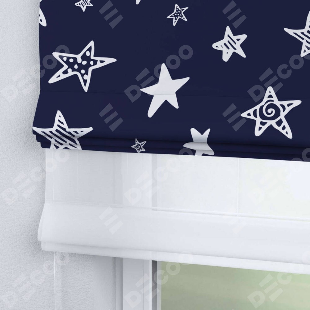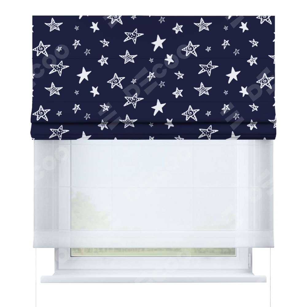 Римская штора день-ночь производителя «Cortin», используется для проёма, пошита из двух полотен, с лицевой блэкаут с нанесением сублимационной печати «Ночные звёзды», вторая ткань тюль (по стандарту комплектуется тюль белого цвета артикул V-01). Имеет универсальный механизм и подходит для монтажа: на потолок, на стену и в нишу.
