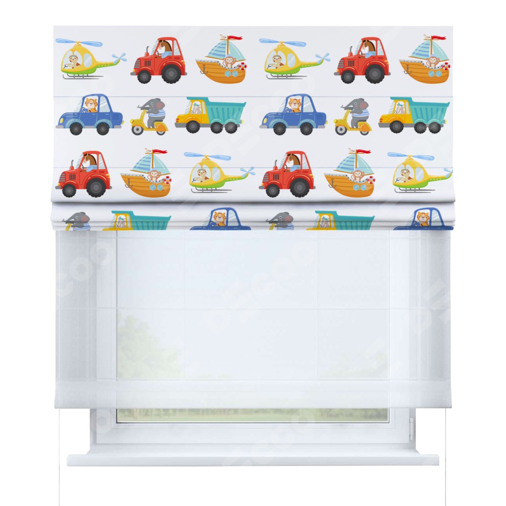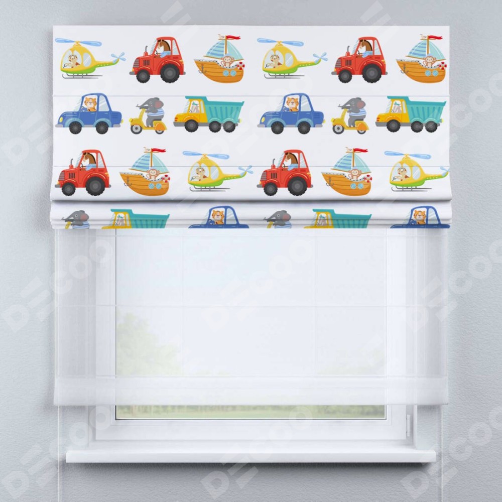 Римская штора день-ночь производителя «Cortin», используется для проёма, пошита из двух полотен, с лицевой блэкаут с нанесением сублимационной печати «Увлекательная поездка», вторая ткань тюль (по стандарту комплектуется тюль белого цвета артикул V-01). Имеет универсальный механизм и подходит для монтажа: на потолок, на стену и в нишу.