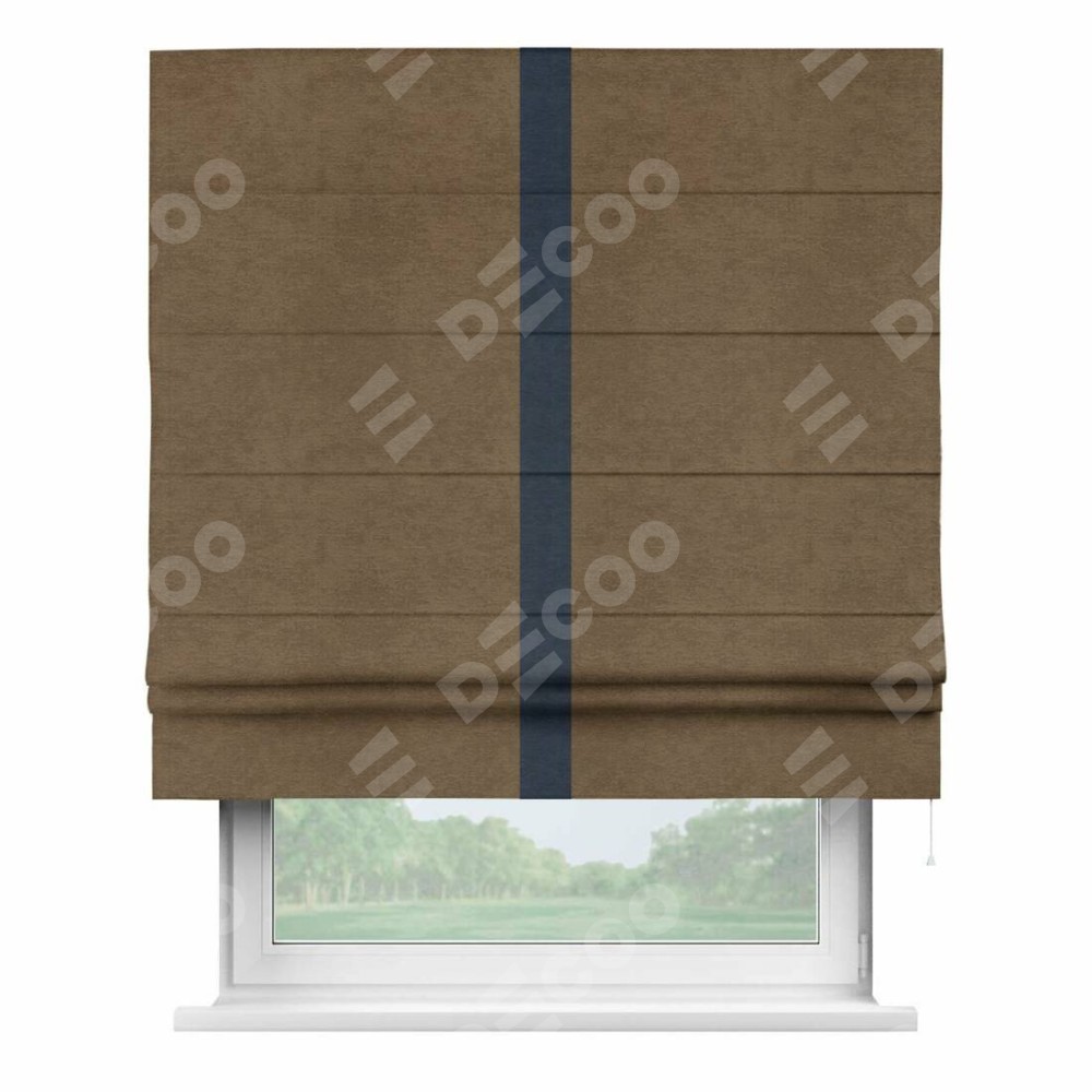 Римская штора производителя «Cortin», используется для проёма, пошита из ткани софт однотонный бронзовый, артикул 33099. Отделка шторы кантом «Хайвэй», ткань для канта используется из софта разной расцветки на выбор. Имеет универсальный механизм и подходит для монтажа: на потолок, на стену и в нишу.