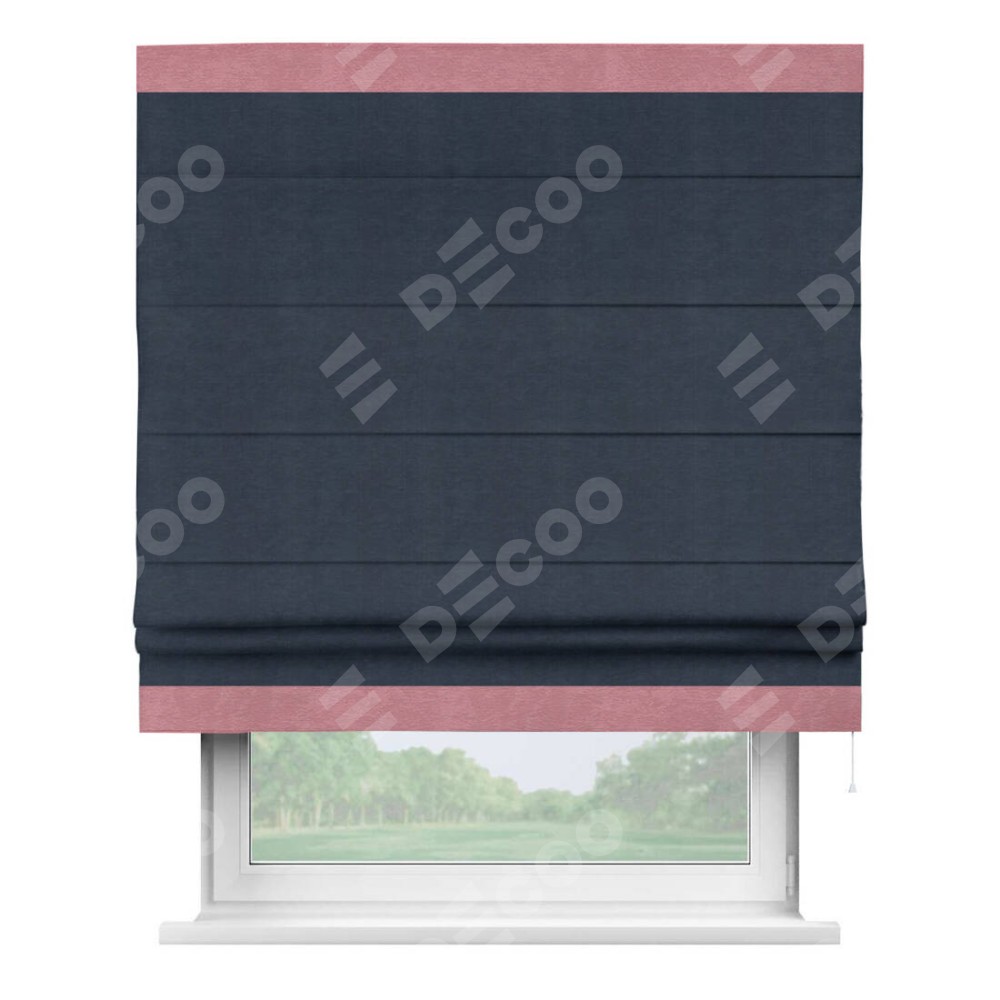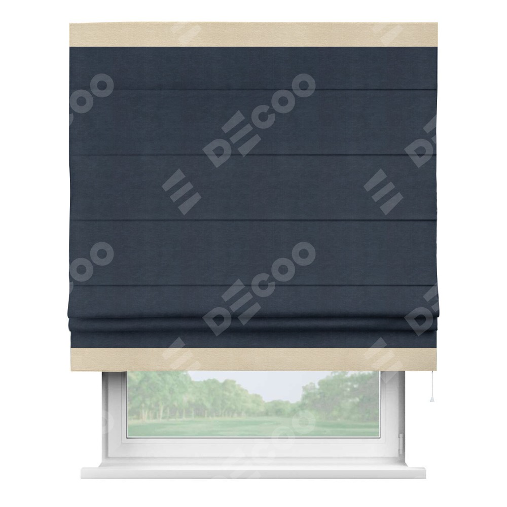 Римская штора производителя «Cortin», используется для проёма, пошита из ткани софт однотонный тёмно-синий, артикул 33111. Отделка шторы кантом «Горизонт», ткань для канта используется из софта разной расцветки на выбор. Имеет универсальный механизм и подходит для монтажа: на потолок, на стену и в нишу.
