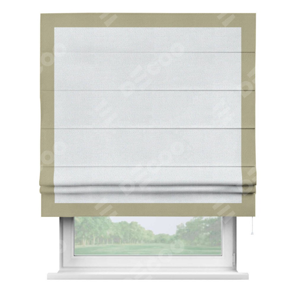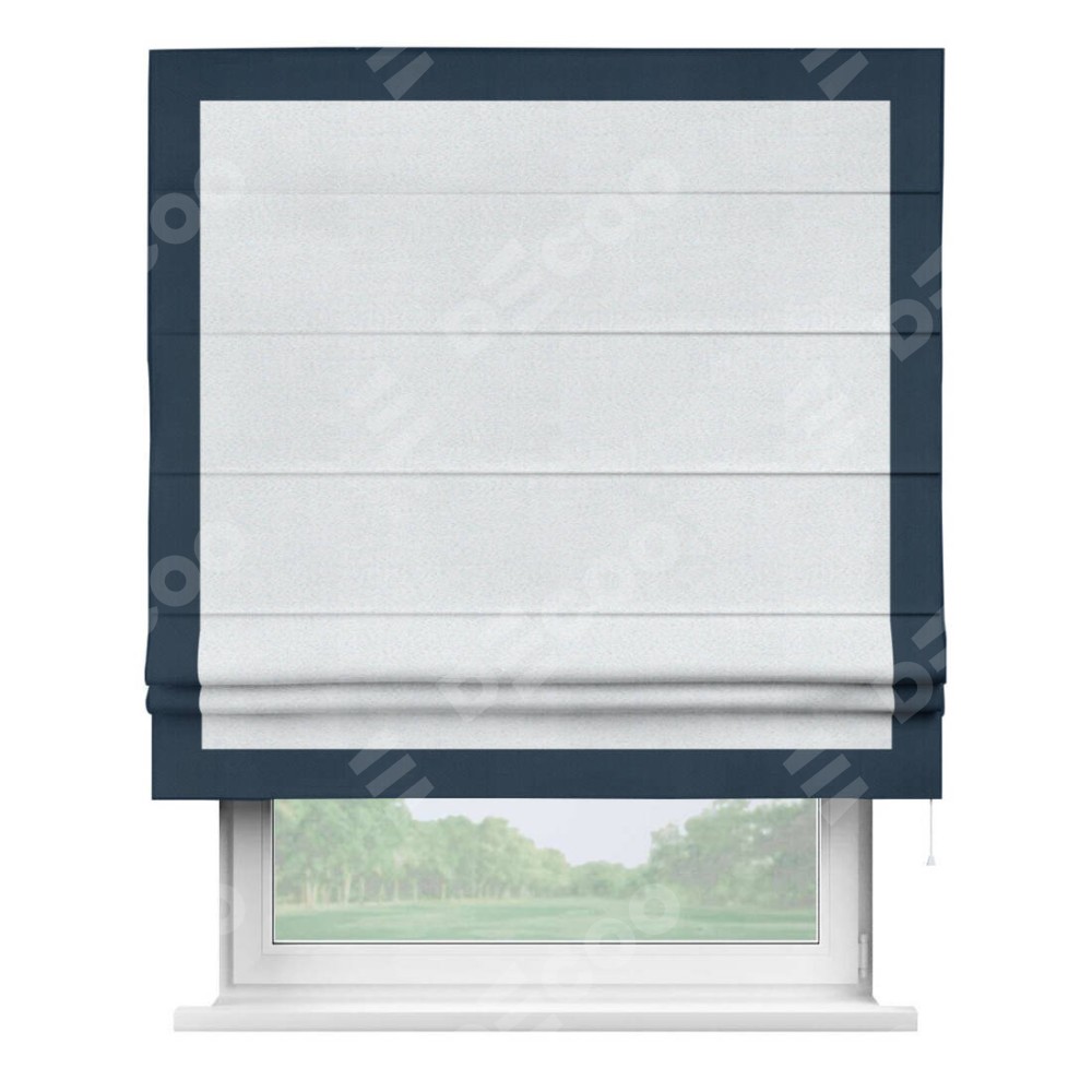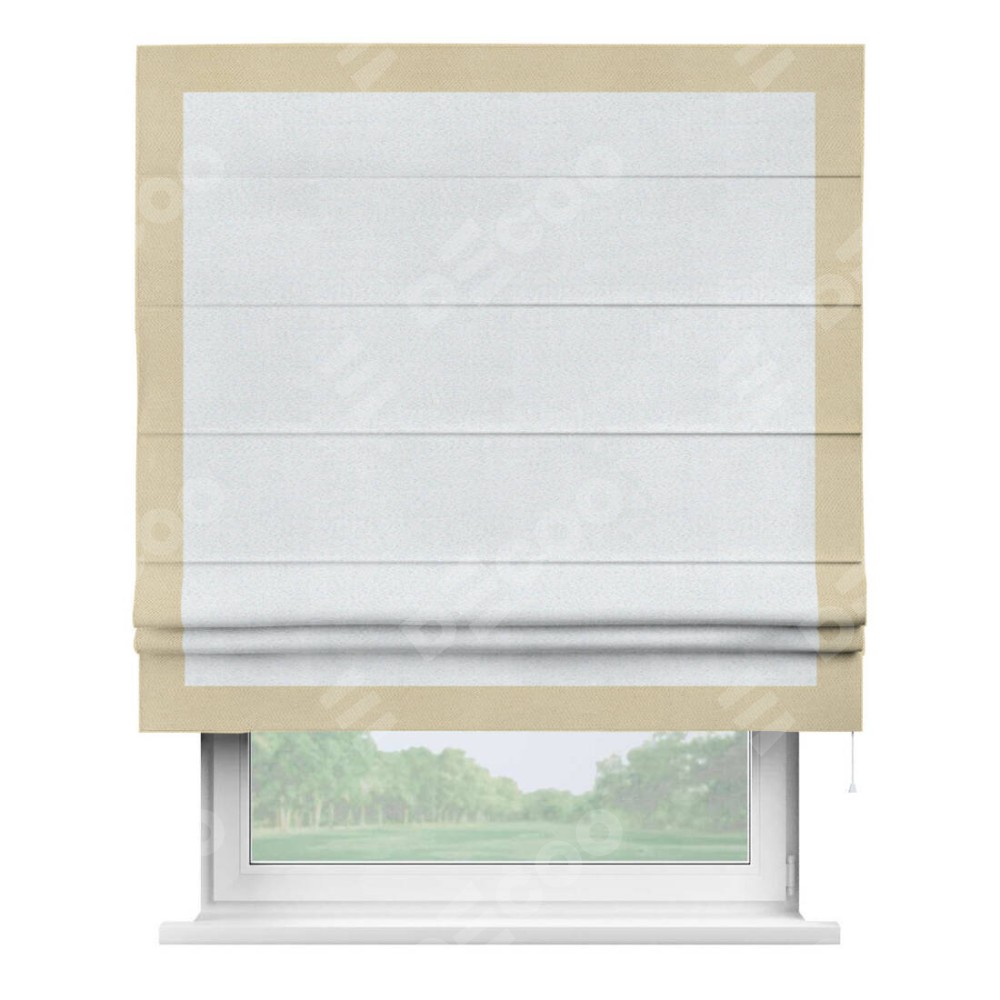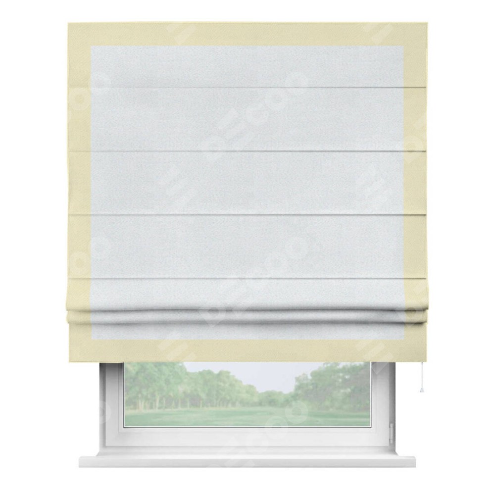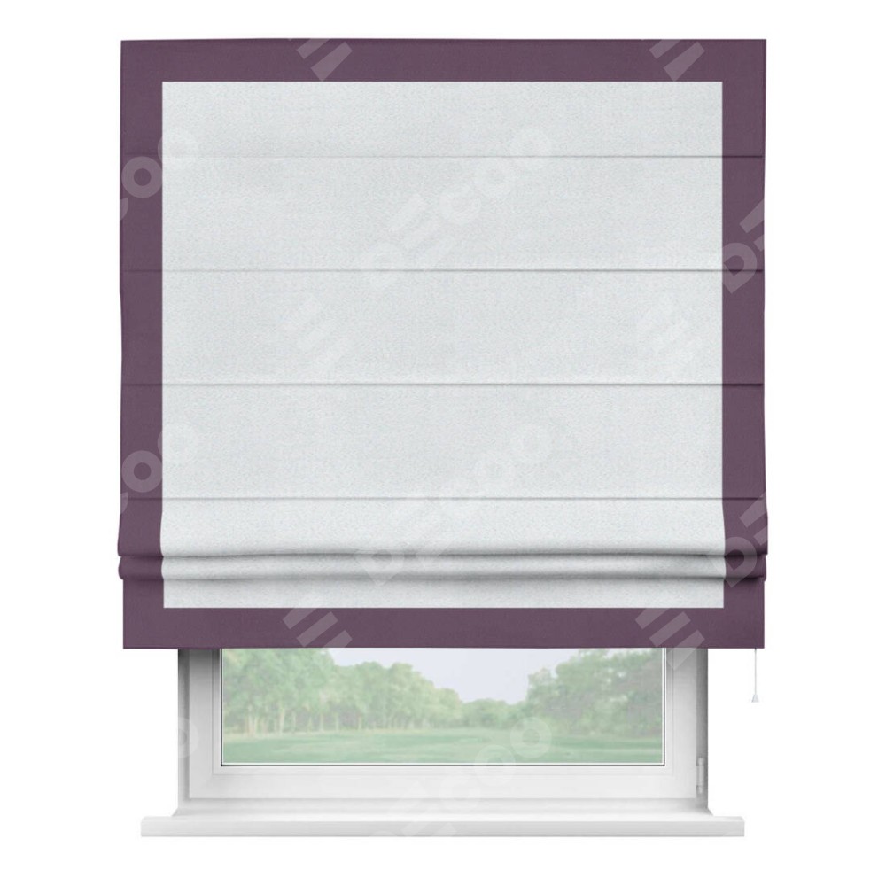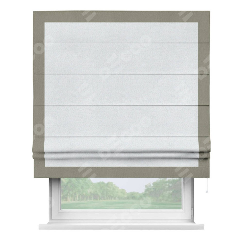 Римская штора производителя «Cortin», используется для проёма, пошита из ткани блэкаут однотонный дымчато-белый, артикул ткани 101. Отделка шторы кантом «Чесс», ткань для канта используется из блэкаута однотонного разной расцветки на выбор. Имеет универсальный механизм и подходит для монтажа: на потолок, на стену и в нишу.