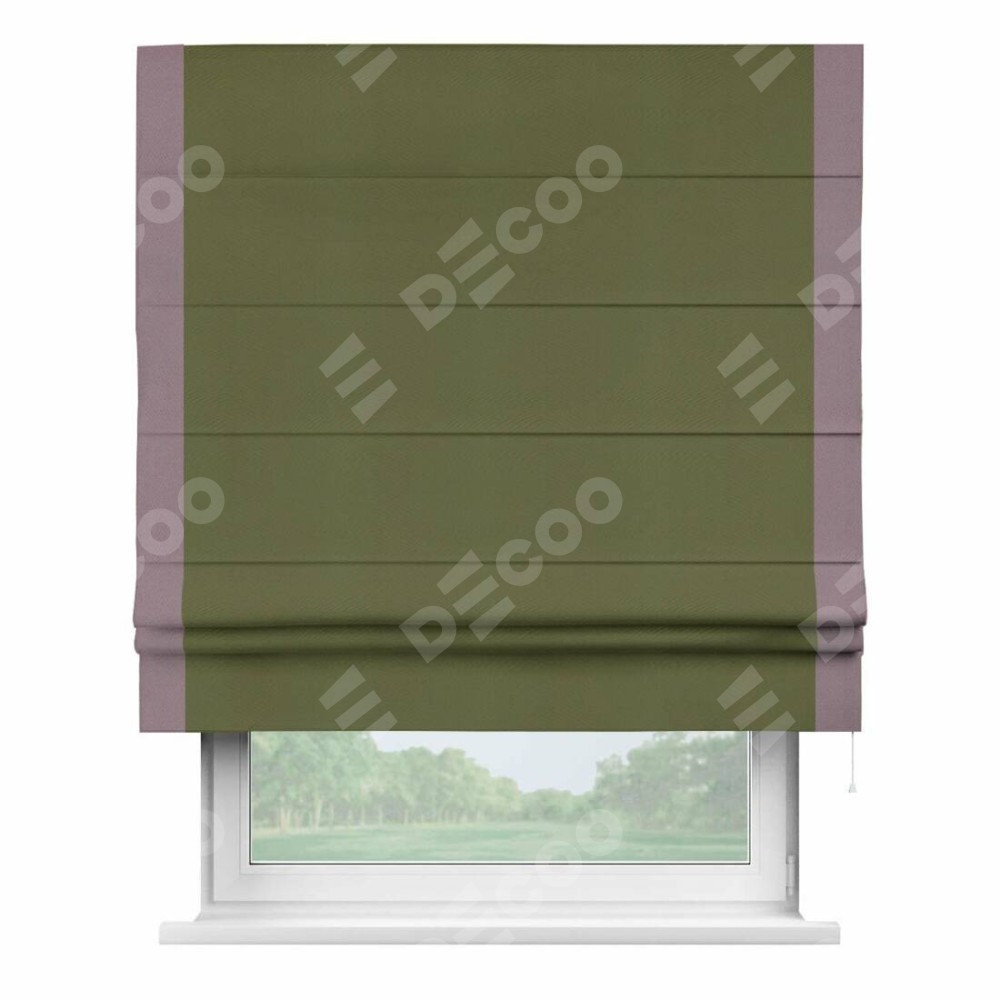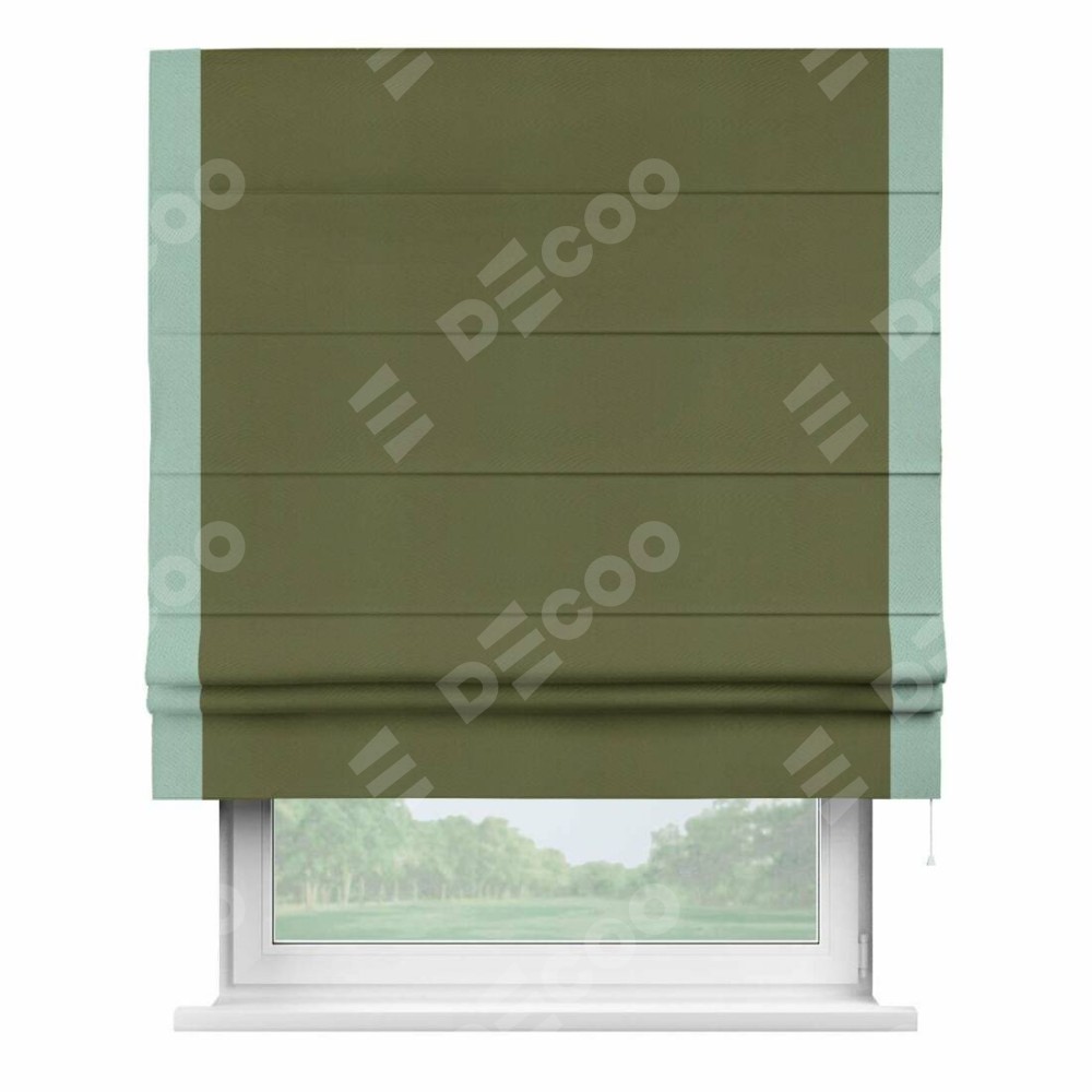 Римская штора производителя «Cortin», используется для проёма, пошита из ткани блэкаут однотонный зелёный, артикул ткани 81859. Отделка шторы кантом «Стрим Дуо», ткань для канта используется из блэкаута однотонного разной расцветки на выбор. Имеет универсальный механизм и подходит для монтажа: на потолок, на стену и в нишу.