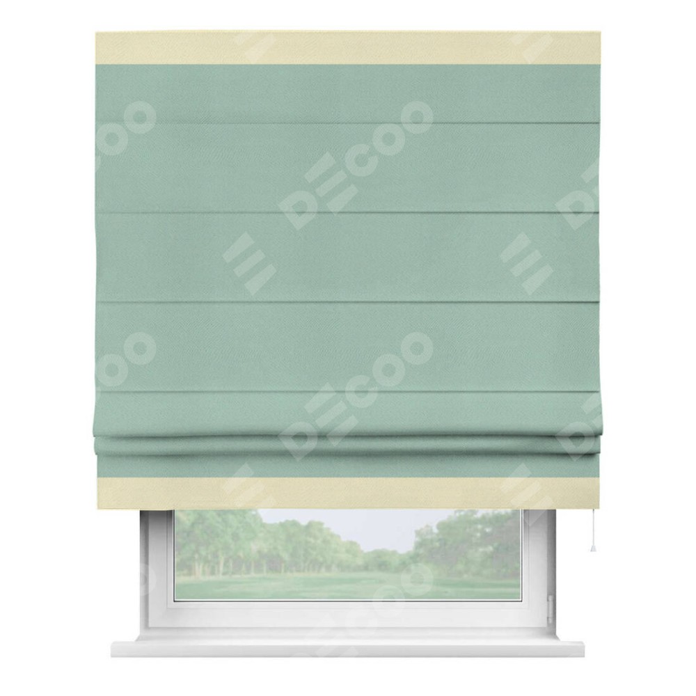 Римская штора производителя «Cortin», используется для проёма, пошита из ткани блэкаут однотонный ментоловый, артикул ткани 29584. Отделка шторы кантом «Горизонт», ткань для канта используется из блэкаута однотонного разной расцветки на выбор. Имеет универсальный механизм и подходит для монтажа: на потолок, на стену и в нишу.