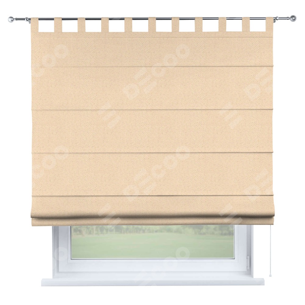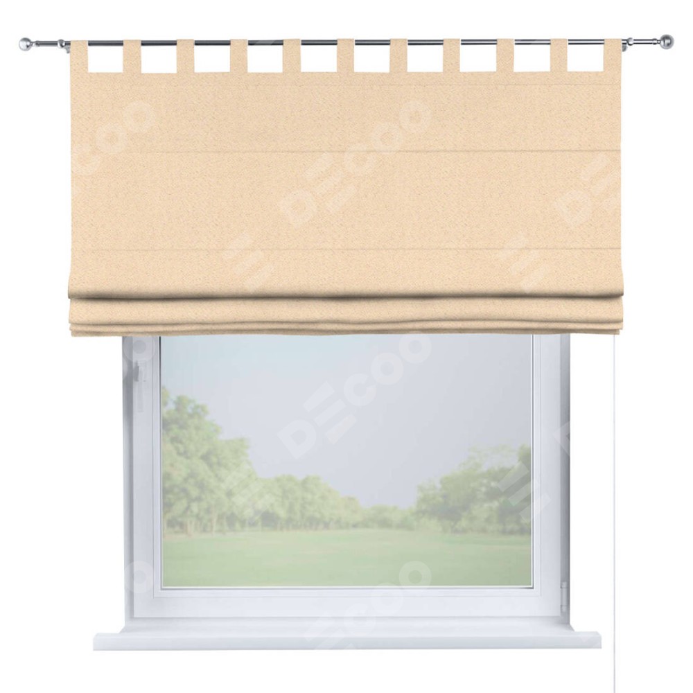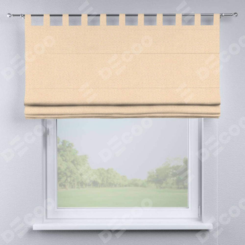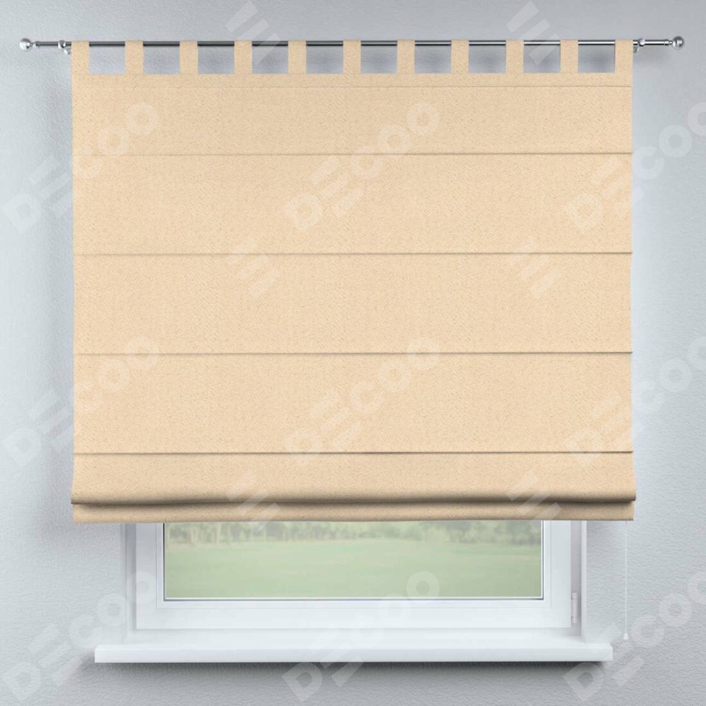 Римская штора производителя «Cortin», используется для проёма, пошита из ткани блэкаут тиснение с блеском бежевый, артикул ткани 34627. Изнаночная сторона материала черного цвета, что обеспечивает необходимую светонепроницаемость. Данная модель пошита на петлях, комплектуется на выбор круглым карнизом и подходит для монтажа на стену. Римская штора на петлях имеет простую систему регулировки высоты, отличительным преимуществом данной модели является простой способ монтажа. Достаточно повесить ее на трубу и штора готова!