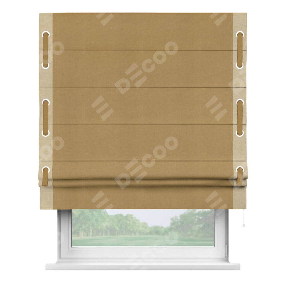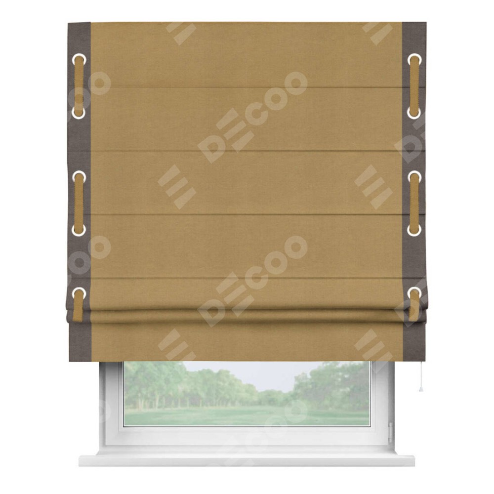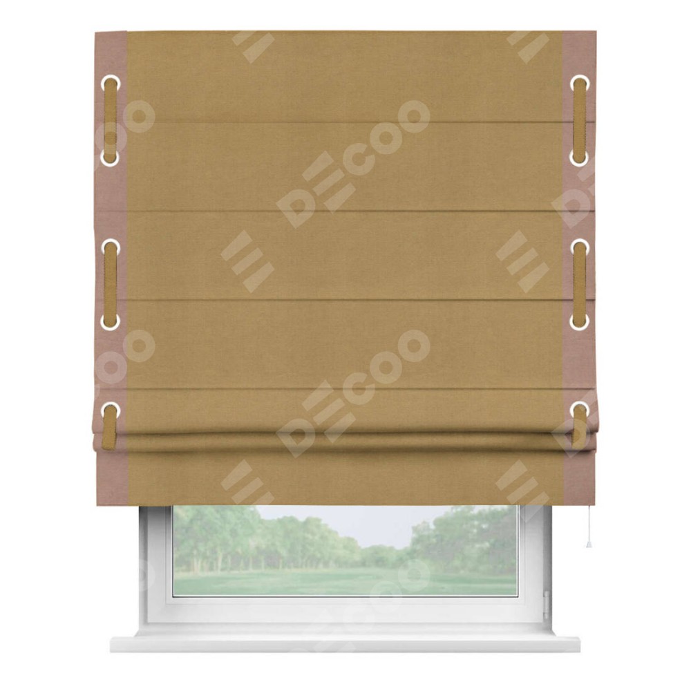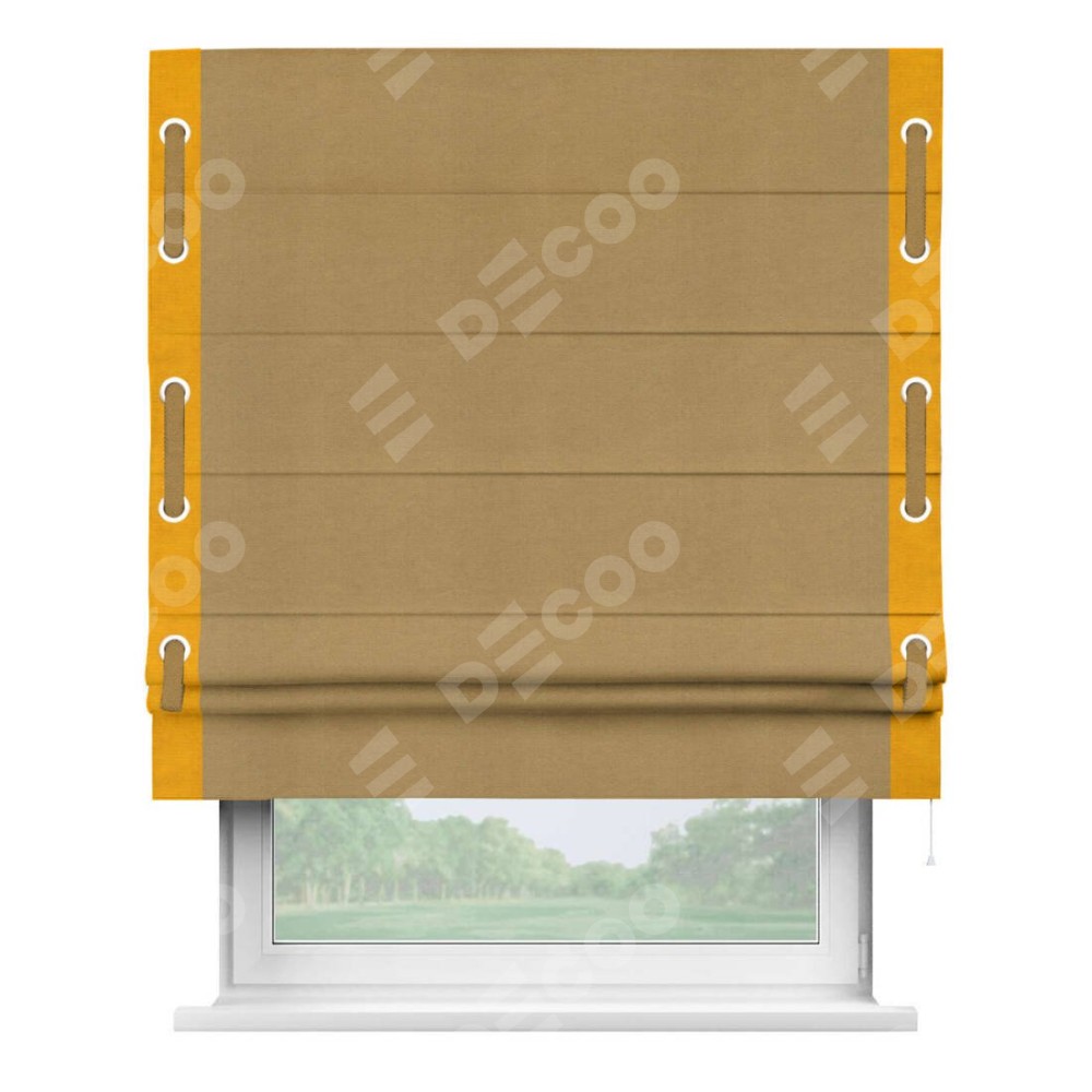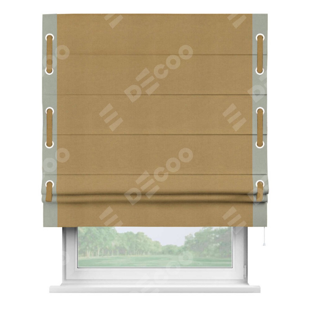 Римская штора производителя «Cortin», используется для проёма, пошита из ткани вельвет горчица, артикул ткани 17760. Отделка шторы кантом «Стрим Дуо» на кантах расположены люверсы с пояском, ткань для канта используется из вельвета разной расцветки на выбор. Ткань для пояска обычно используется из основной ткани шторы, а так же можно сделать из любой расцветки по желанию. Имеет универсальный механизм и подходит для монтажа: на потолок, на стену и в нишу.