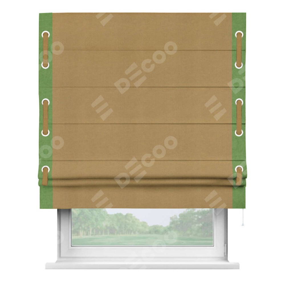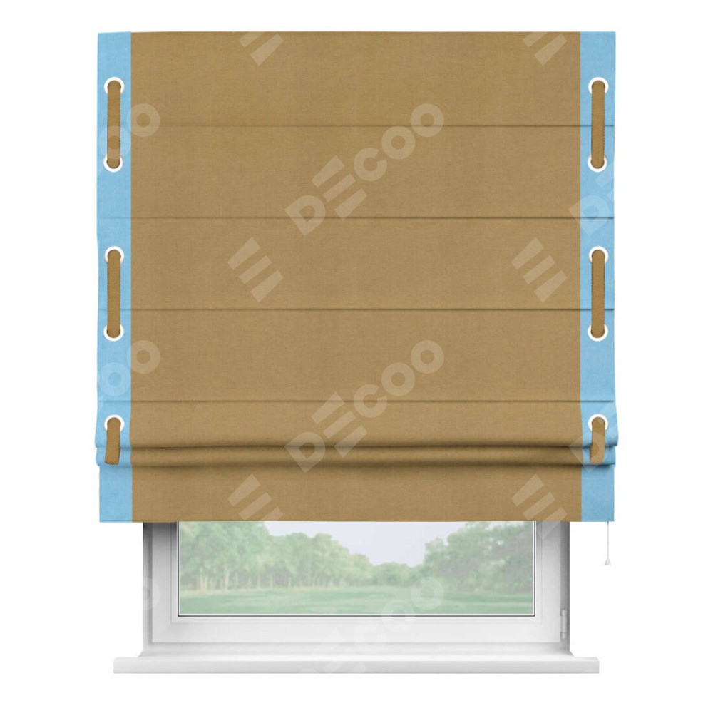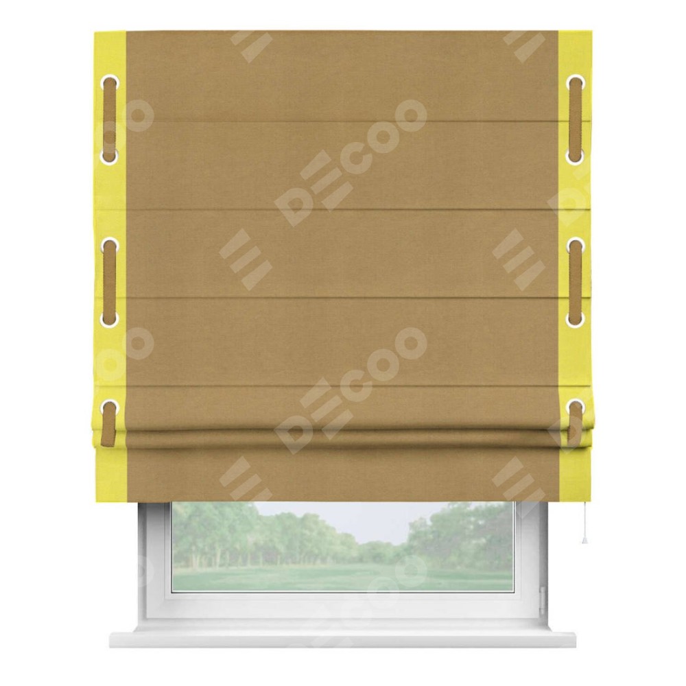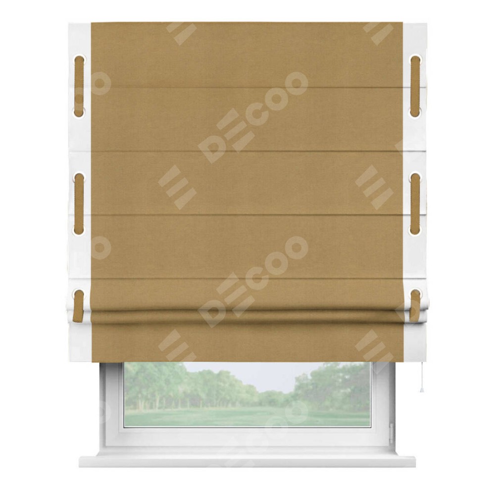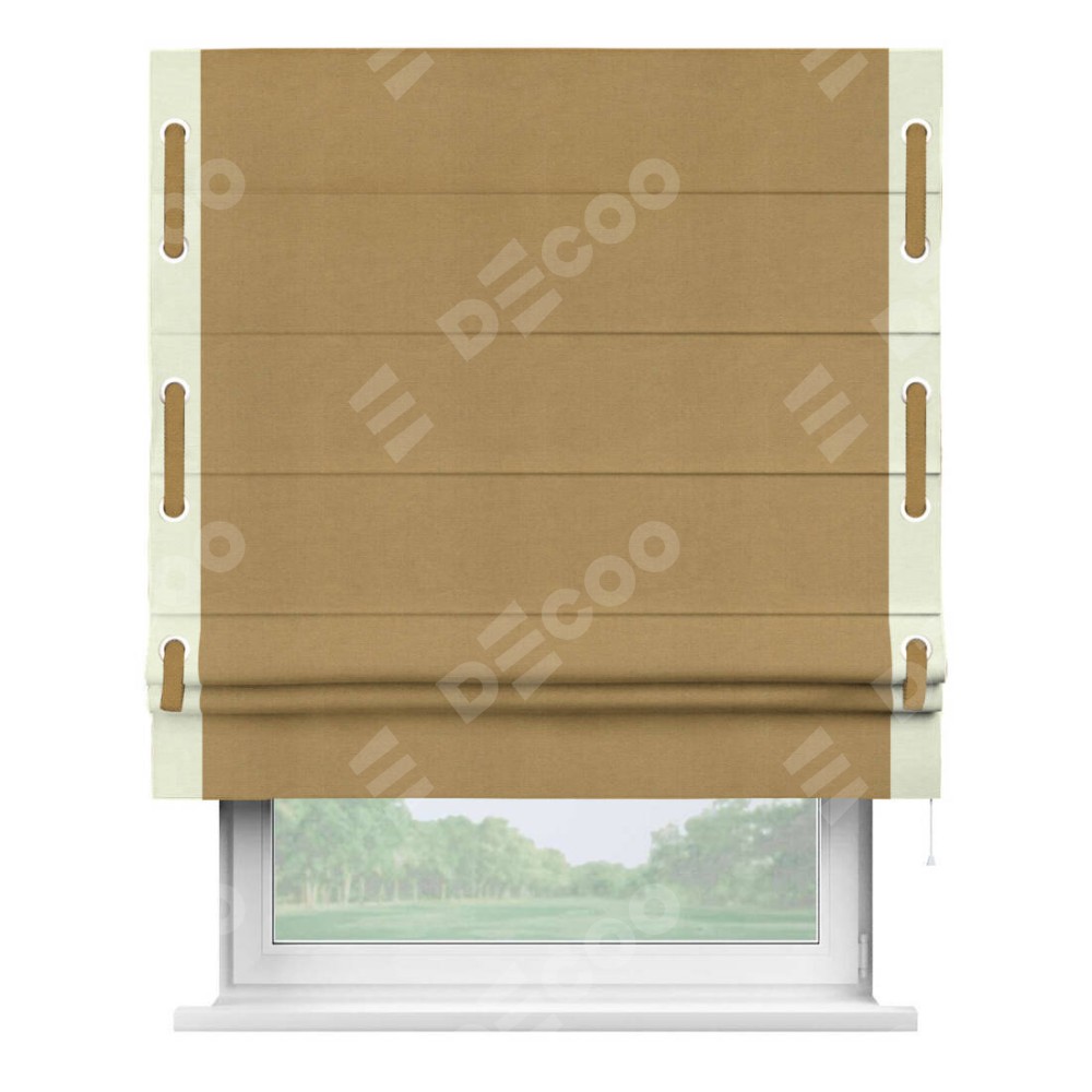 Римская штора производителя «Cortin», используется для проёма, пошита из ткани вельвет горчица, артикул ткани 17760. Отделка шторы кантом «Стрим Дуо» на кантах расположены люверсы с пояском, ткань для канта используется из вельвета разной расцветки на выбор. Ткань для пояска обычно используется из основной ткани шторы, а так же можно сделать из любой расцветки по желанию. Имеет универсальный механизм и подходит для монтажа: на потолок, на стену и в нишу.
