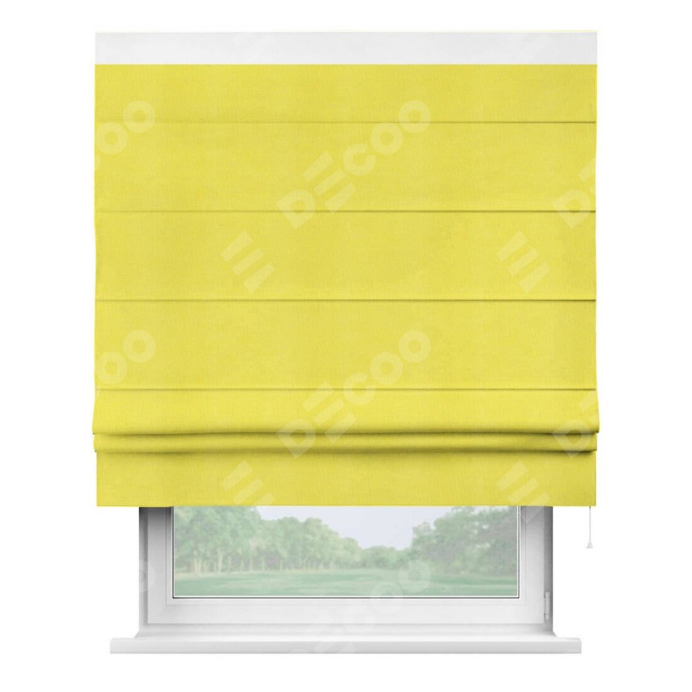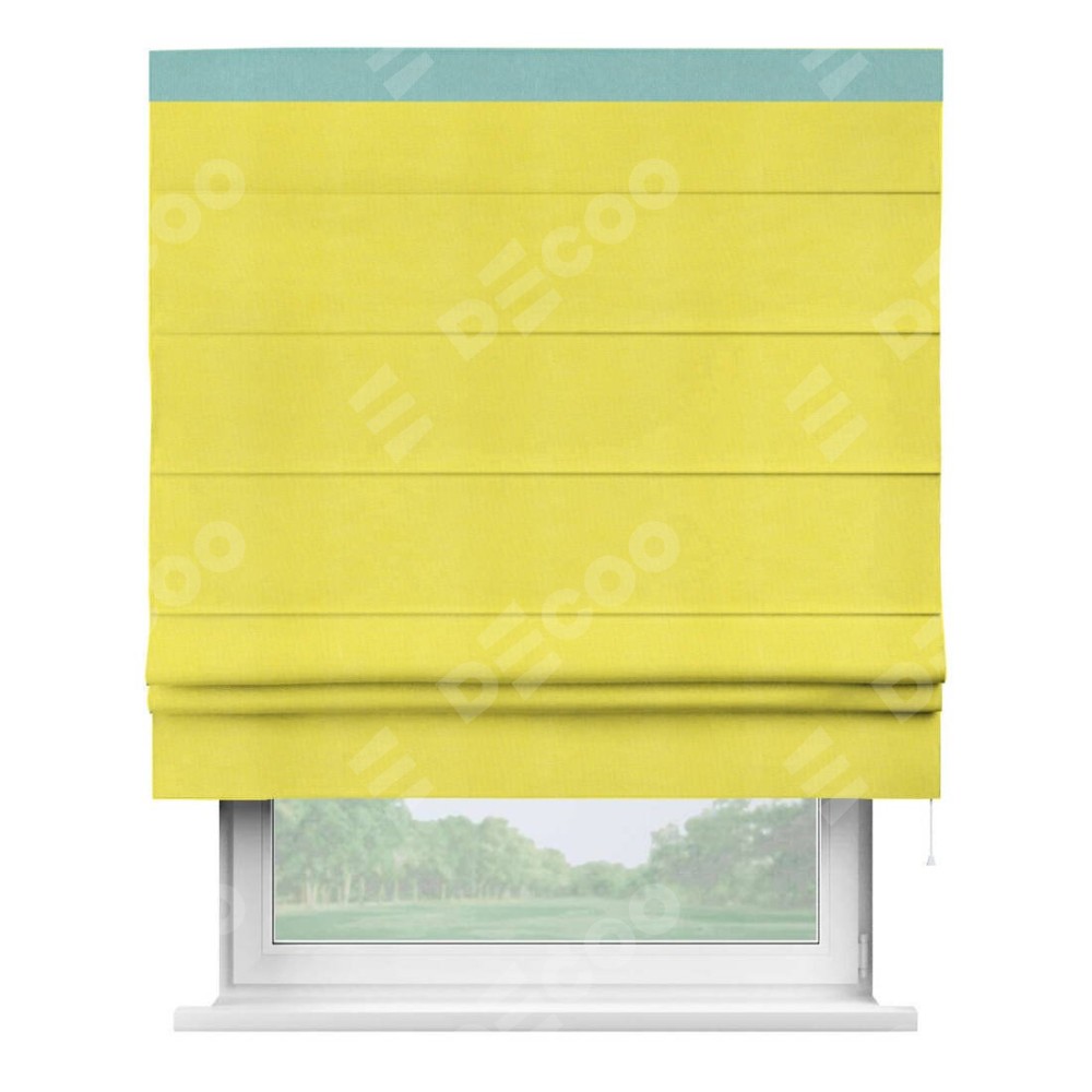 Римская штора производителя «Cortin», используется для проёма, пошита из ткани вельвет cветло-желтый, артикул ткани 30997. Отделка шторы кантом «Кинг», ткань для канта используется из вельвета разной расцветки на выбор. Имеет универсальный механизм и подходит для монтажа: на потолок, на стену и в нишу.