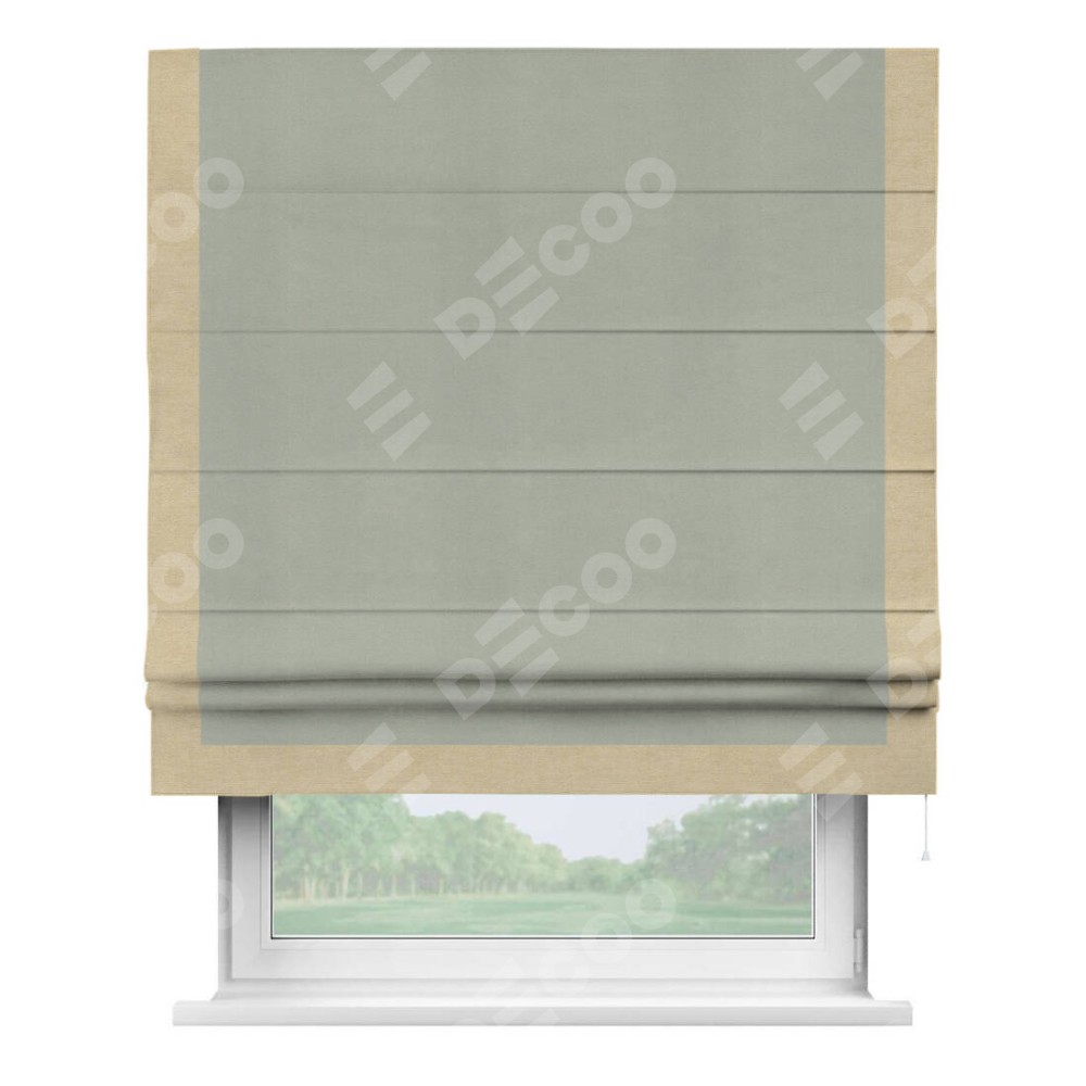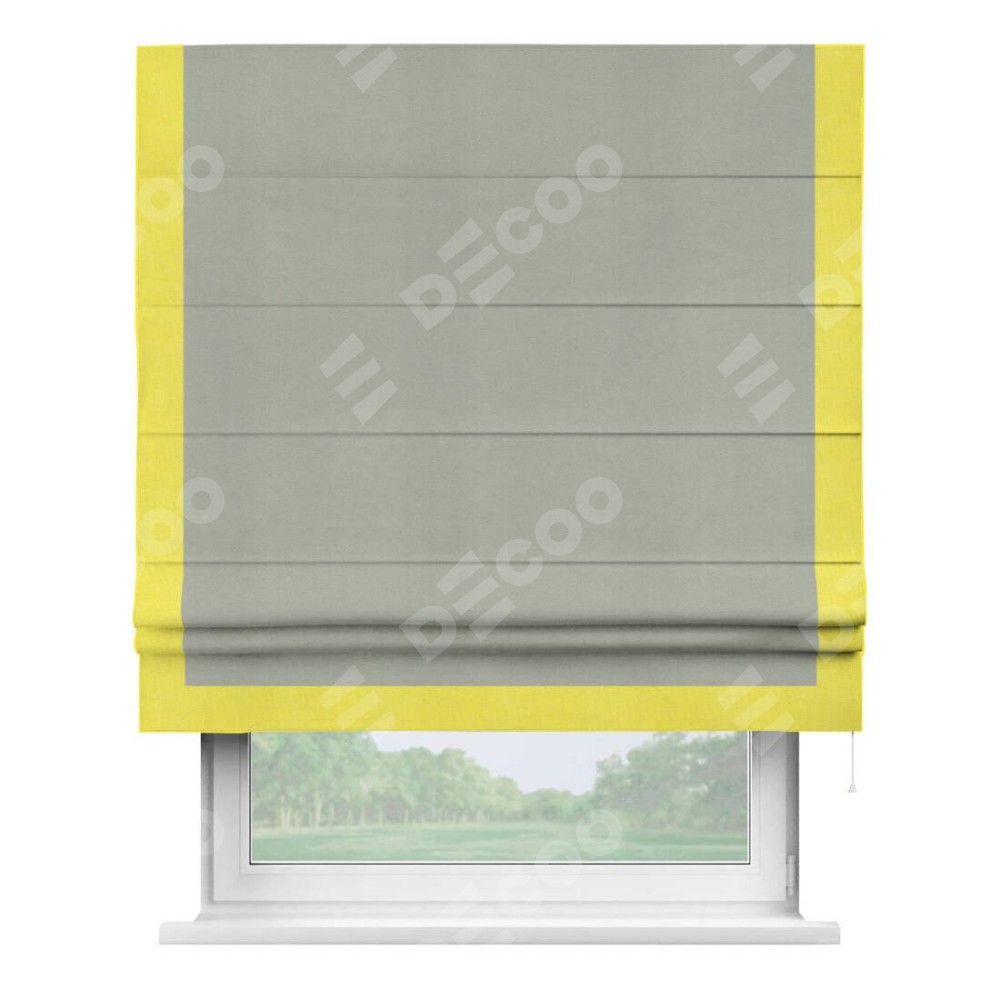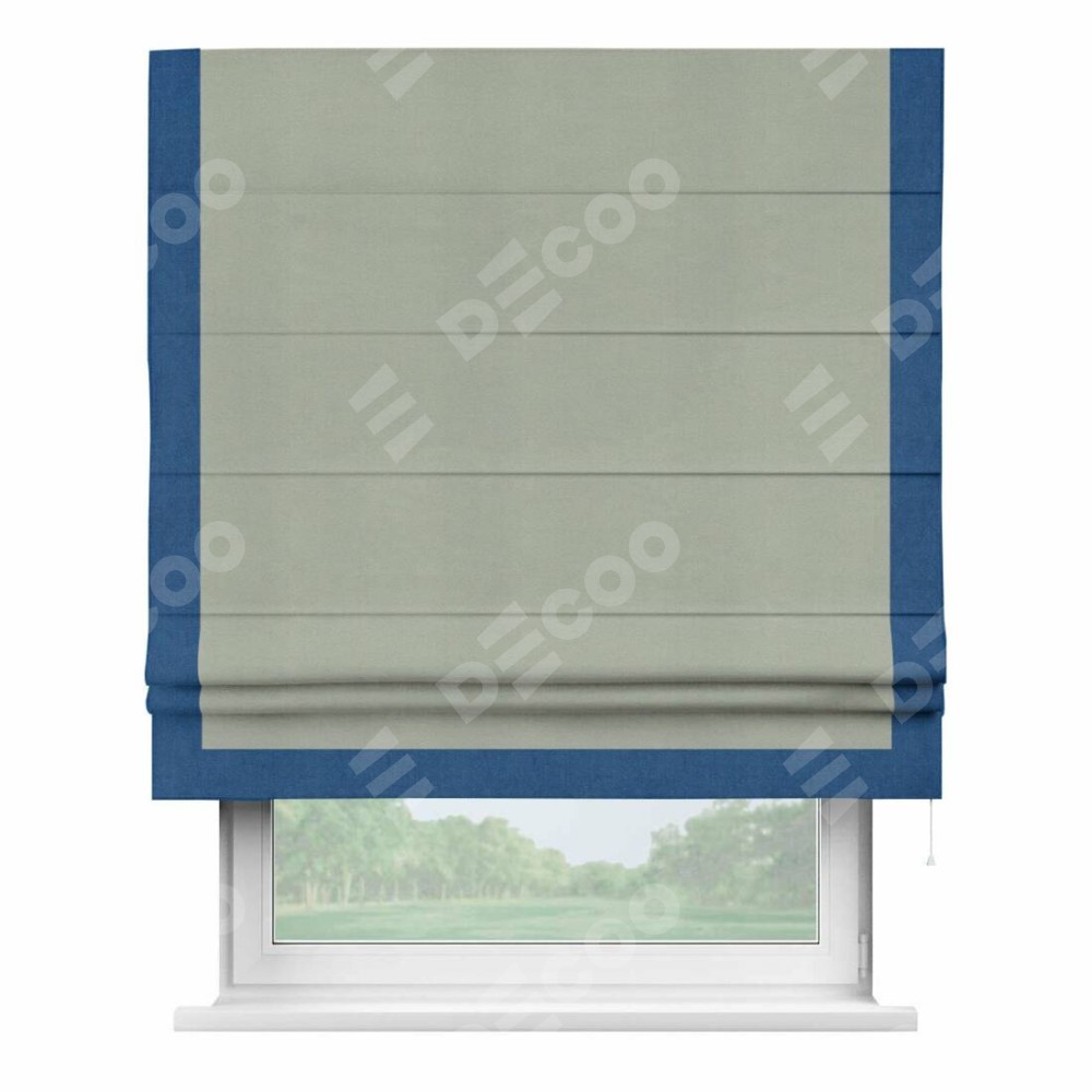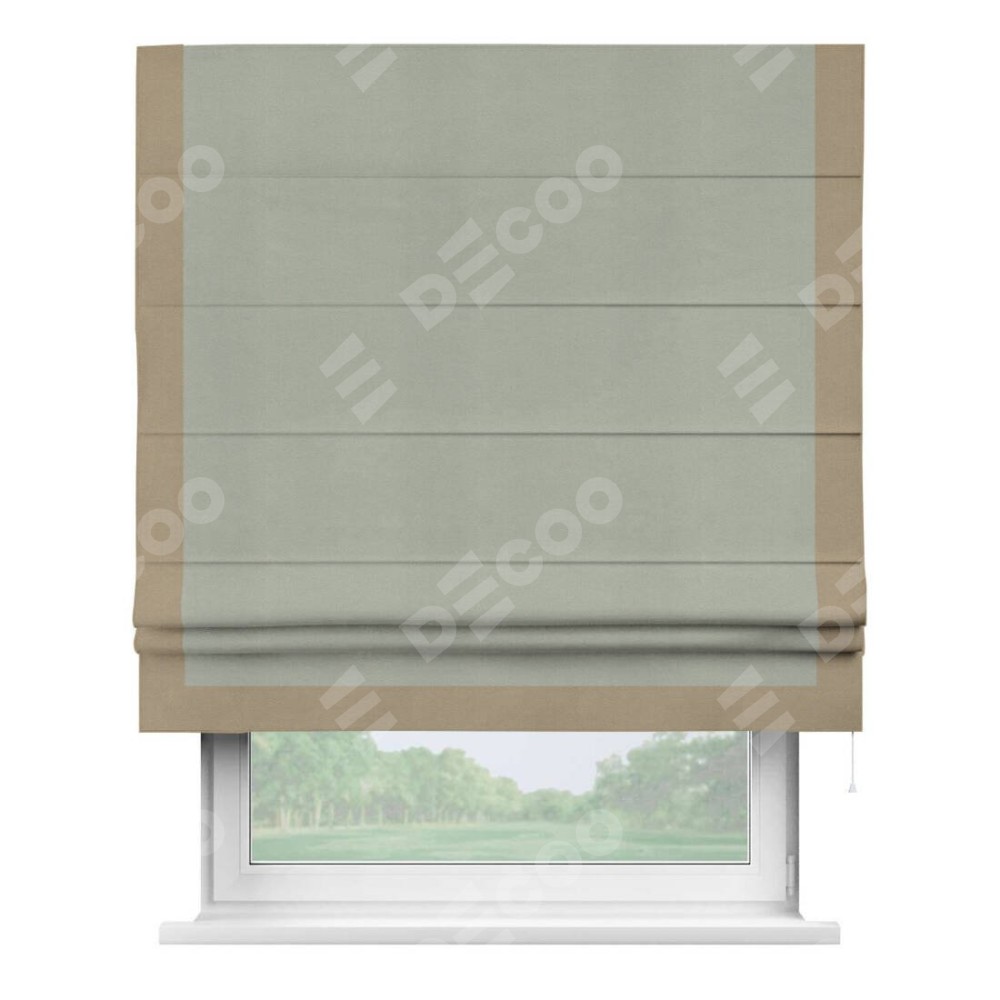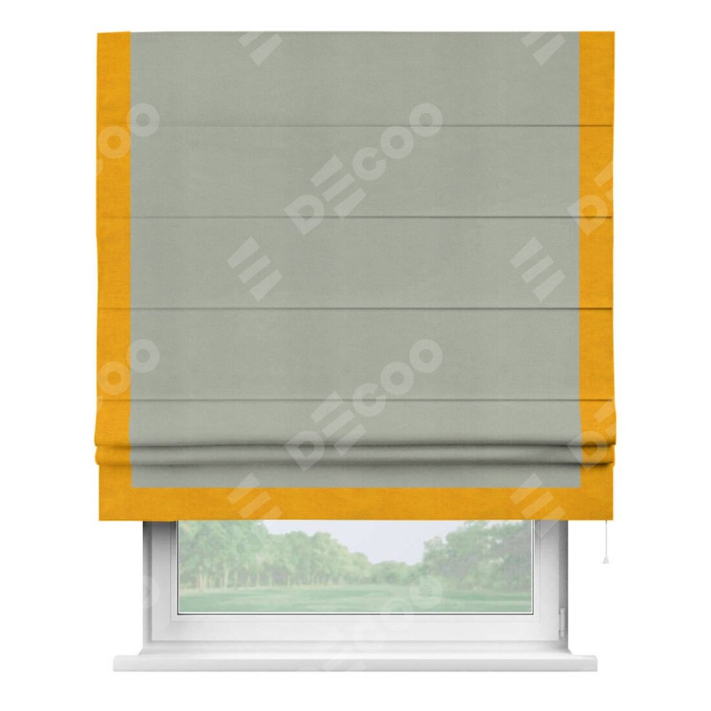 Римская штора производителя «Cortin», используется для проёма, пошита из ткани вельвет cветло-серый, артикул ткани 30981. Отделка шторы кантом «Виктория», ткань для канта используется из вельвета разной расцветки на выбор. Имеет универсальный механизм и подходит для монтажа: на потолок, на стену и в нишу.