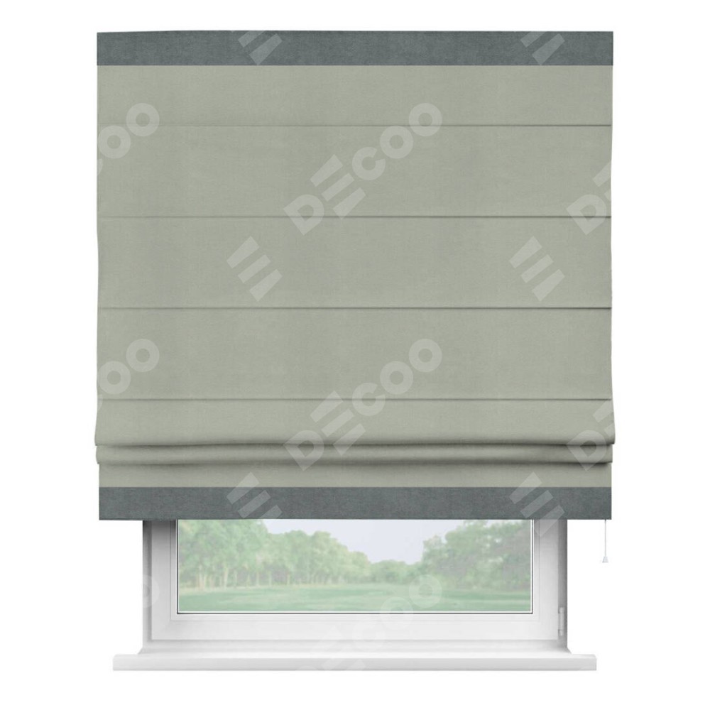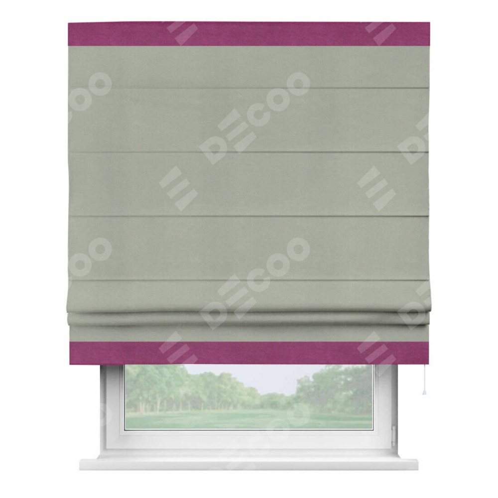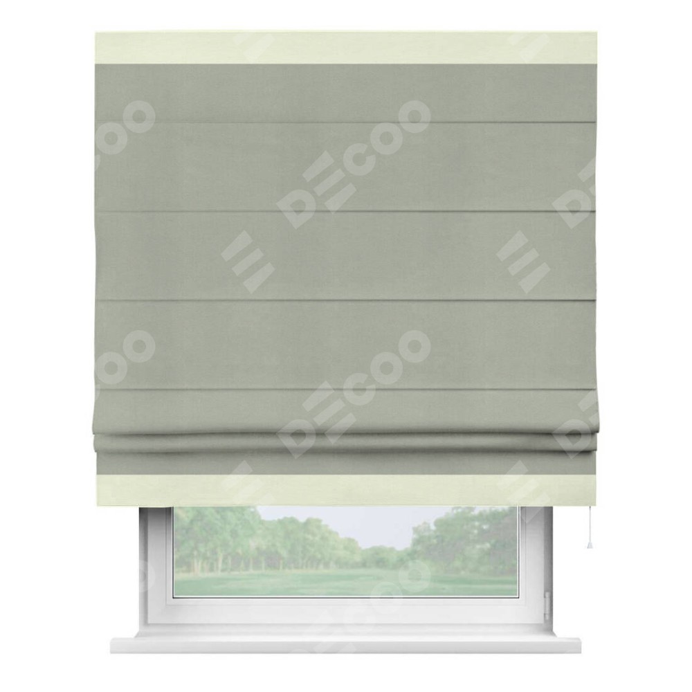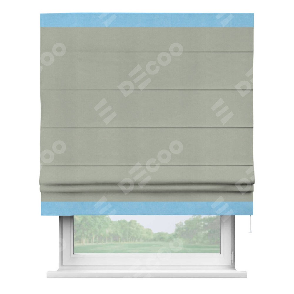 Римская штора производителя «Cortin», используется для проёма, пошита из ткани вельвет cветло-серый, артикул ткани 30981. Отделка шторы кантом «Горизонт», ткань для канта используется из вельвета разной расцветки на выбор. Имеет универсальный механизм и подходит для монтажа: на потолок, на стену и в нишу.