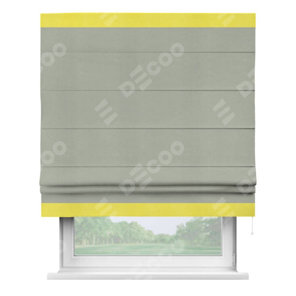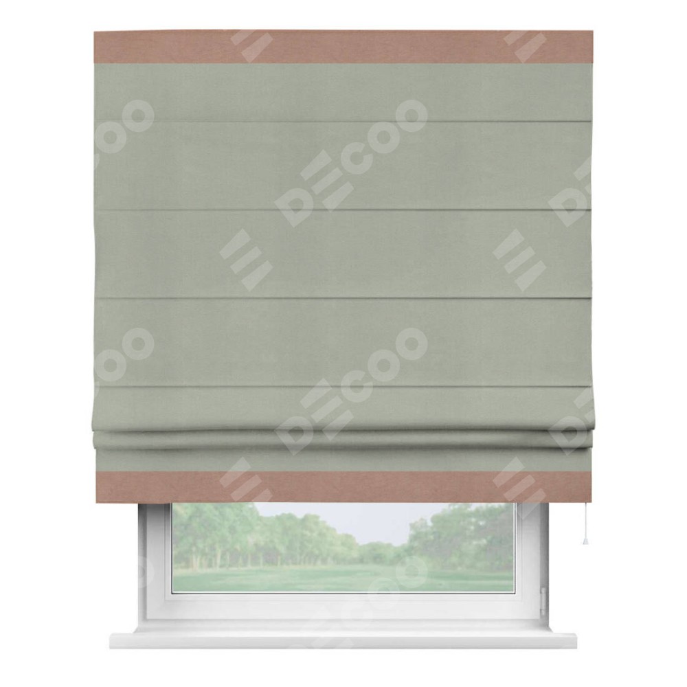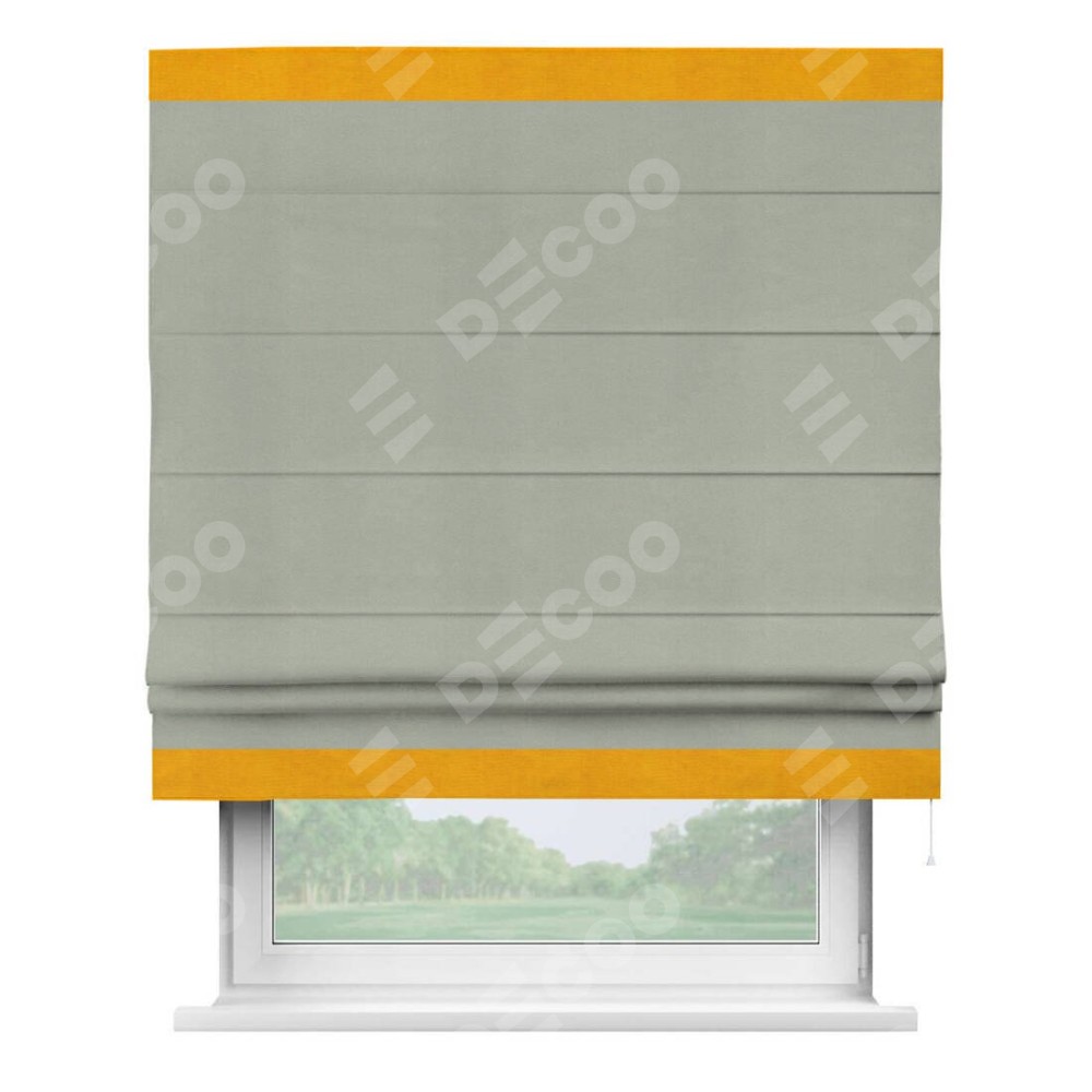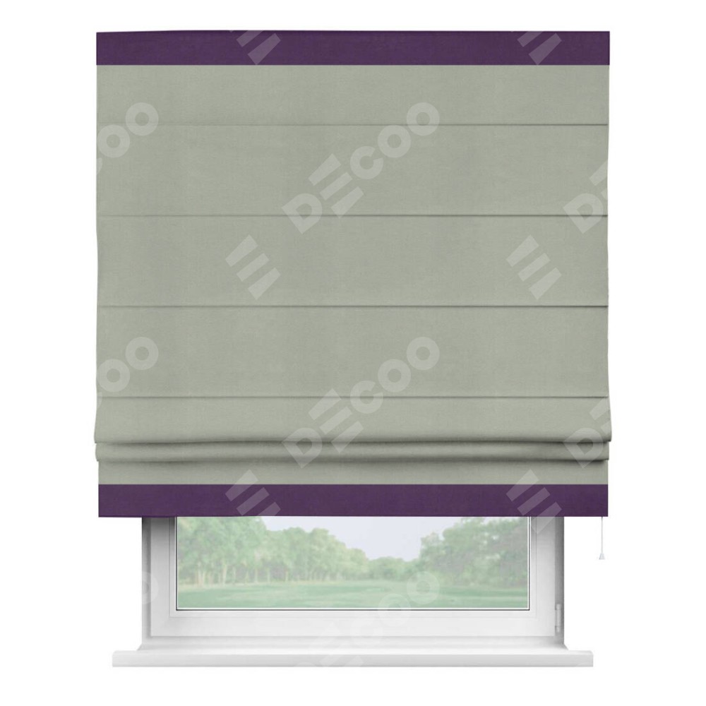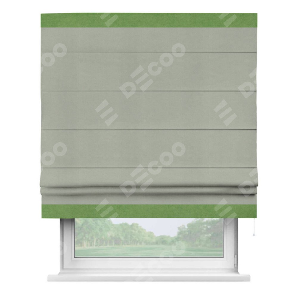 Римская штора производителя «Cortin», используется для проёма, пошита из ткани вельвет cветло-серый, артикул ткани 30981. Отделка шторы кантом «Горизонт», ткань для канта используется из вельвета разной расцветки на выбор. Имеет универсальный механизм и подходит для монтажа: на потолок, на стену и в нишу.