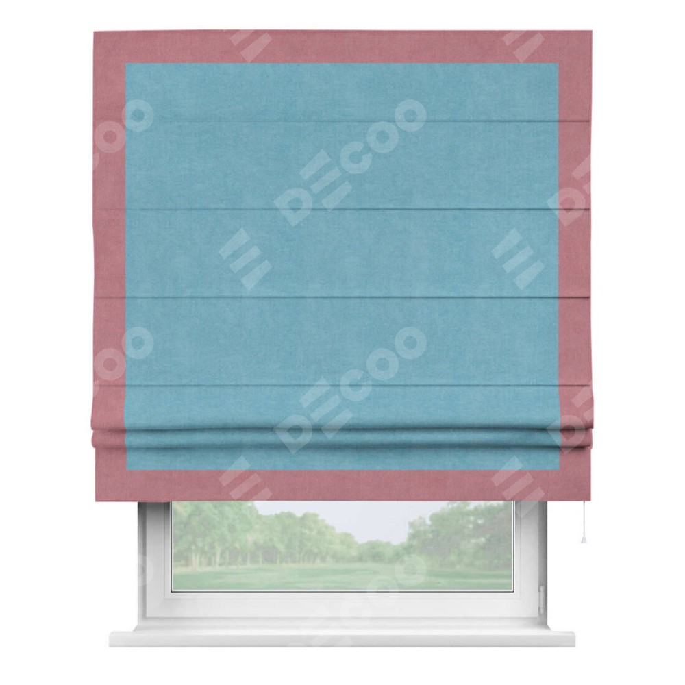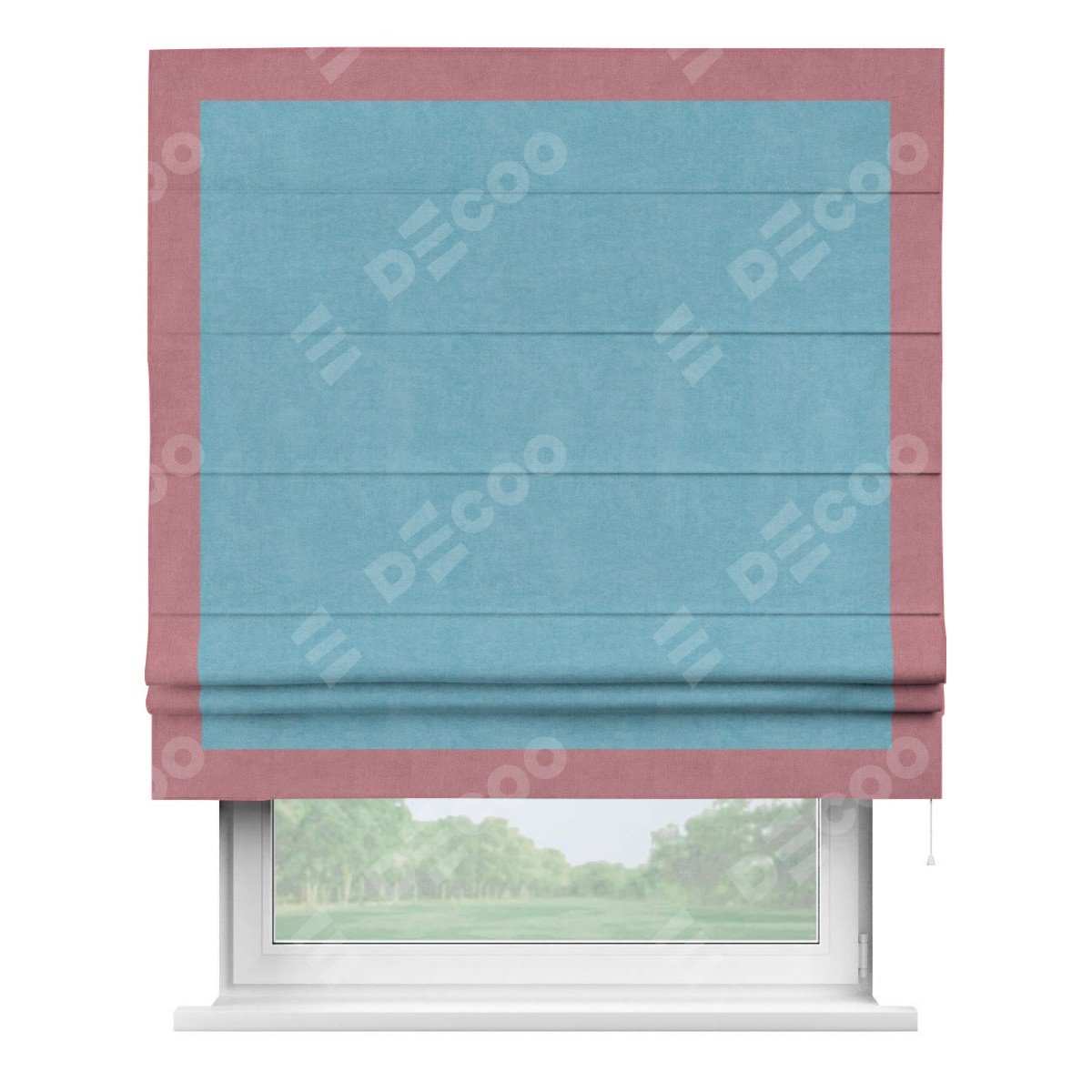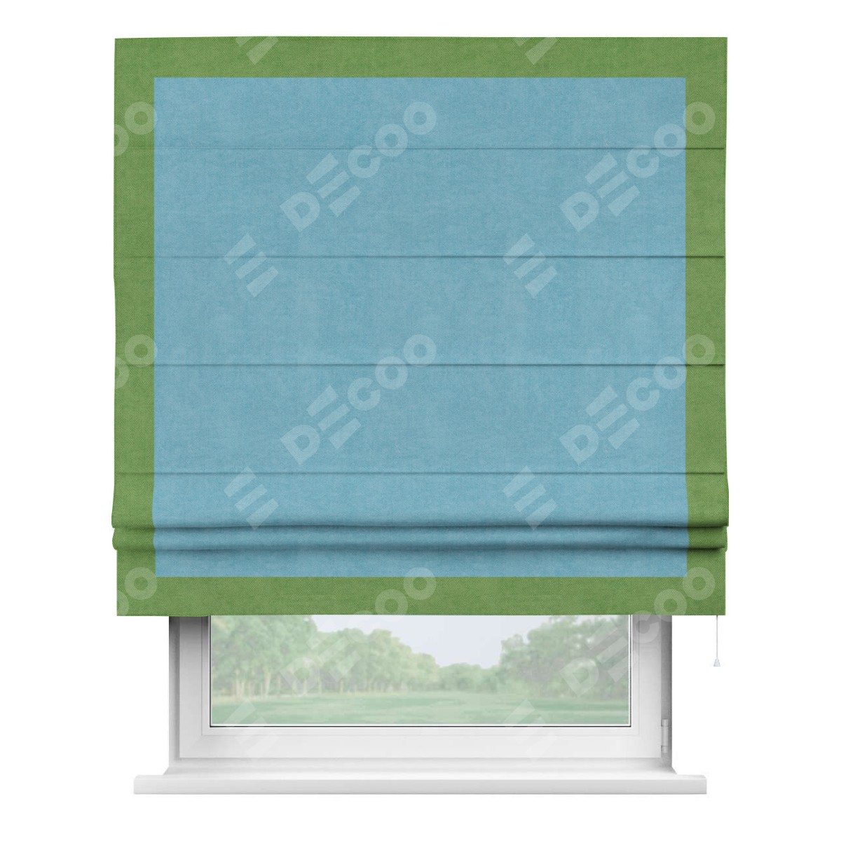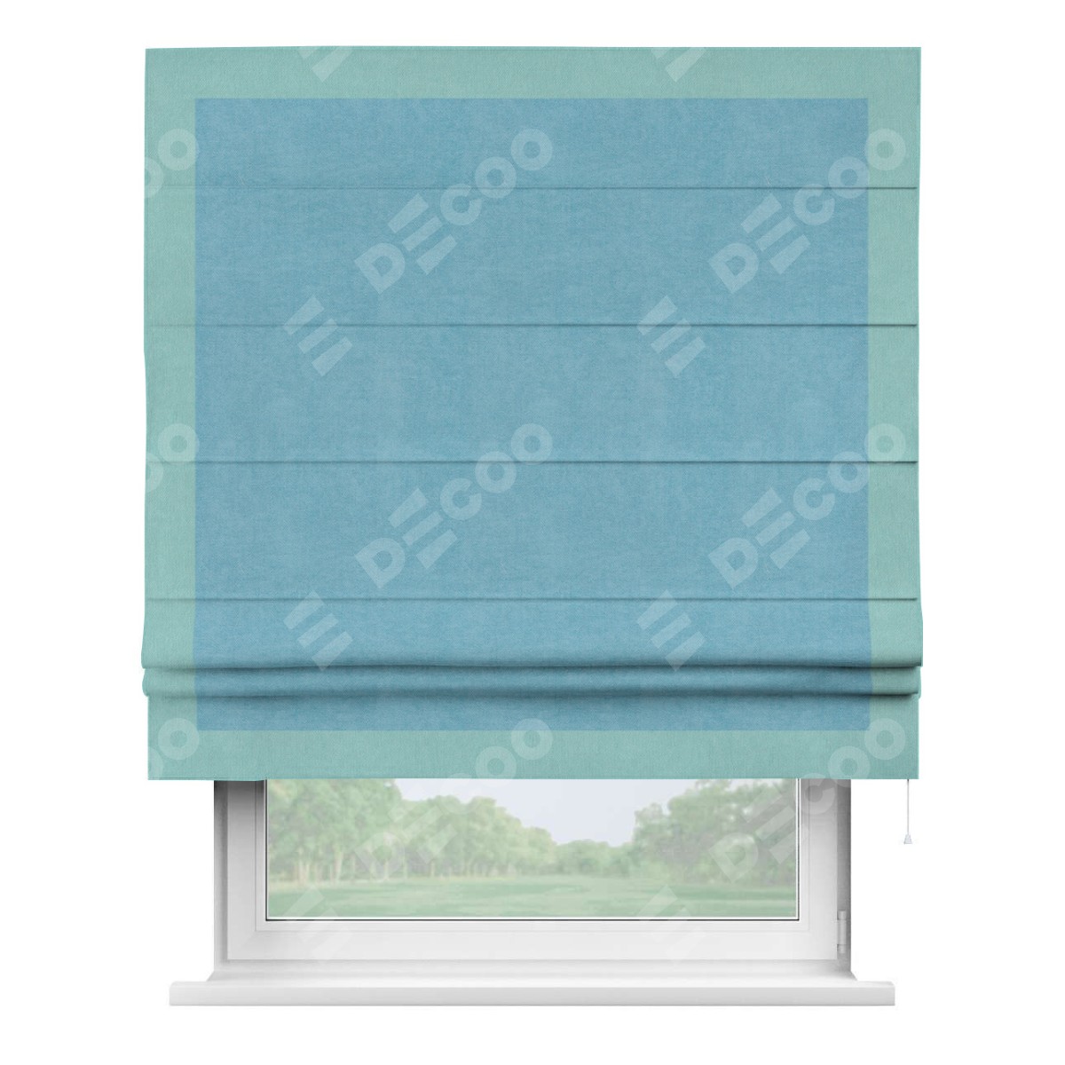 Римская штора производителя «Cortin», используется для проёма, пошита из ткани вельвет ментоловый, артикул ткани 10443. Отделка шторы кантом «Чесс», ткань для канта используется из вельвета разной расцветки на выбор. Имеет универсальный механизм и подходит для монтажа: на потолок, на стену и в нишу.