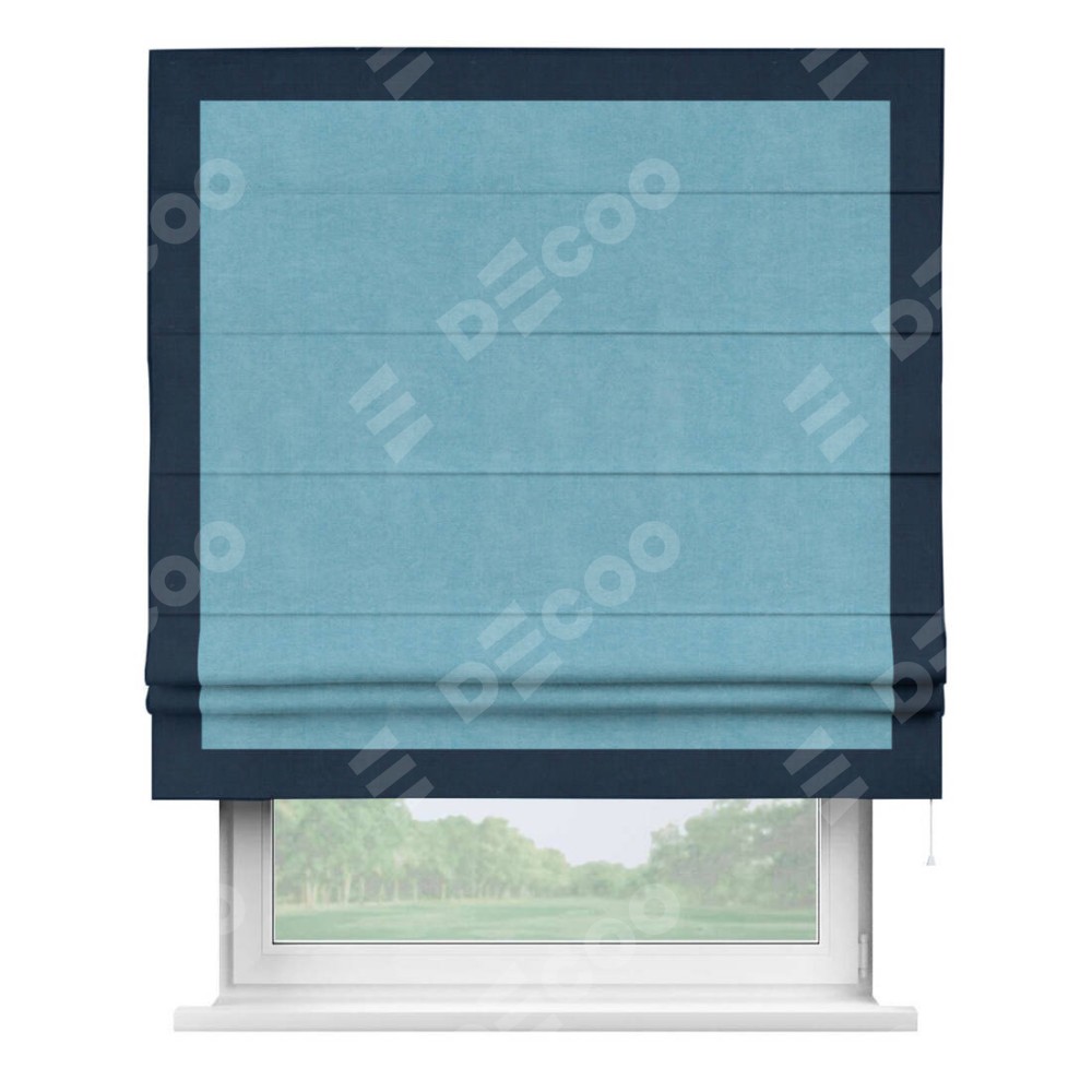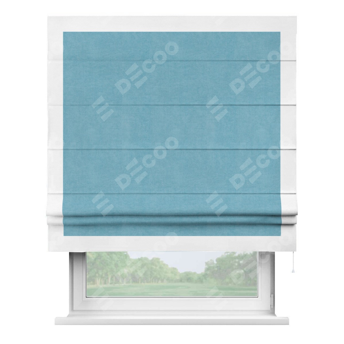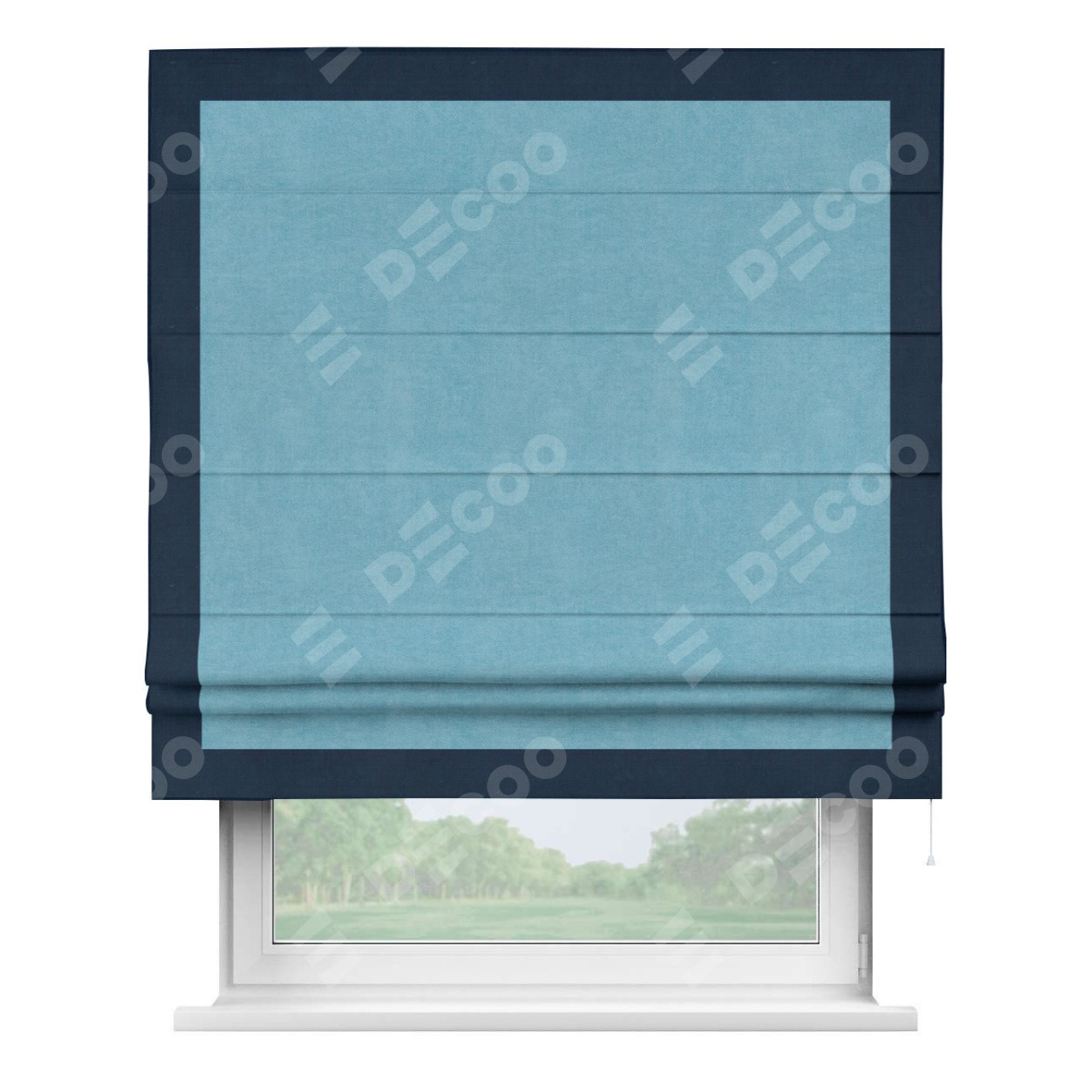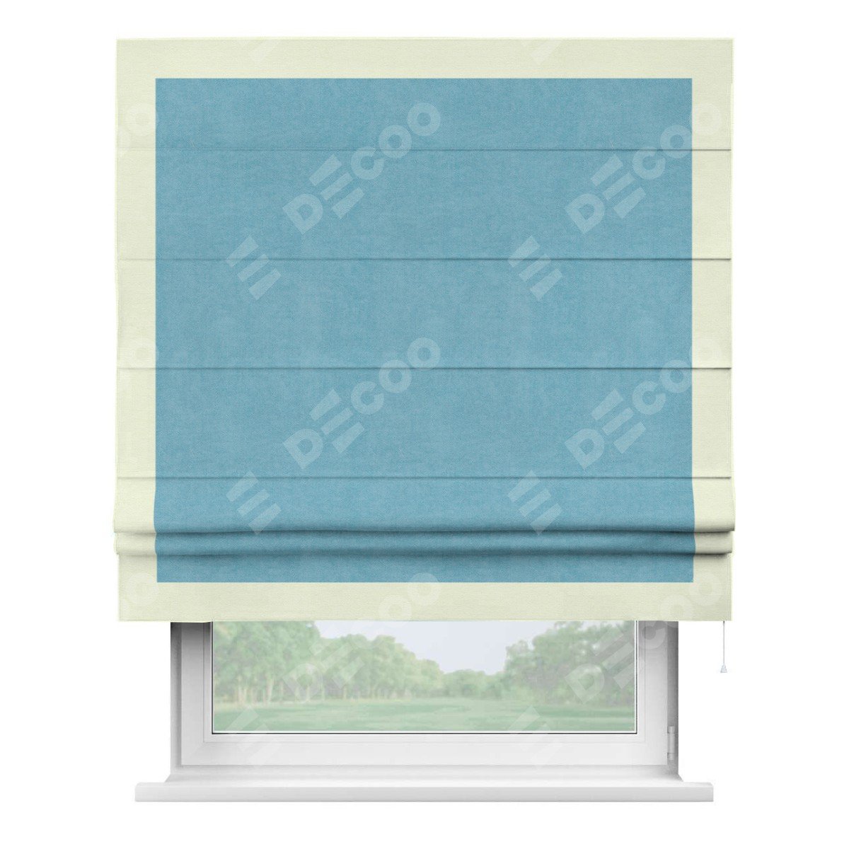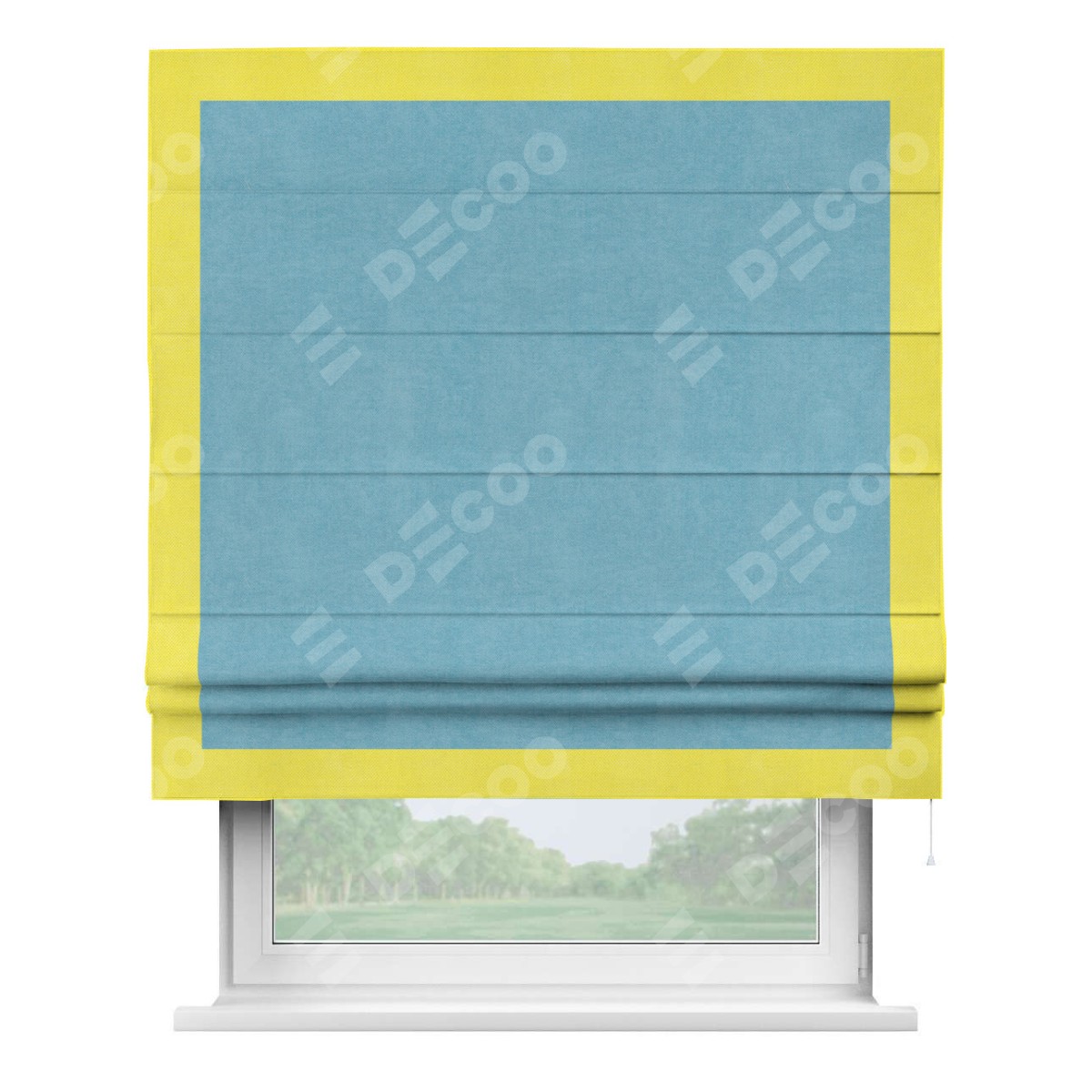 Римская штора производителя «Cortin», используется для проёма, пошита из ткани вельвет ментоловый, артикул ткани 10443. Отделка шторы кантом «Чесс», ткань для канта используется из вельвета разной расцветки на выбор. Имеет универсальный механизм и подходит для монтажа: на потолок, на стену и в нишу.