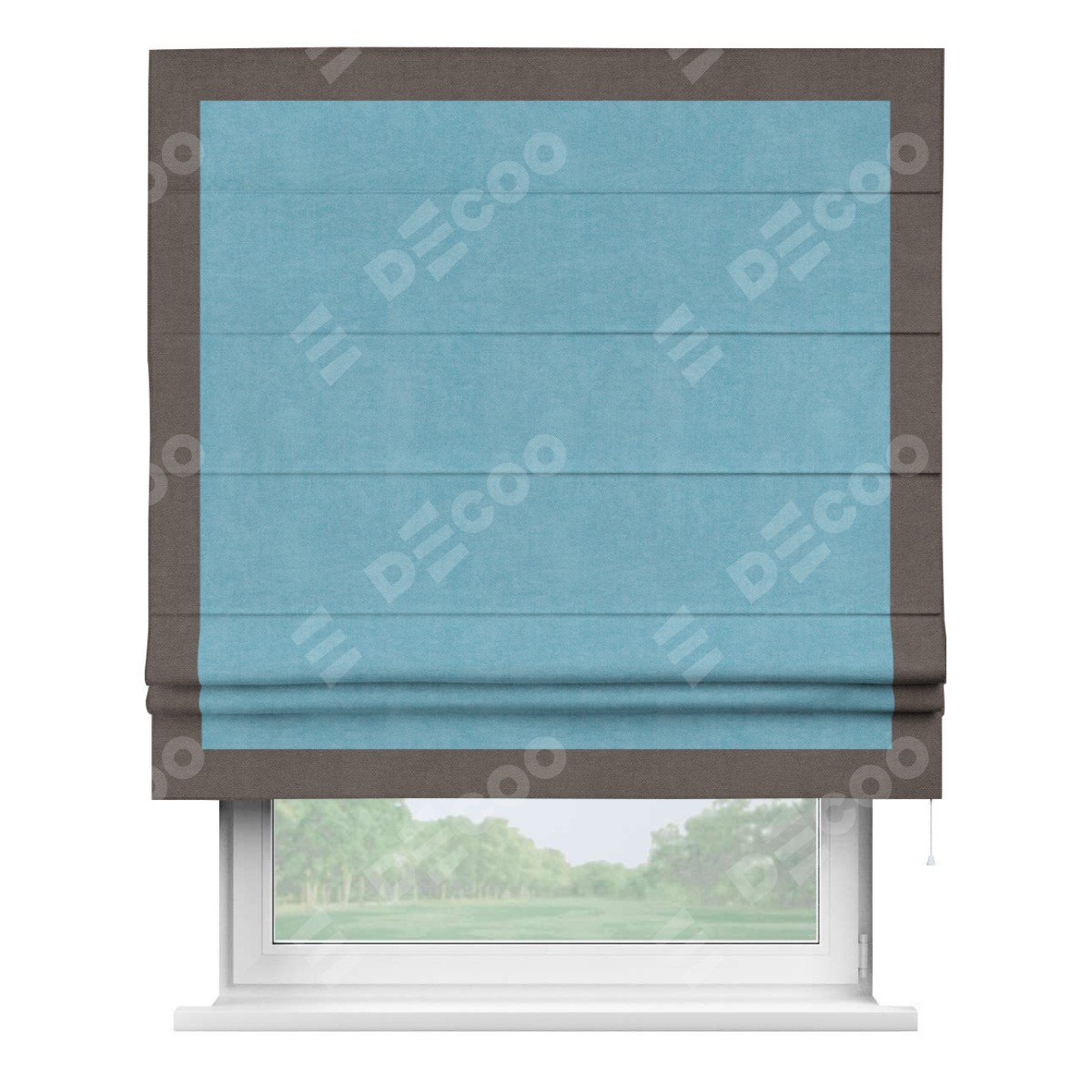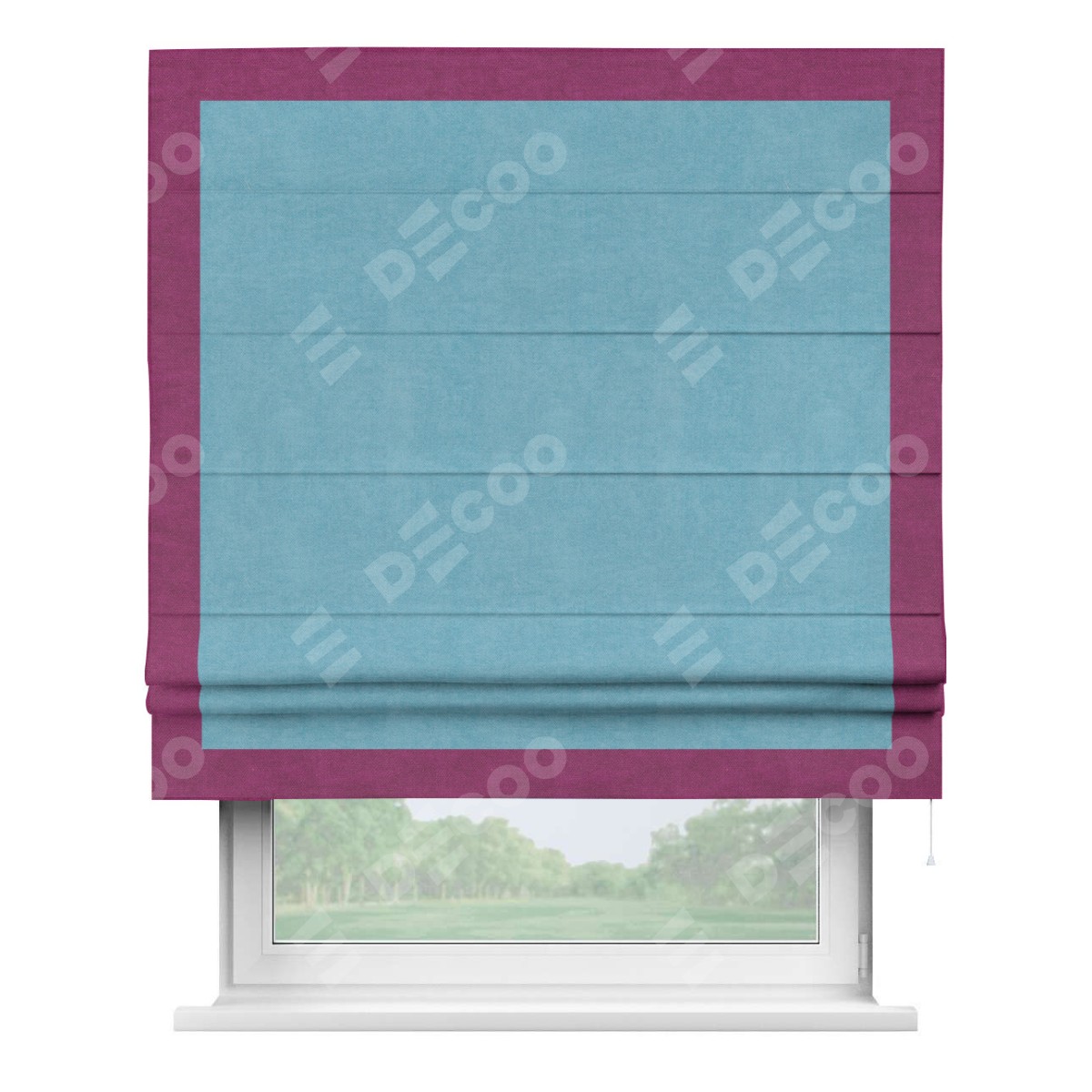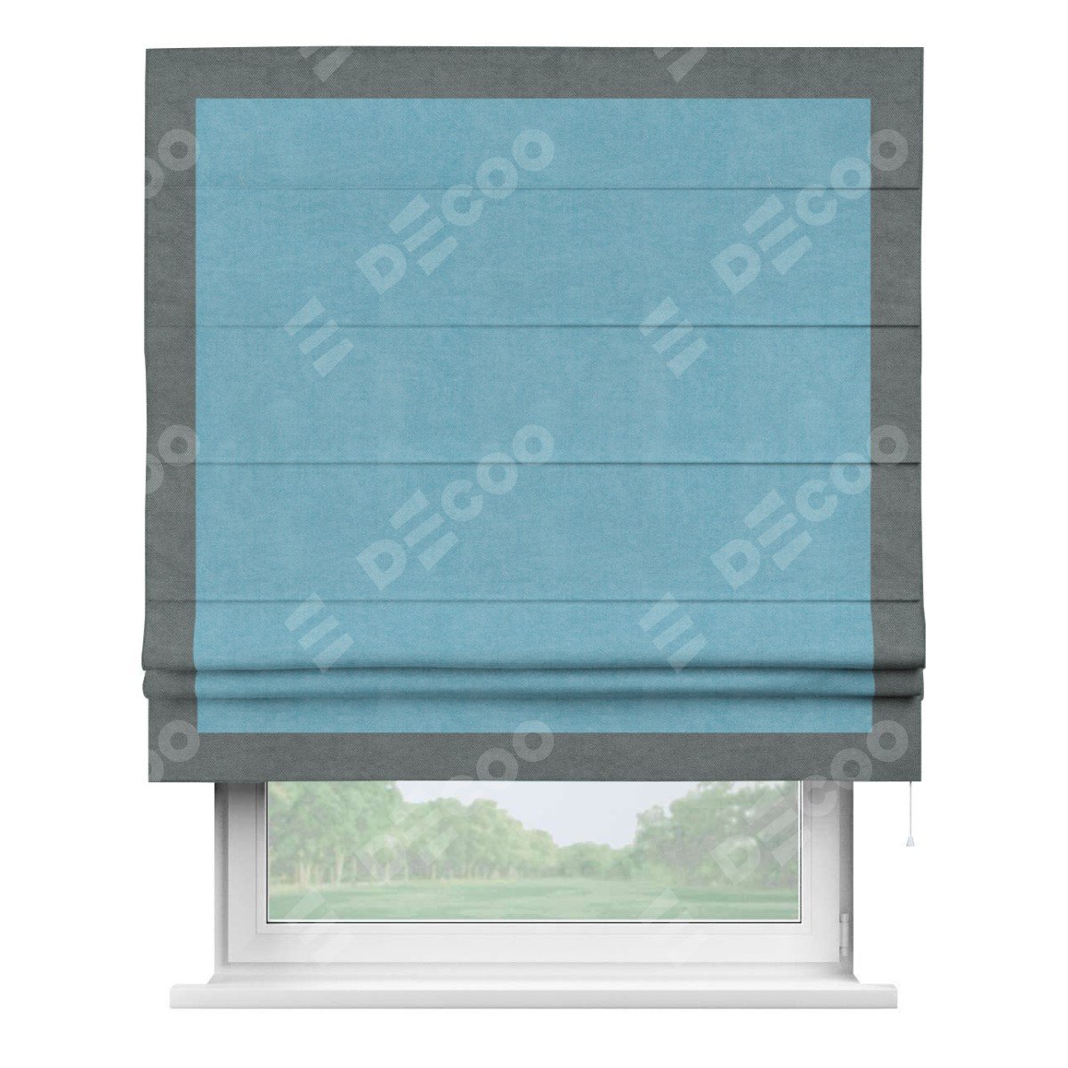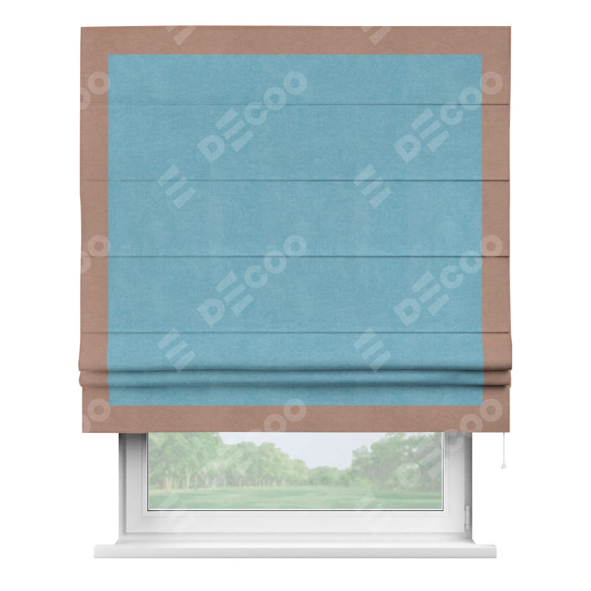 Римская штора производителя «Cortin», используется для проёма, пошита из ткани вельвет ментоловый, артикул ткани 10443. Отделка шторы кантом «Чесс», ткань для канта используется из вельвета разной расцветки на выбор. Имеет универсальный механизм и подходит для монтажа: на потолок, на стену и в нишу.