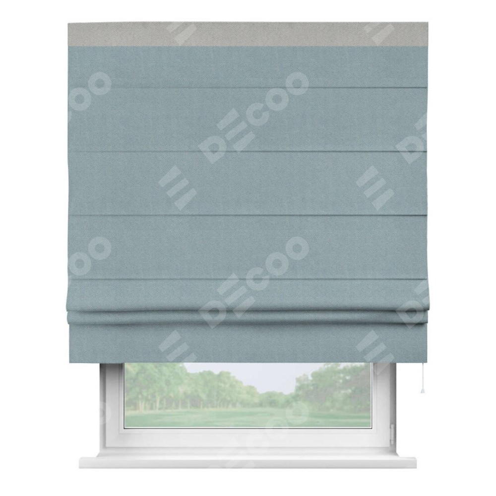 Римская штора производителя «Cortin», используется для проёма, пошита из ткани блэкаут с блеском синий, артикул 34625. Отделка шторы кантом «Кинг», ткань для канта используется из блэкаута с блеском разной расцветки на выбор. Изнаночная сторона материала черного цвета, что обеспечивает необходимую светонепроницаемость. Имеет универсальный механизм и подходит для монтажа: на потолок, на стену и в нишу.