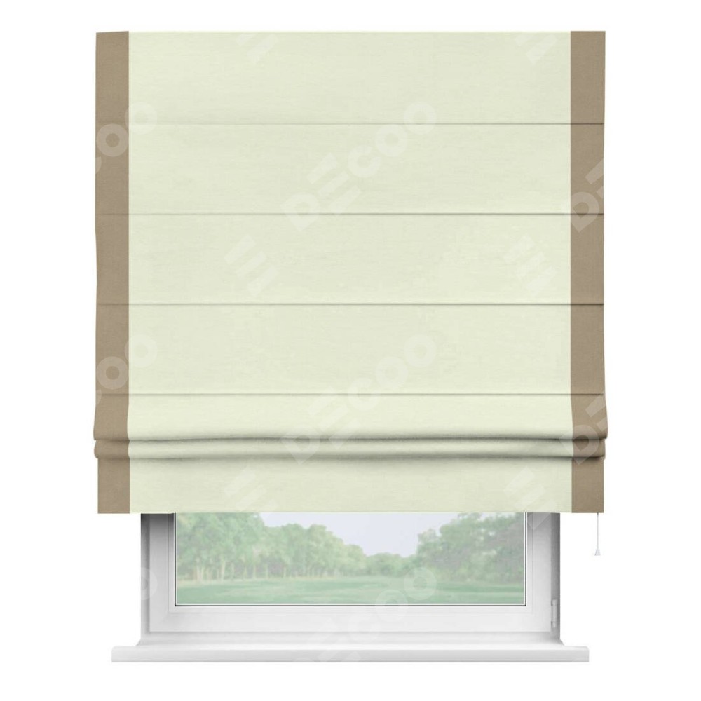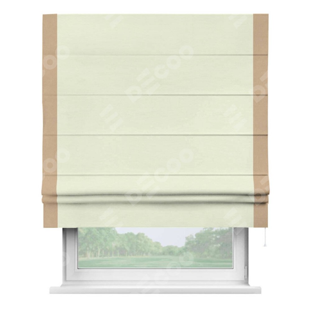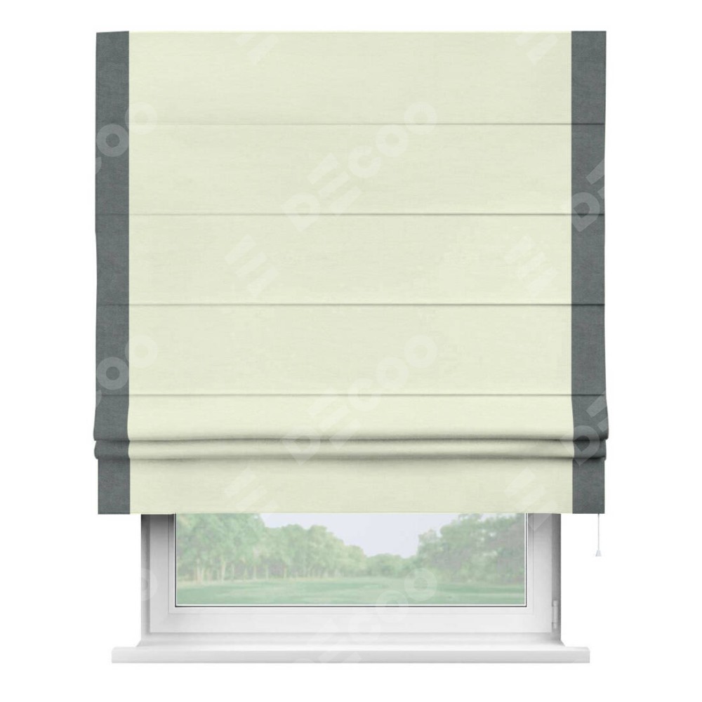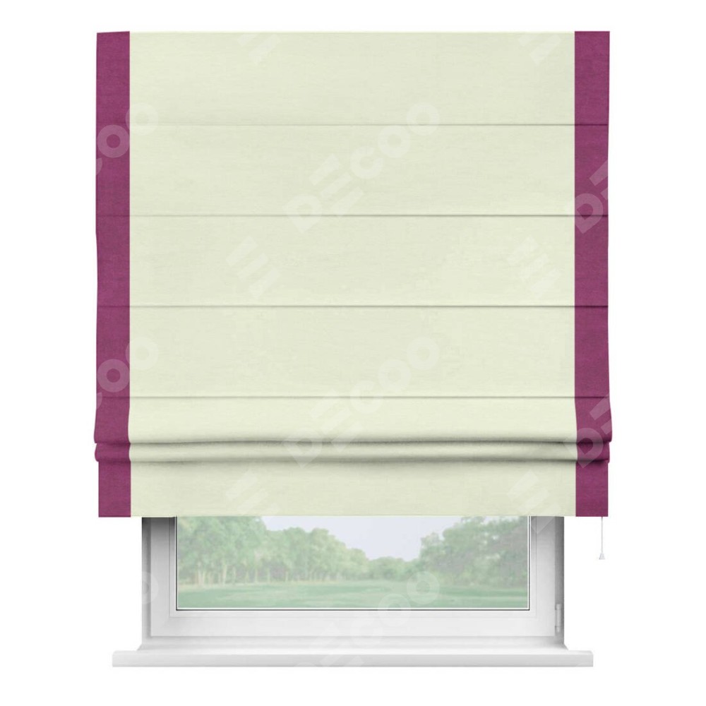 Римская штора производителя «Cortin», используется для проёма, пошита из ткани вельвет молочный, артикул ткани 85536. Отделка шторы кантом «Стрим Дуо», ткань для канта используется из вельвета разной расцветки на выбор. Имеет универсальный механизм и подходит для монтажа: на потолок, на стену и в нишу.