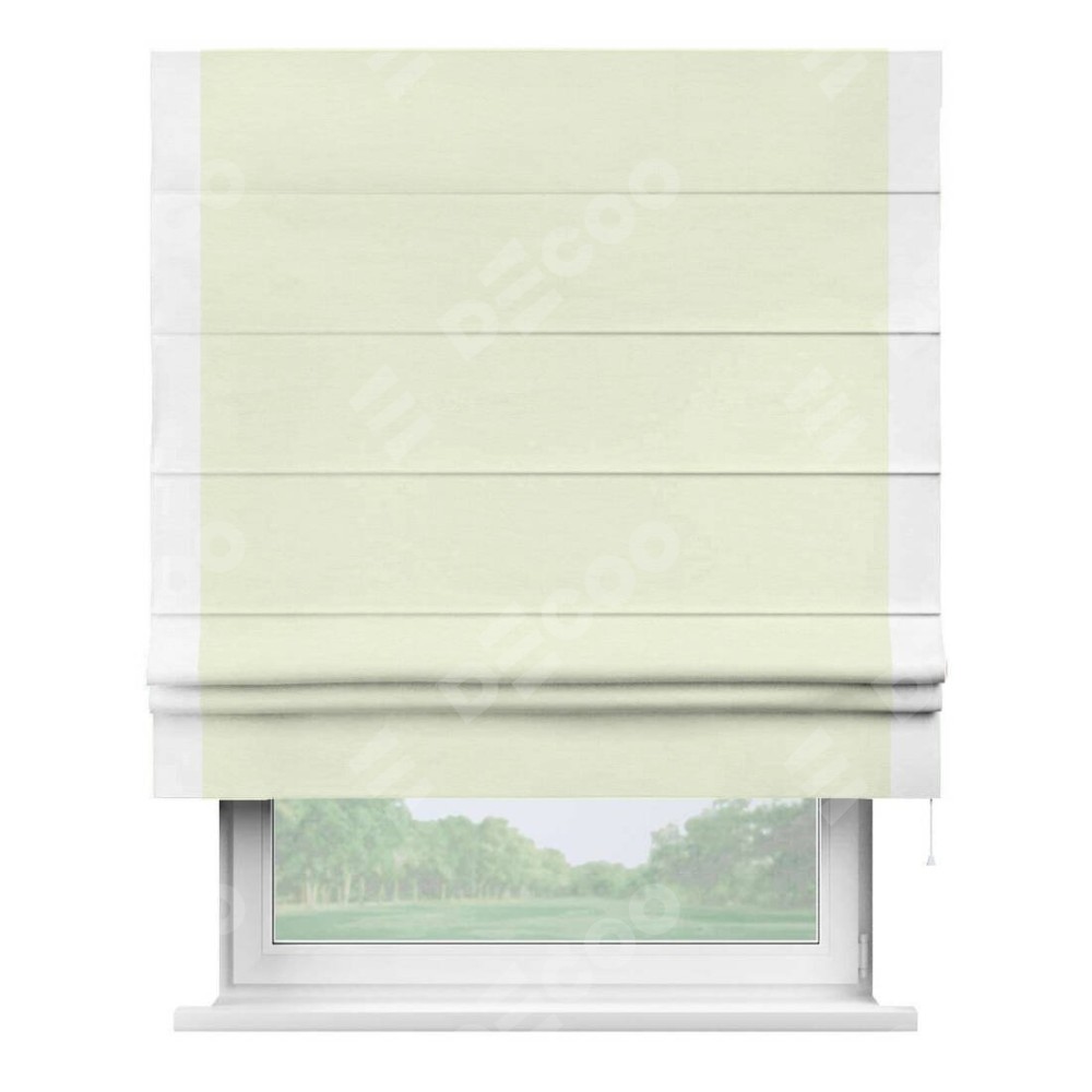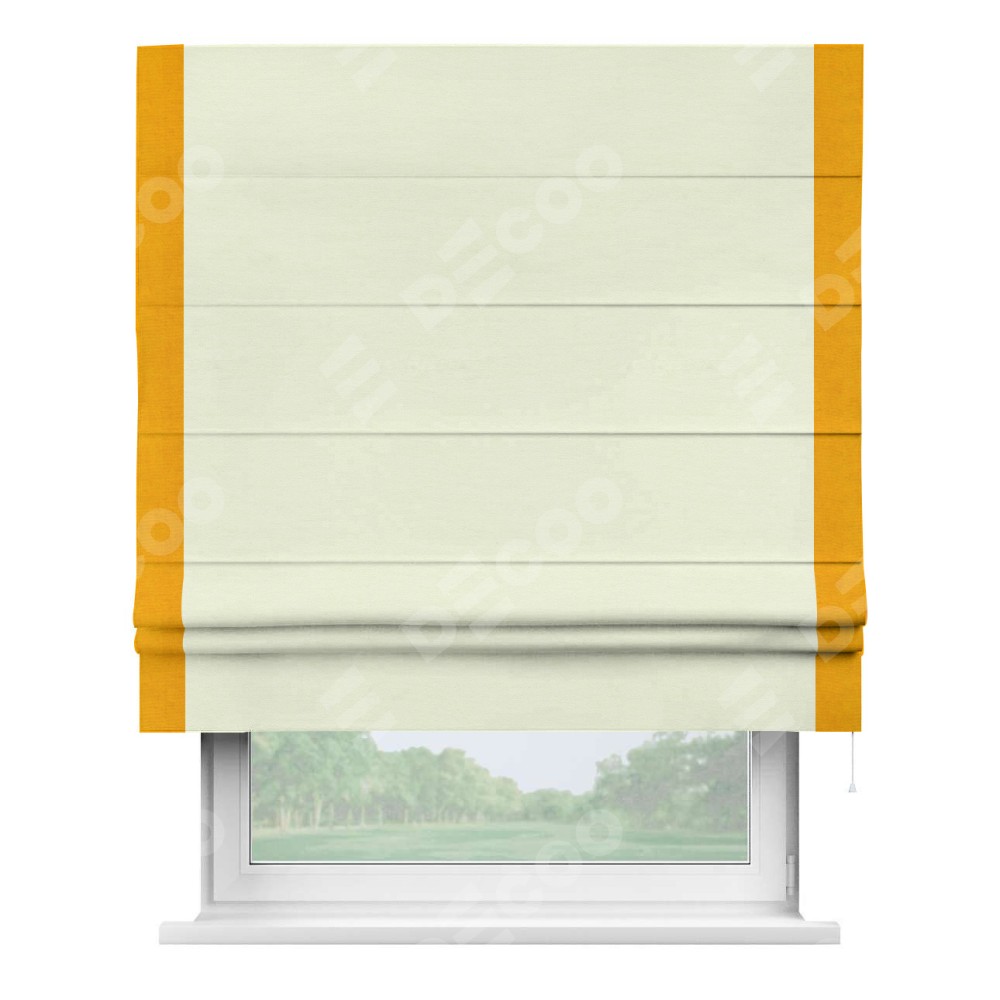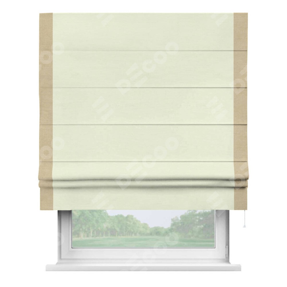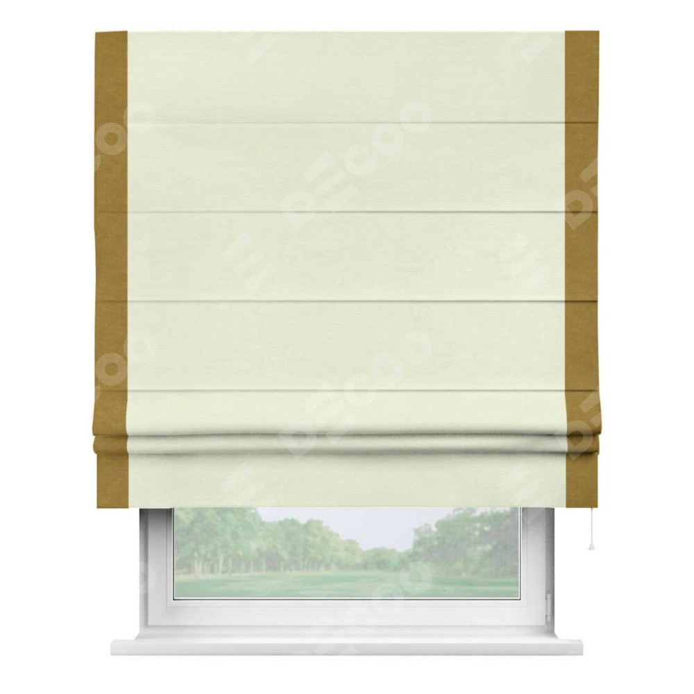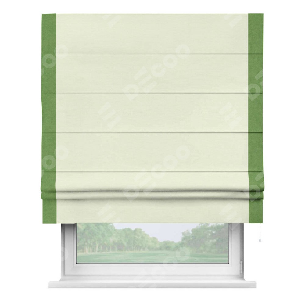 Римская штора производителя «Cortin», используется для проёма, пошита из ткани вельвет молочный, артикул ткани 85536. Отделка шторы кантом «Стрим Дуо», ткань для канта используется из вельвета разной расцветки на выбор. Имеет универсальный механизм и подходит для монтажа: на потолок, на стену и в нишу.