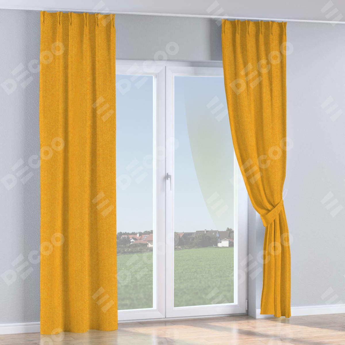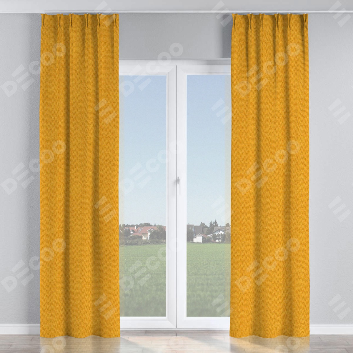 Комплект прямых штор, от производителя «Cortin», пошиты из ткани твид блэкаут медово-желтый, артикул ткани 21641. С изнаночной стороны в верхней части штор пристрачивается шторная лента с декоративными складками «Кустик». Для создания элегантных складок прямые шторы шьются по стандарту с коэффициентом 1:2 (на 100 см. ширины проёма 200 см. ширины ткани).