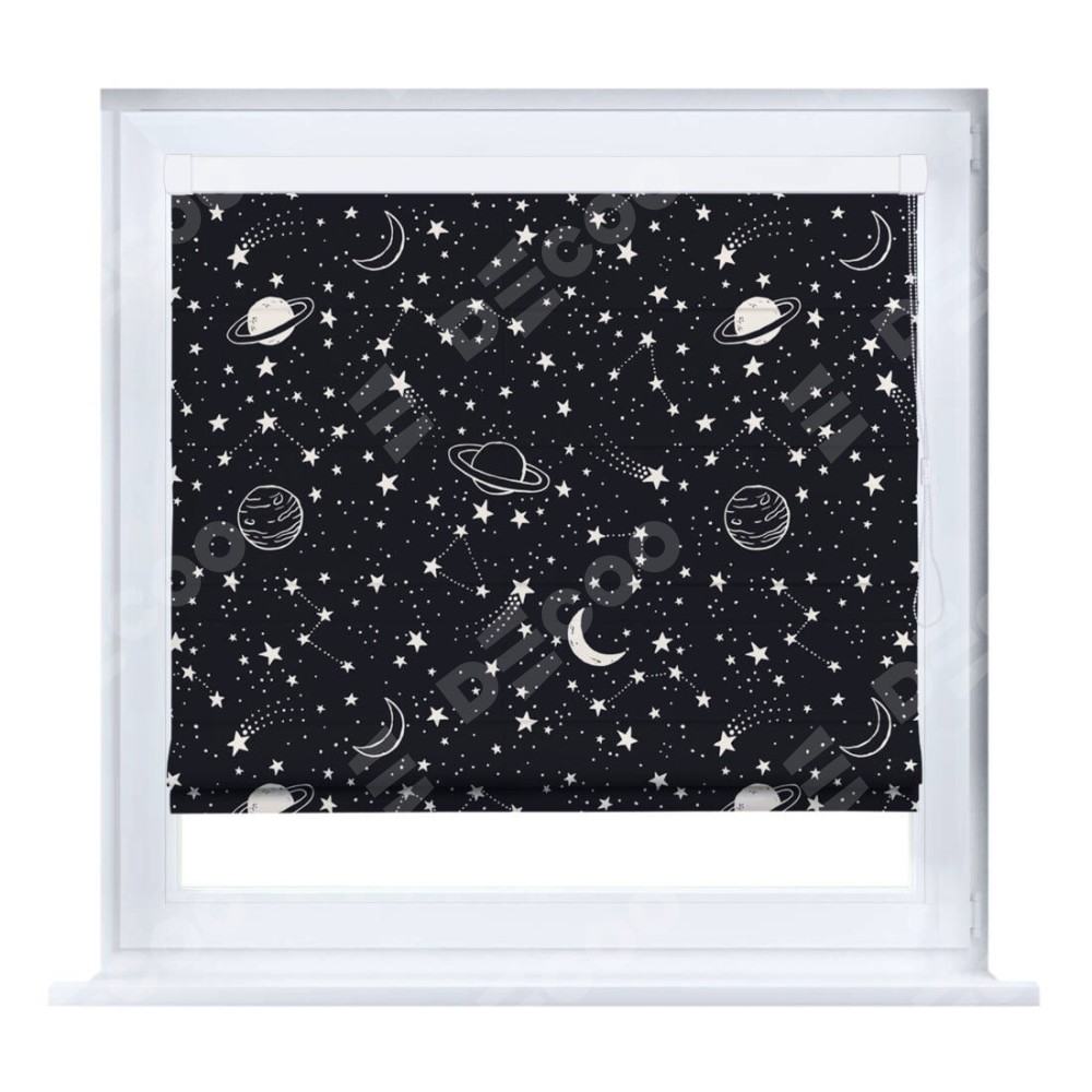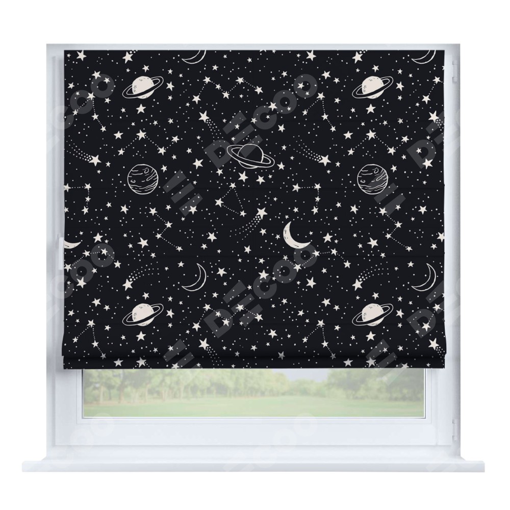 Римская штора производителя «Cortin», устанавливается на створку окна, пошита из ткани блэкаут с нанесением сублимационной печати «Глубокий космос». Штора шьётся по индивидуальным размерам, для данного типа римской шторы возможная ширина от 35 до 150 см., высота до 250 см.