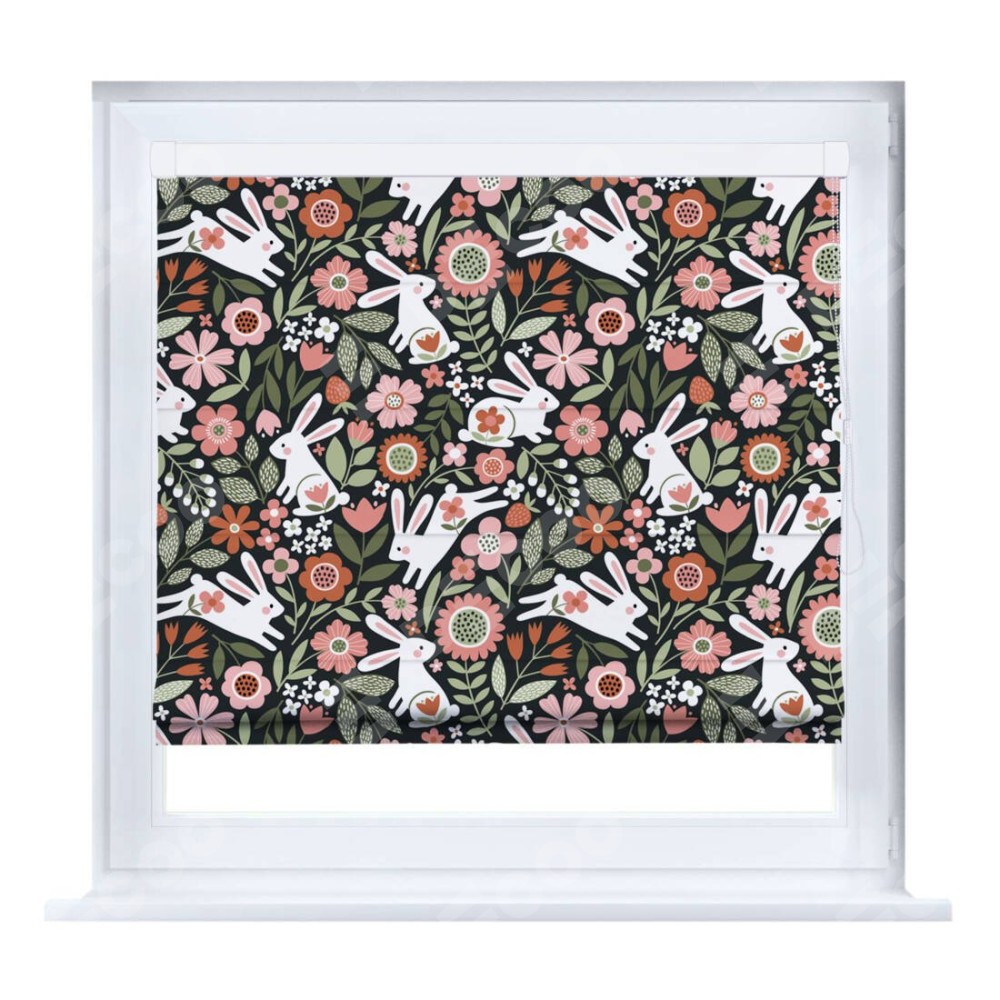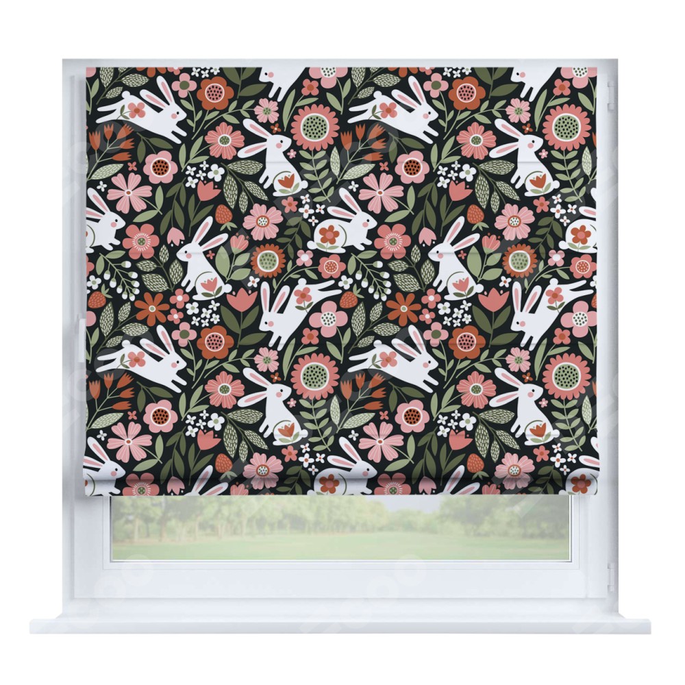Римская штора производителя «Cortin», устанавливается на створку окна, пошита из ткани блэкаут с нанесением сублимационной печати «Зайчики в цветнике». Штора шьётся по индивидуальным размерам, для данного типа римской шторы возможная ширина от 35 до 150 см., высота до 250 см.