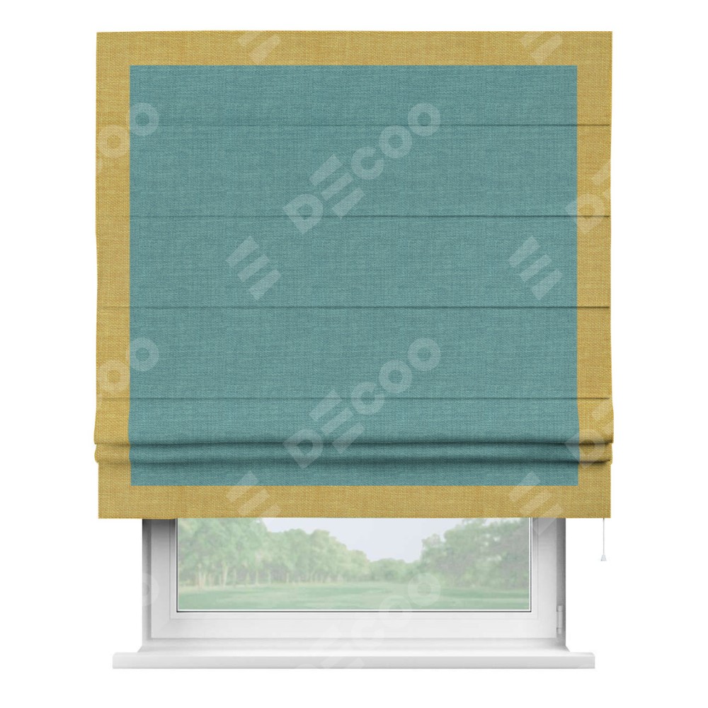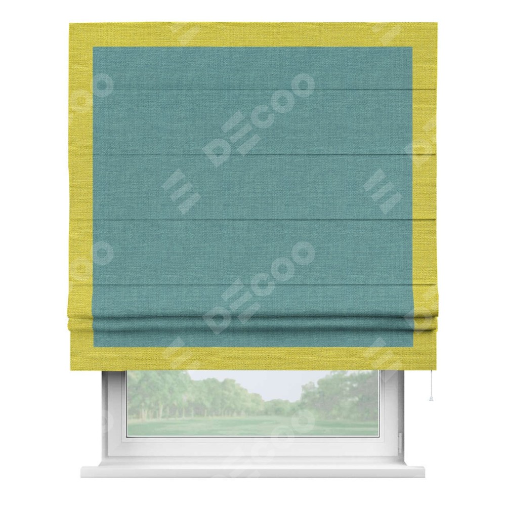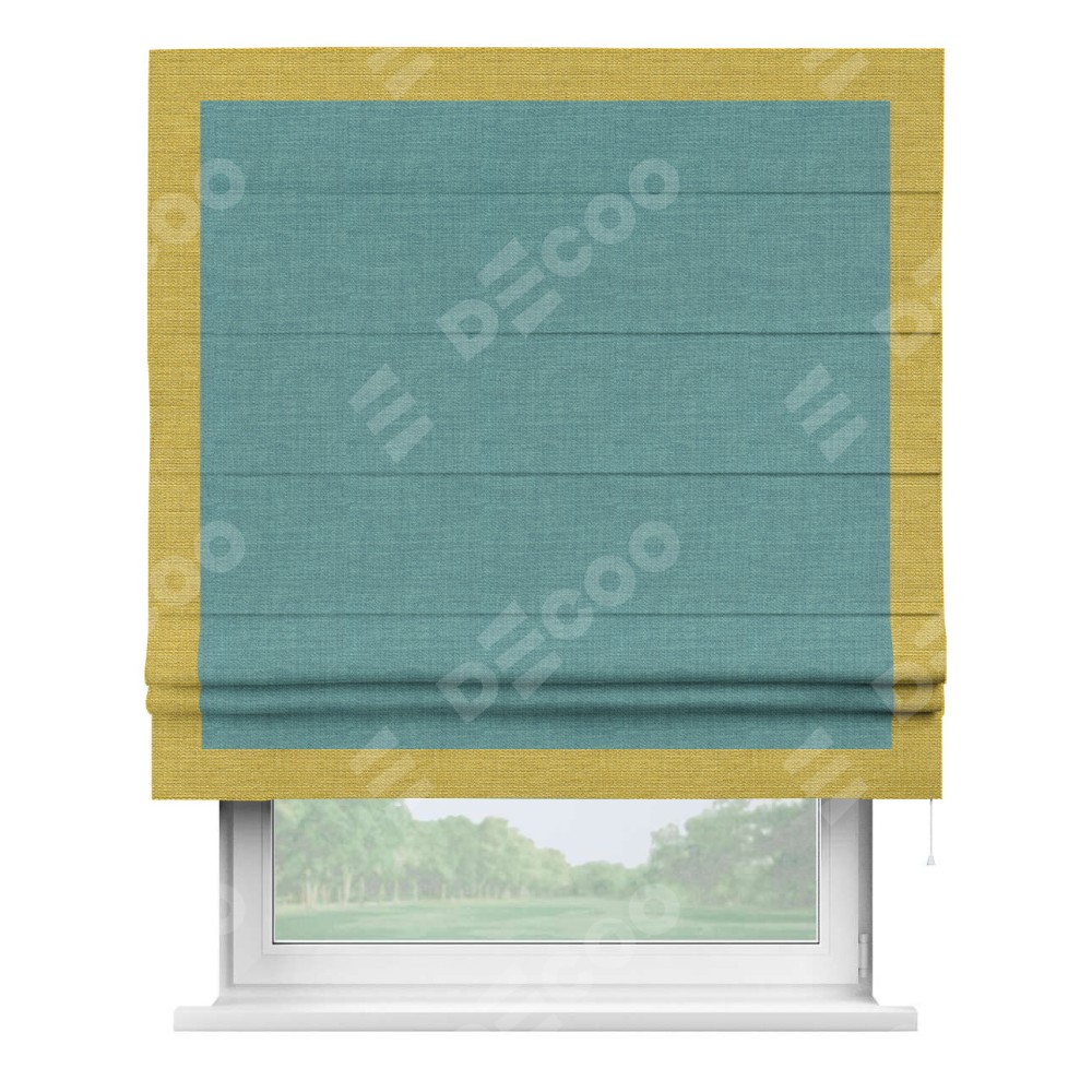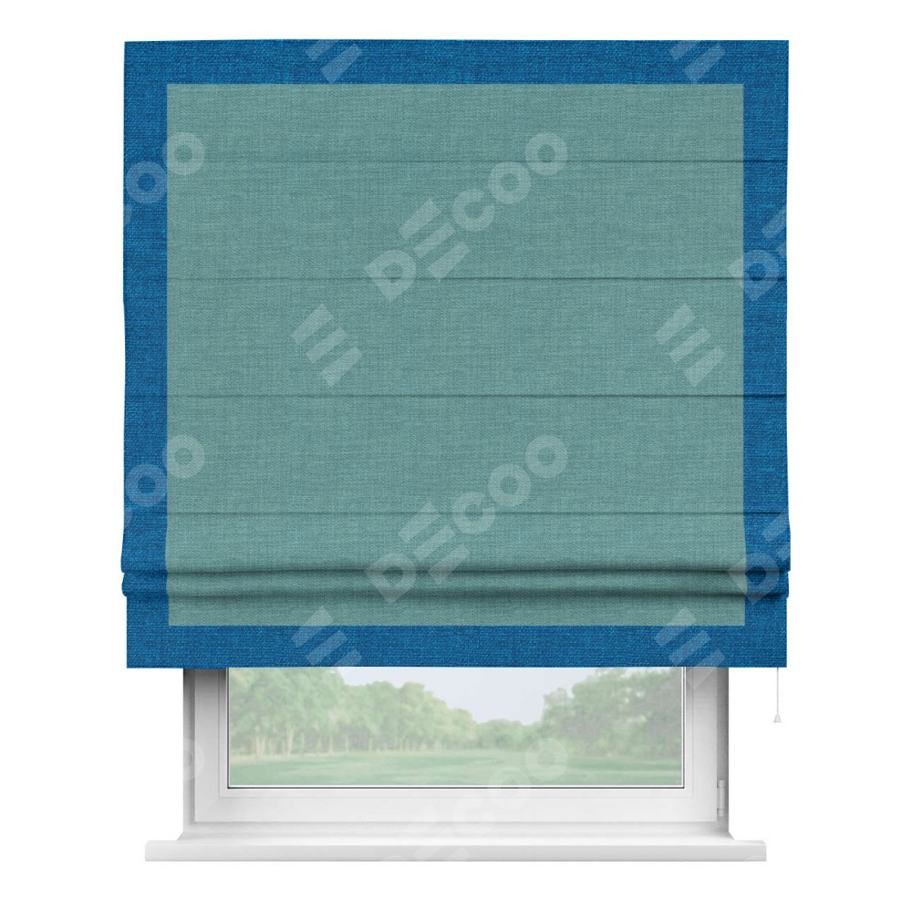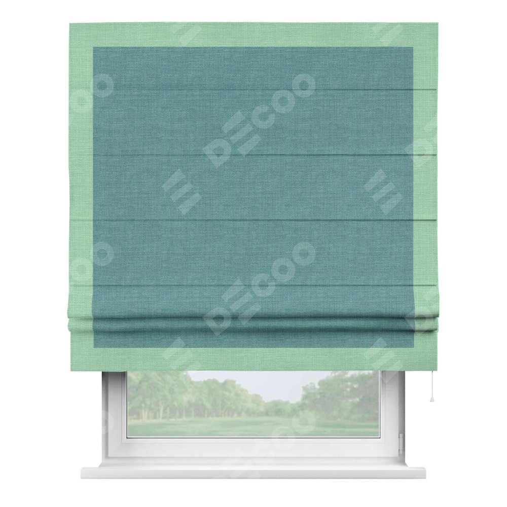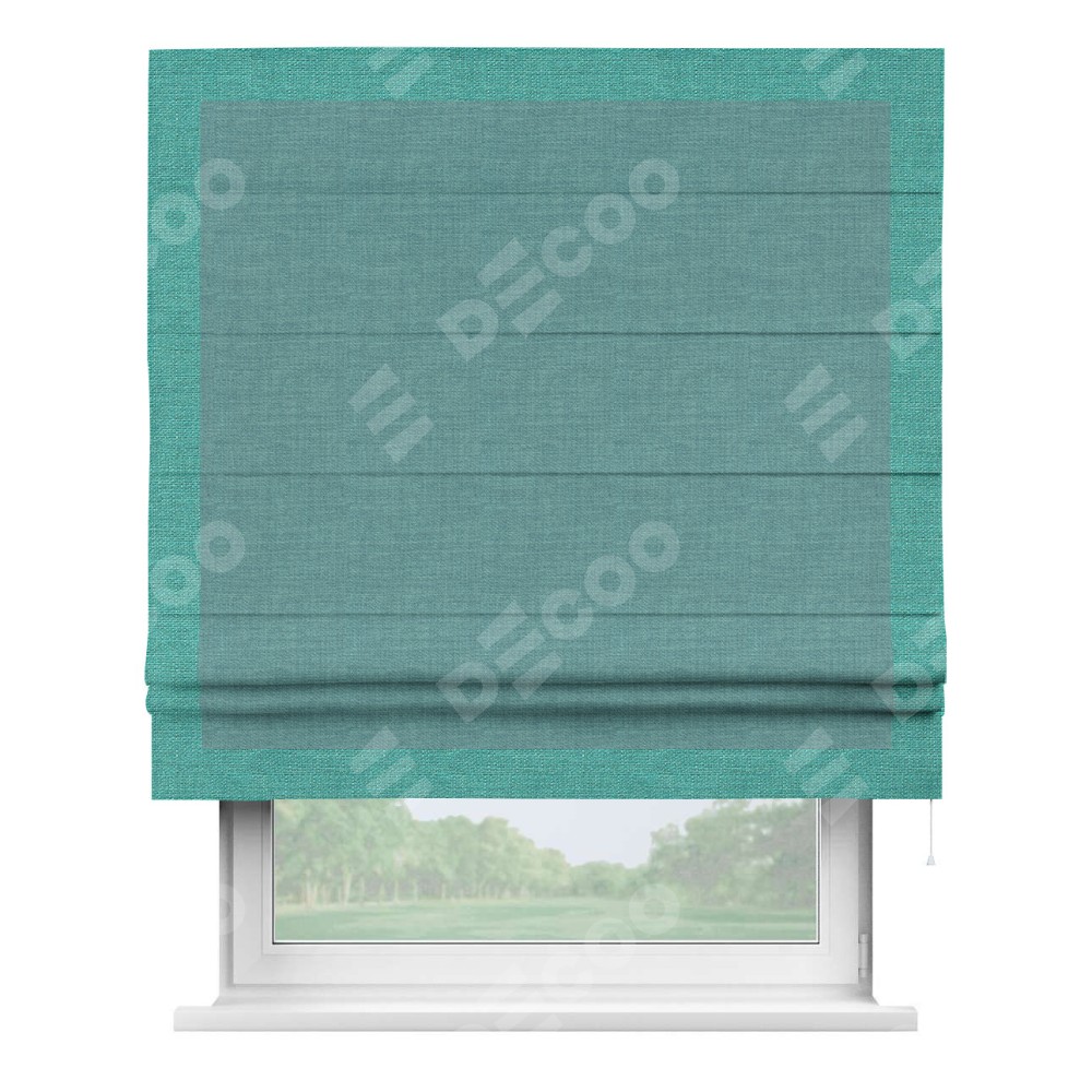 Римская штора производителя «Cortin», используется для проёма, пошита из ткани лён бирюза, артикул 7446. Отделка шторы кантом «Чесс», ткань для канта используется из льна разной расцветки на выбор. Имеет универсальный механизм и подходит для монтажа: на потолок, на стену и в нишу.