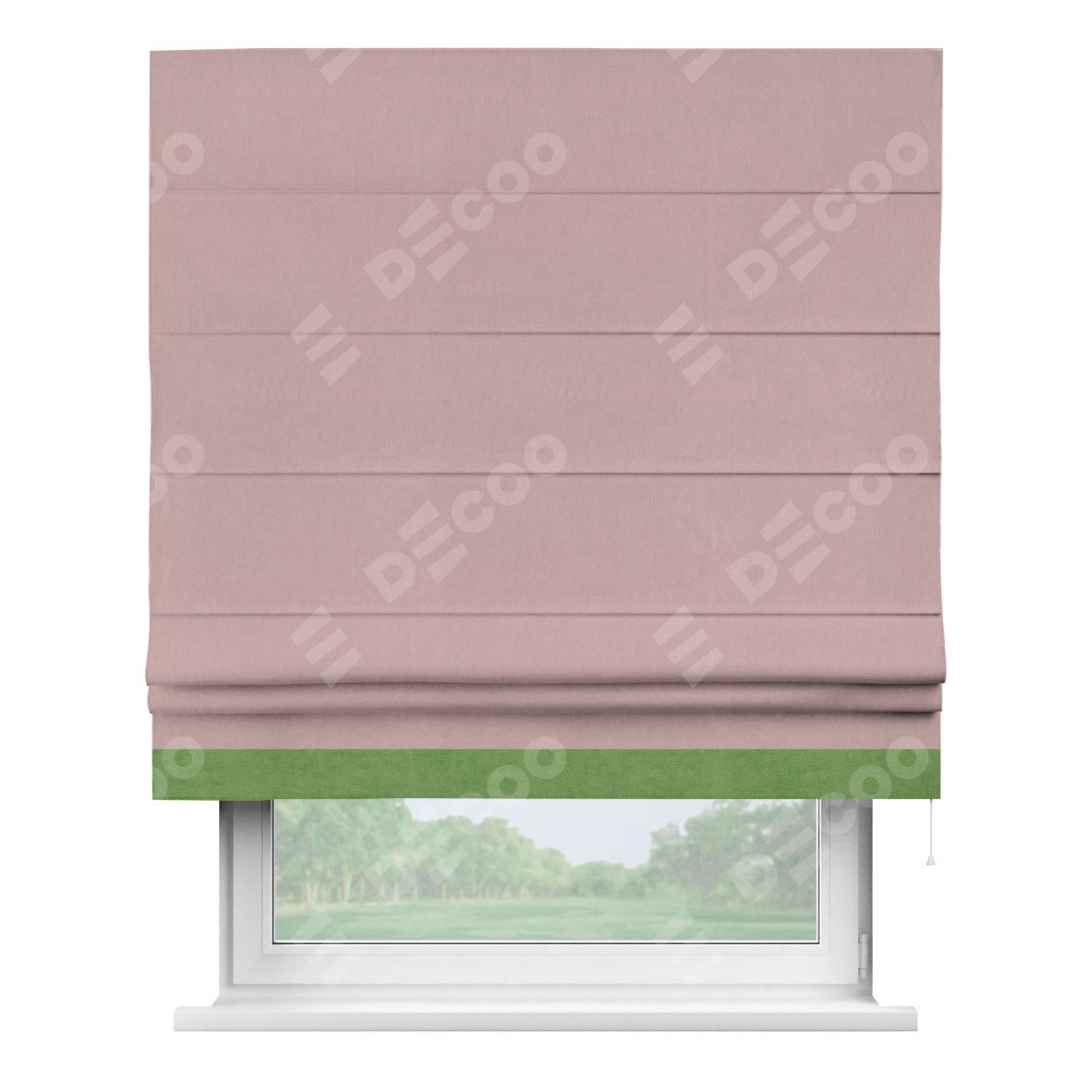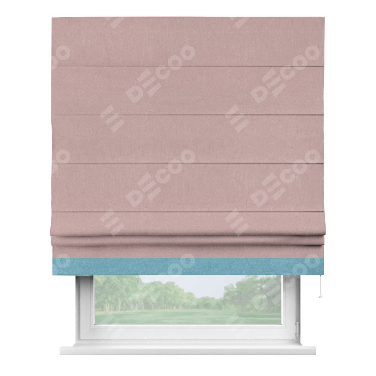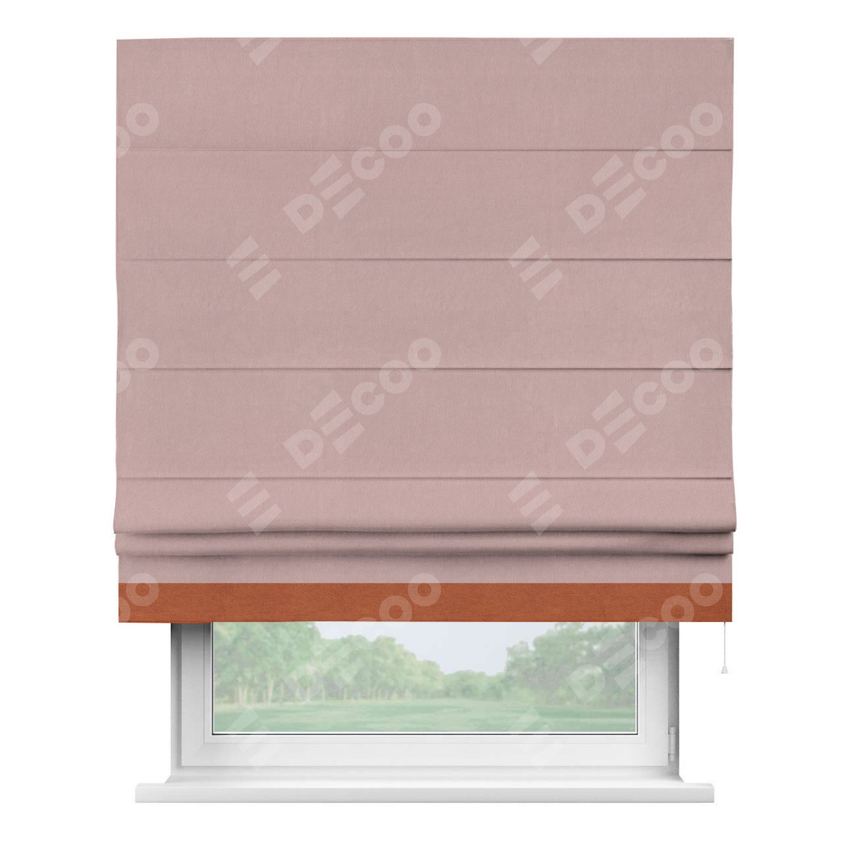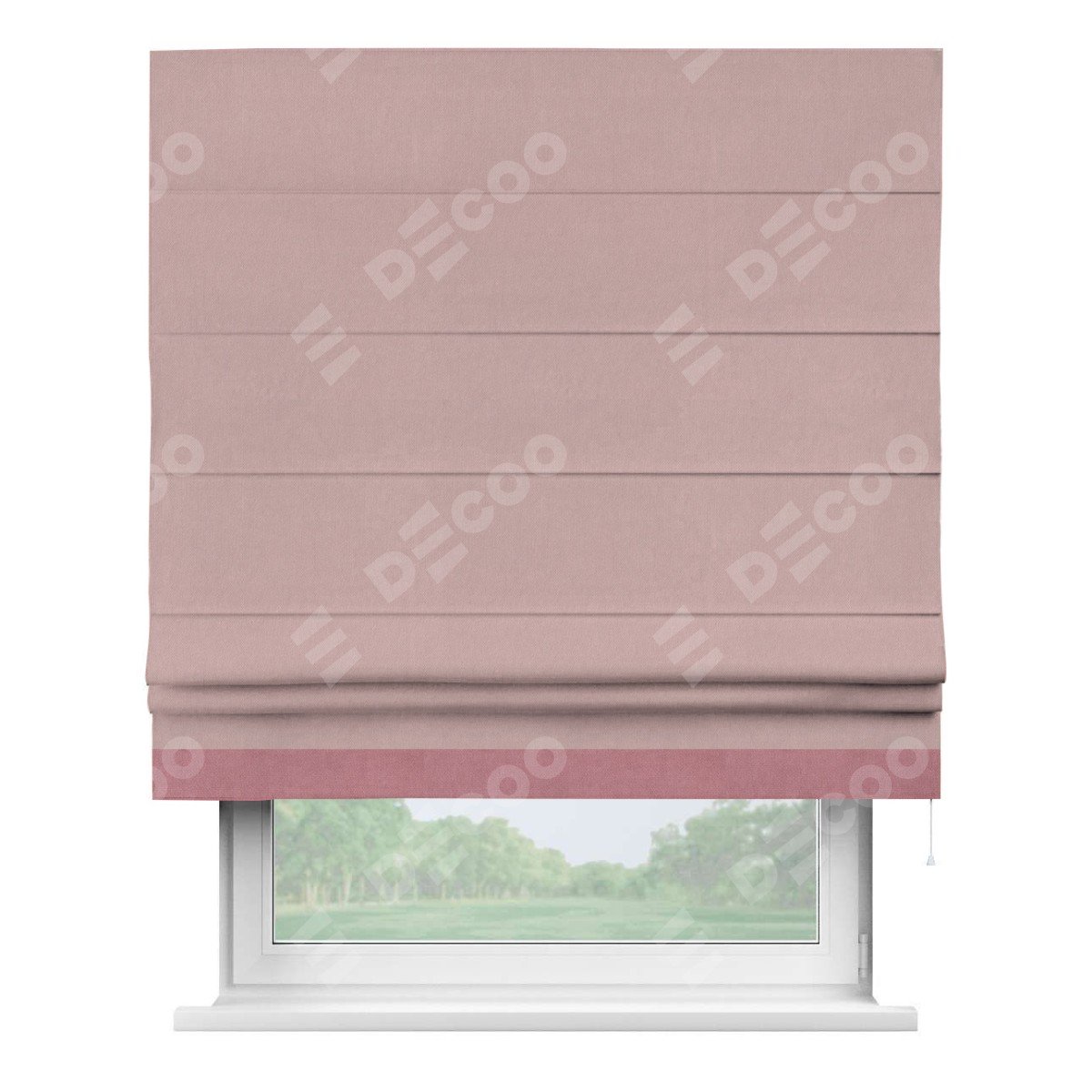 Римская штора производителя «Cortin», используется для проёма, пошита из ткани вельвет розовая пудра, артикул ткани 14132. Отделка шторы кантом «Джестер», ткань для канта используется из вельвета разной расцветки на выбор. Имеет универсальный механизм и подходит для монтажа: на потолок, на стену и в нишу.