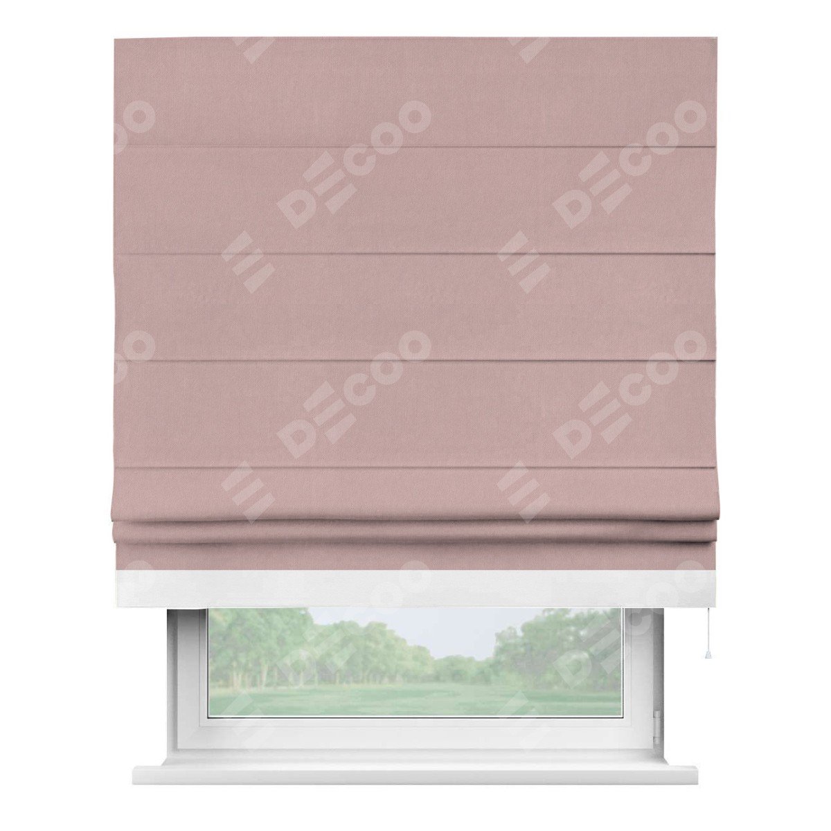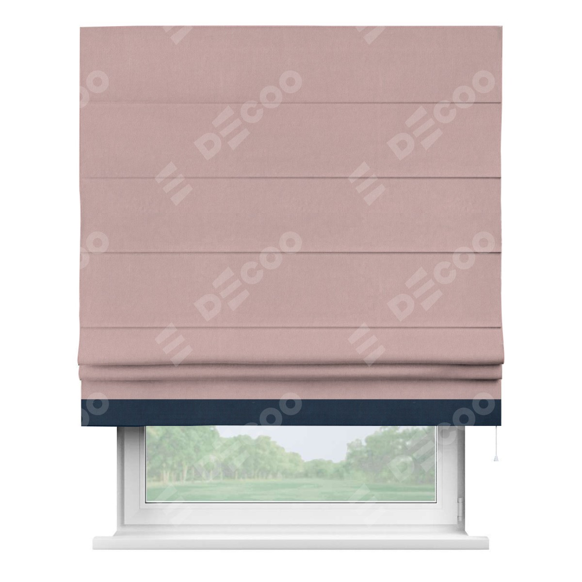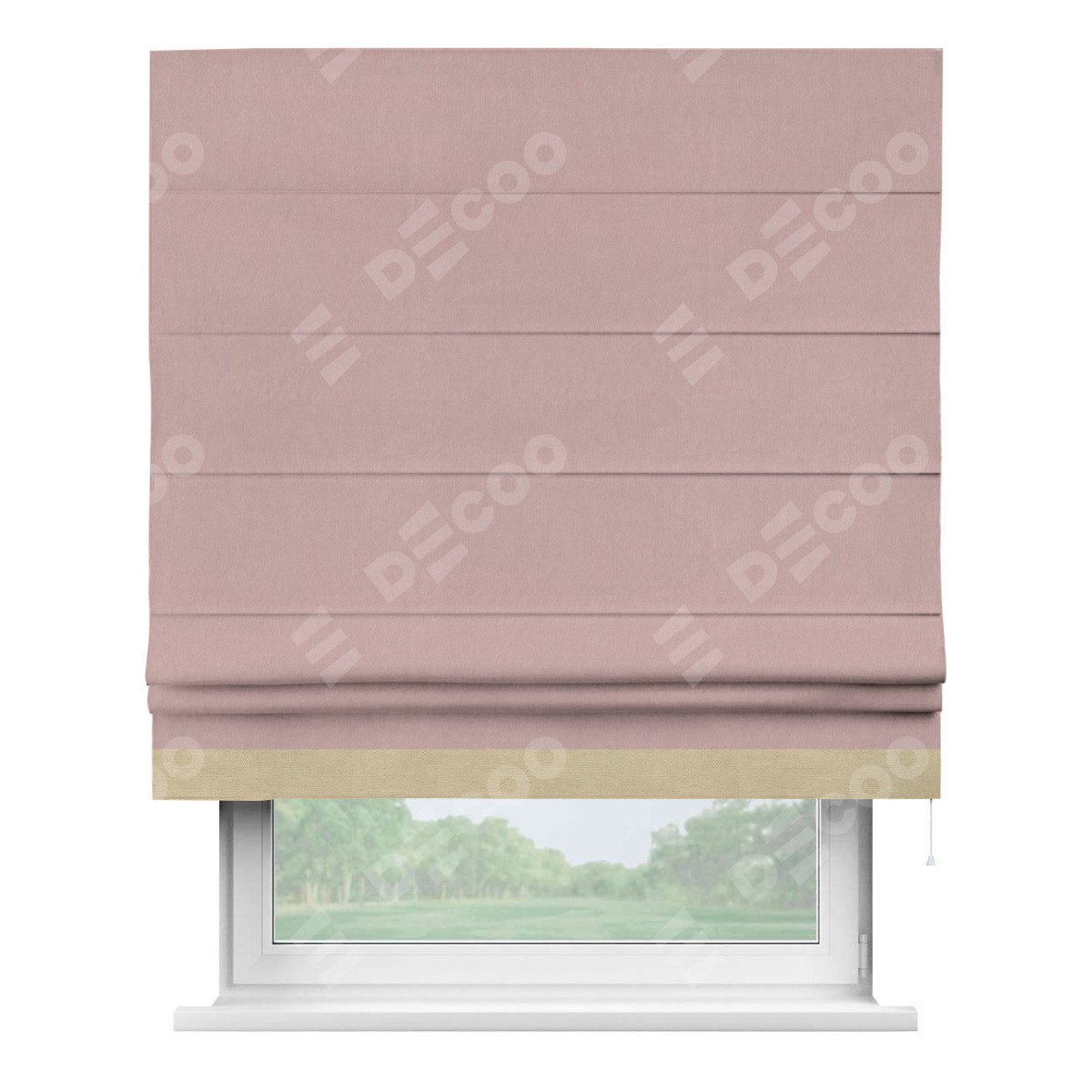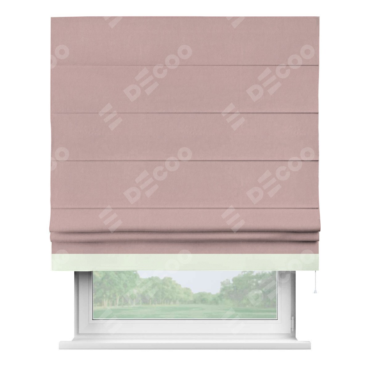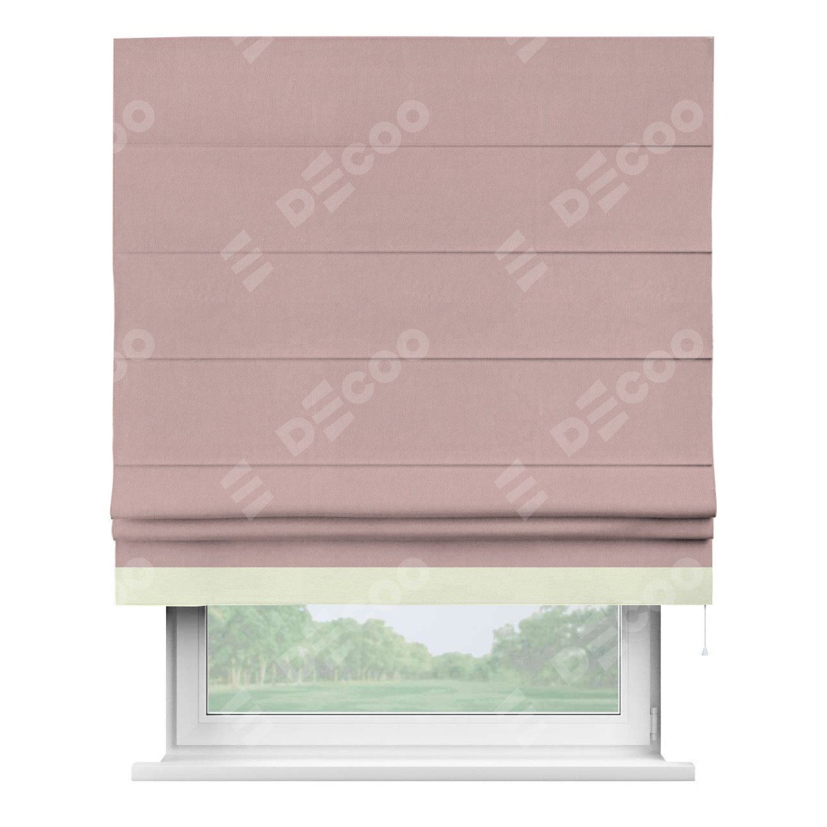 Римская штора производителя «Cortin», используется для проёма, пошита из ткани вельвет розовая пудра, артикул ткани 14132. Отделка шторы кантом «Джестер», ткань для канта используется из вельвета разной расцветки на выбор. Имеет универсальный механизм и подходит для монтажа: на потолок, на стену и в нишу.