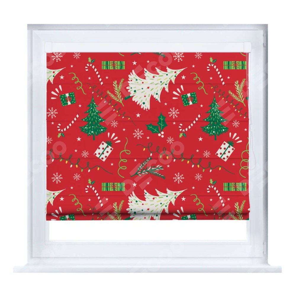 Римская штора производителя «Cortin», устанавливается на створку окна, пошита из ткани блэкаут с нанесением сублимационной печати «Новогодние подарки». Штора шьётся по индивидуальным размерам, для данного типа римской шторы возможная ширина от 35 до 150 см., высота до 250 см.