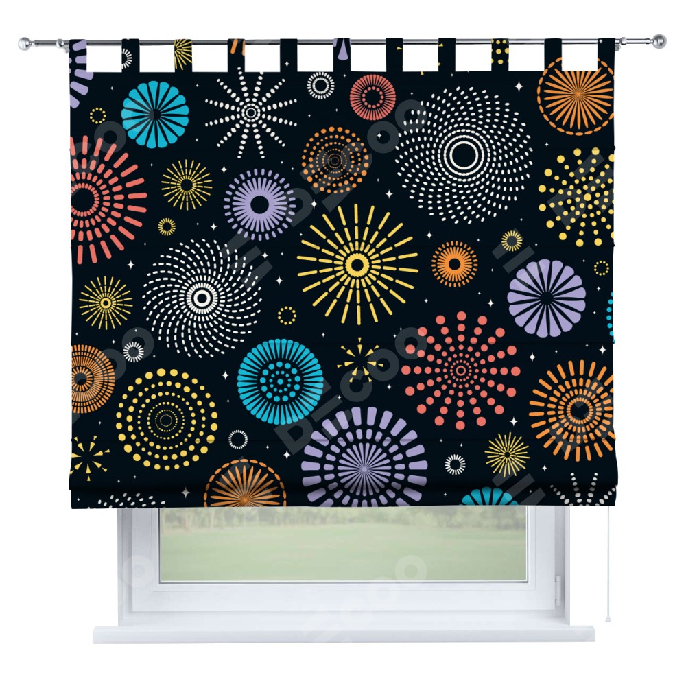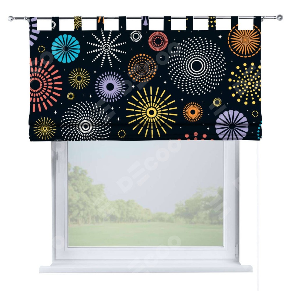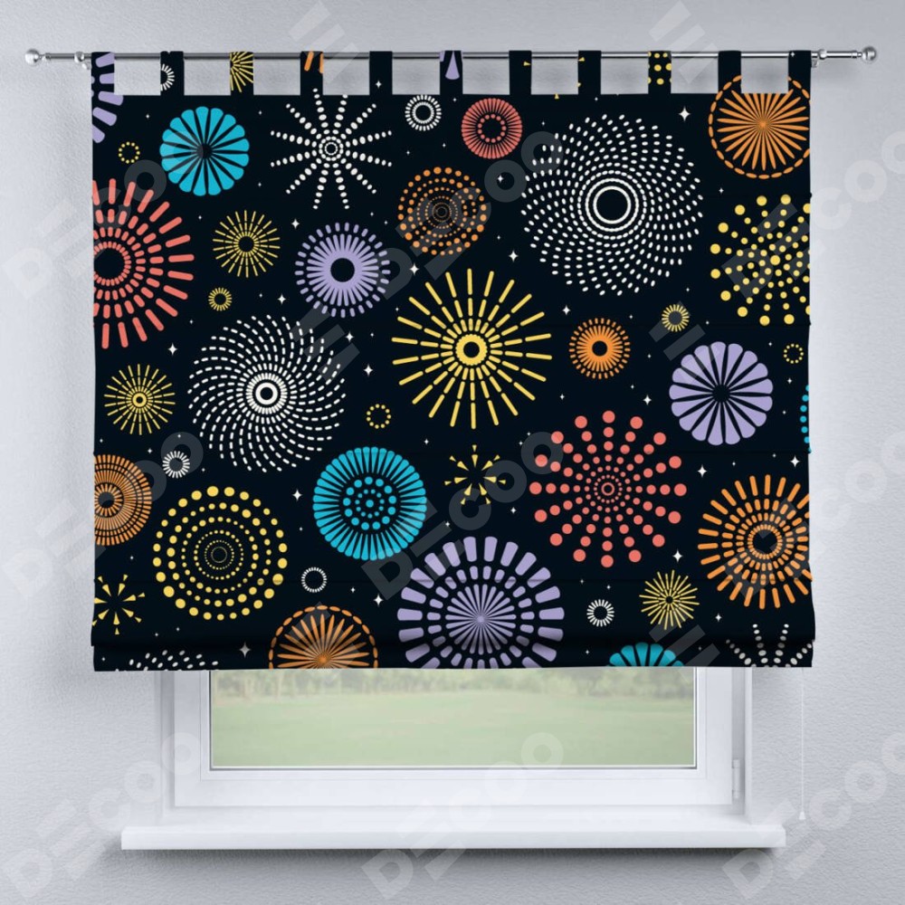 Римская штора производителя «Cortin», используется для проёма, пошита из ткани блэкаут с нанесением сублимационной печати «Праздничный фейерверк». Данная модель пошита на петлях, комплектуется на выбор круглым карнизом и подходит для монтажа на стену. Римская штора на петлях имеет простую систему регулировки высоты, отличительным преимуществом данной модели является простой способ монтажа. Достаточно повесить ее на трубу и штора готова!