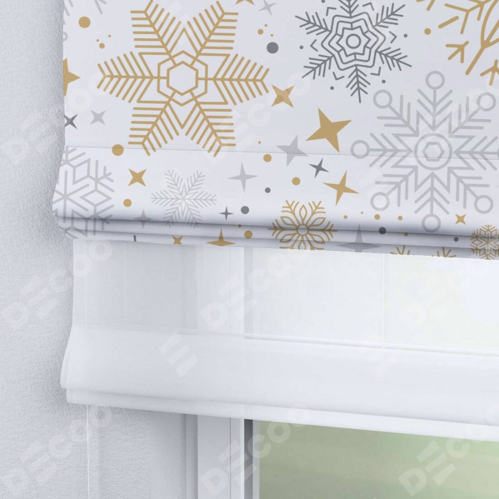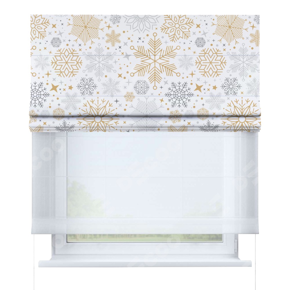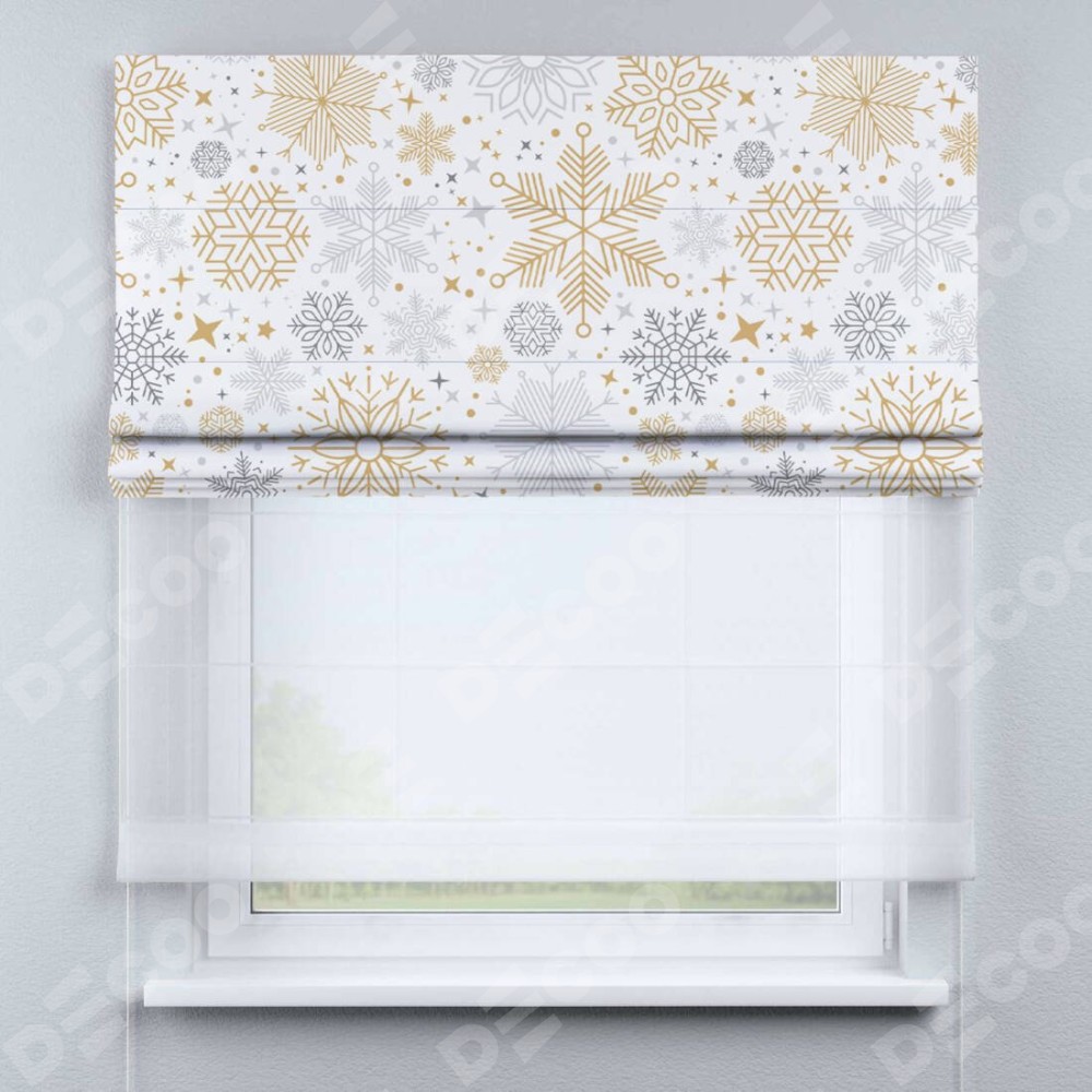 Римская штора день-ночь производителя «Cortin», используется для проёма, пошита из двух полотен, с лицевой блэкаут с нанесением сублимационной печати «Снежное очарование», вторая ткань тюль (по стандарту комплектуется тюль белого цвета артикул V-01). Имеет универсальный механизм и подходит для монтажа: на потолок, на стену и в нишу.