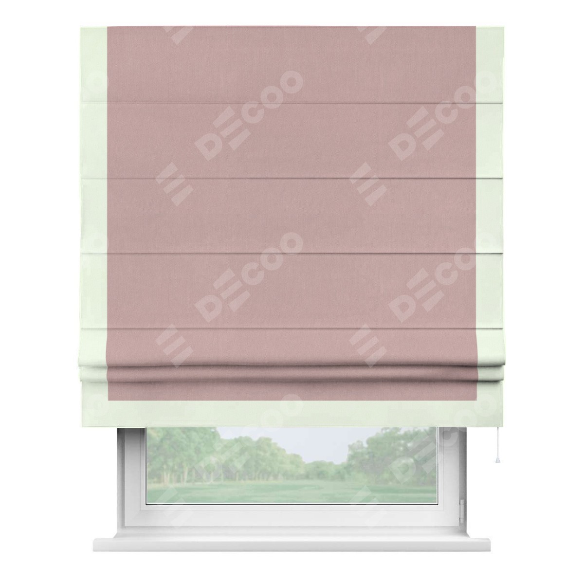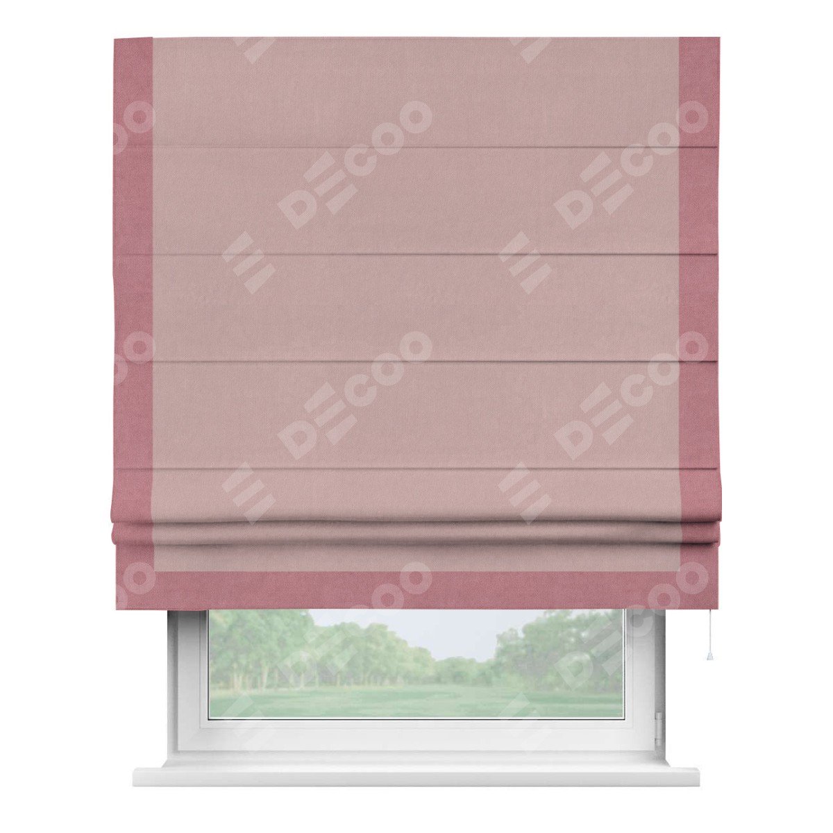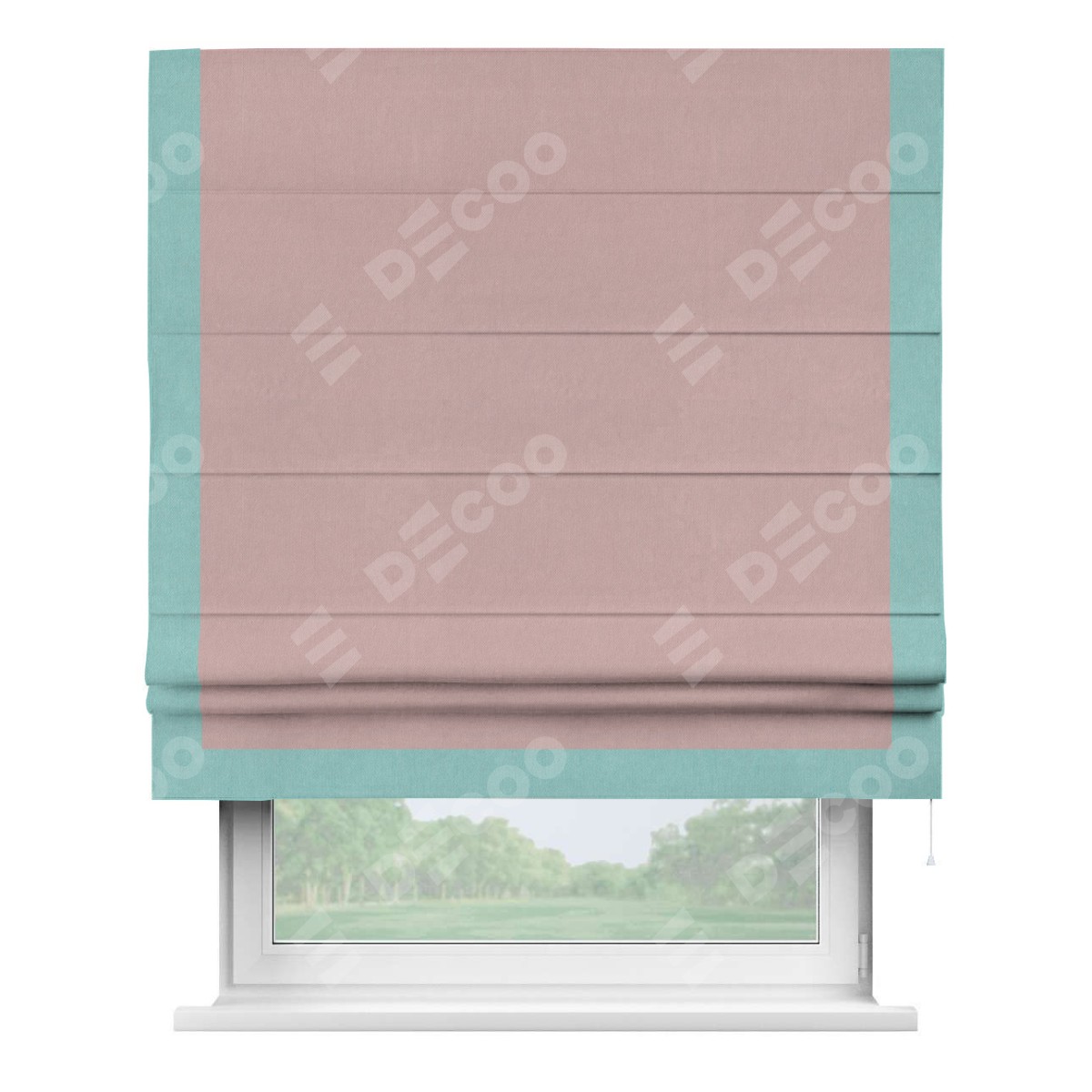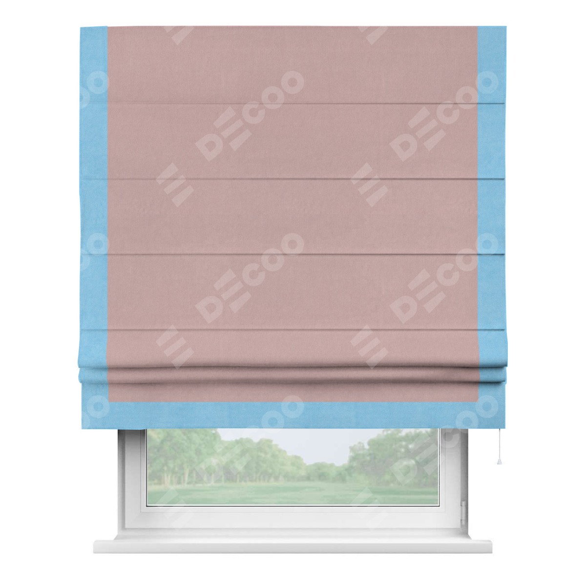 Римская штора производителя «Cortin», используется для проёма, пошита из ткани вельвет розовая пудра, артикул ткани 14132. Отделка шторы кантом «Виктория», ткань для канта используется из вельвета разной расцветки на выбор. Имеет универсальный механизм и подходит для монтажа: на потолок, на стену и в нишу.