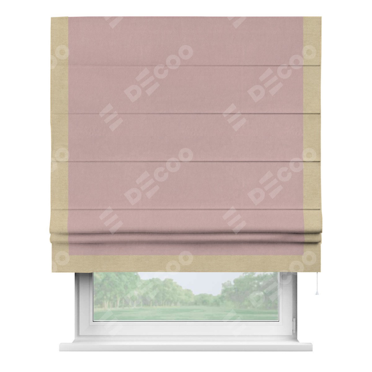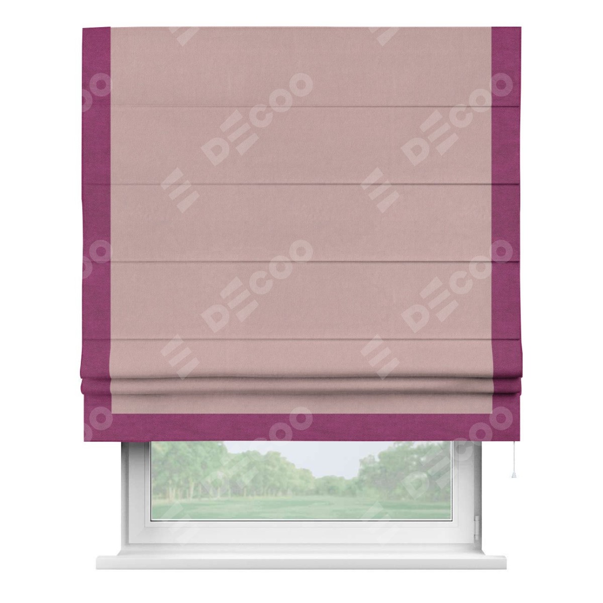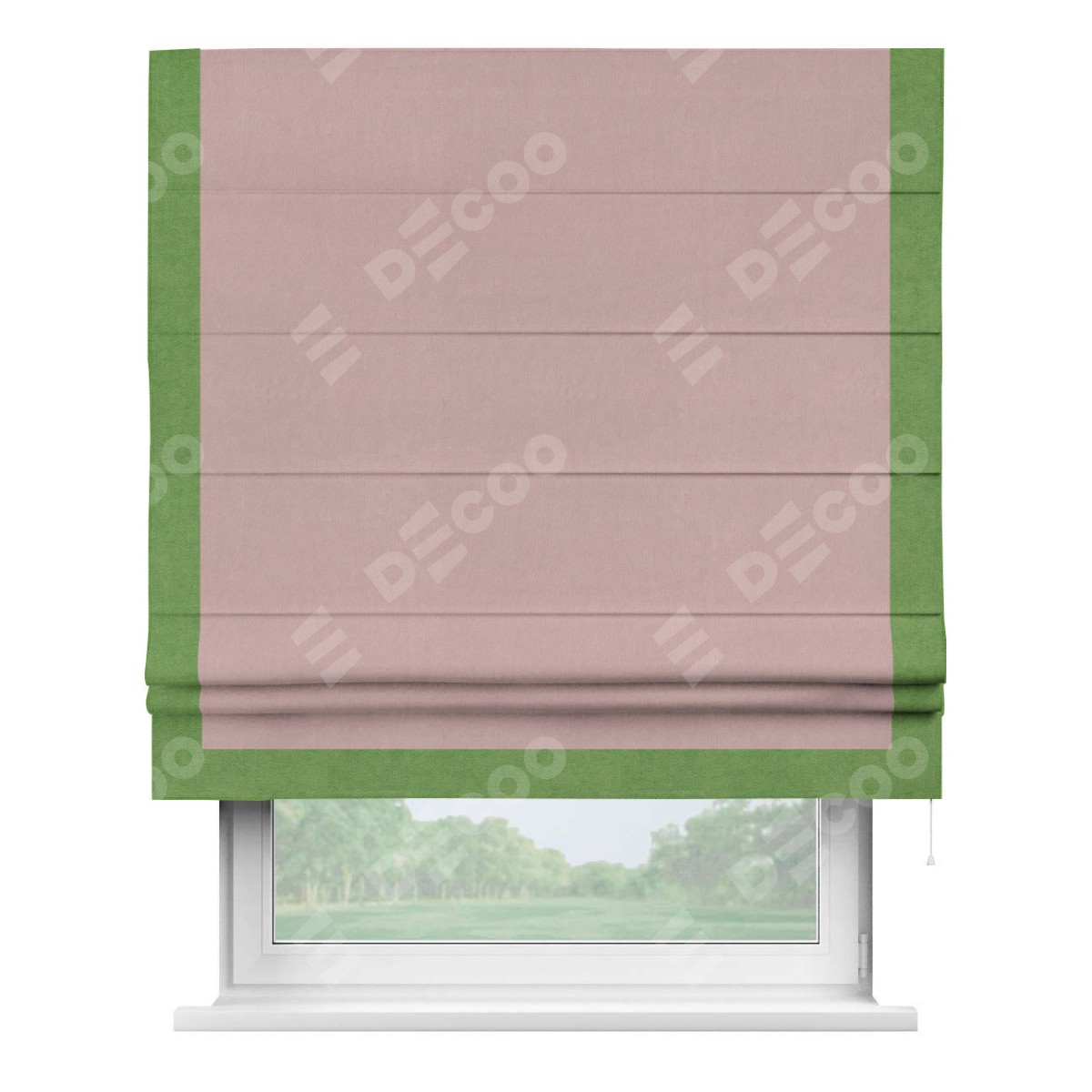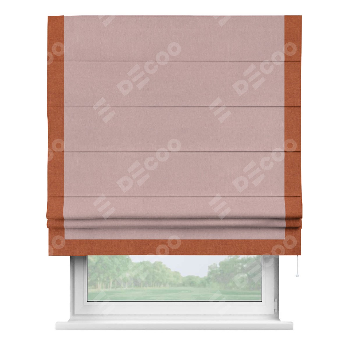 Римская штора производителя «Cortin», используется для проёма, пошита из ткани вельвет розовая пудра, артикул ткани 14132. Отделка шторы кантом «Виктория», ткань для канта используется из вельвета разной расцветки на выбор. Имеет универсальный механизм и подходит для монтажа: на потолок, на стену и в нишу.