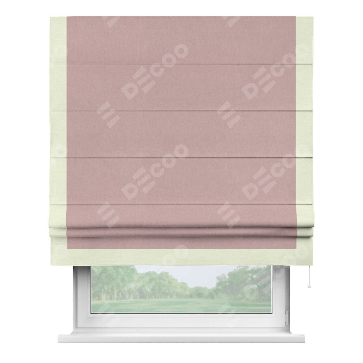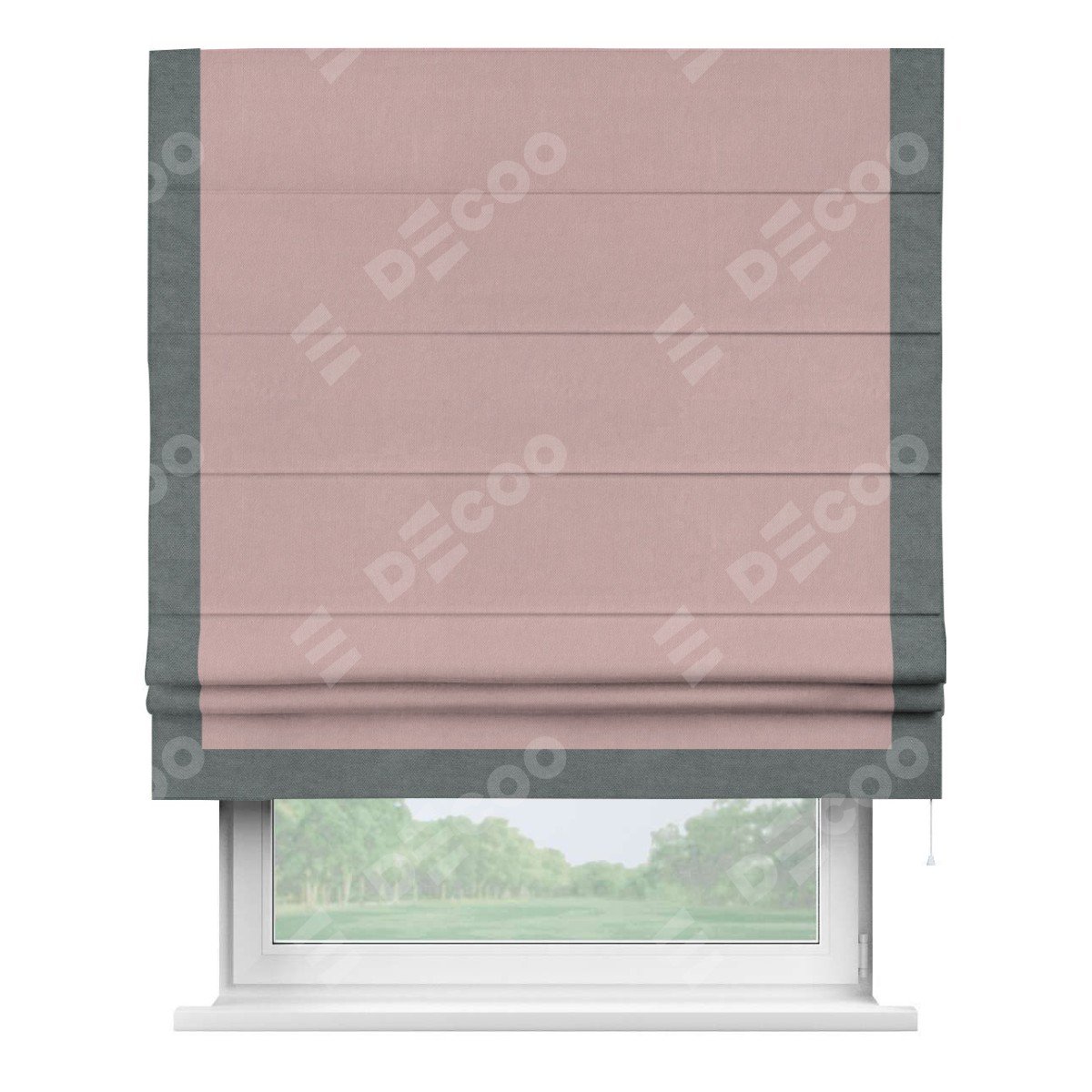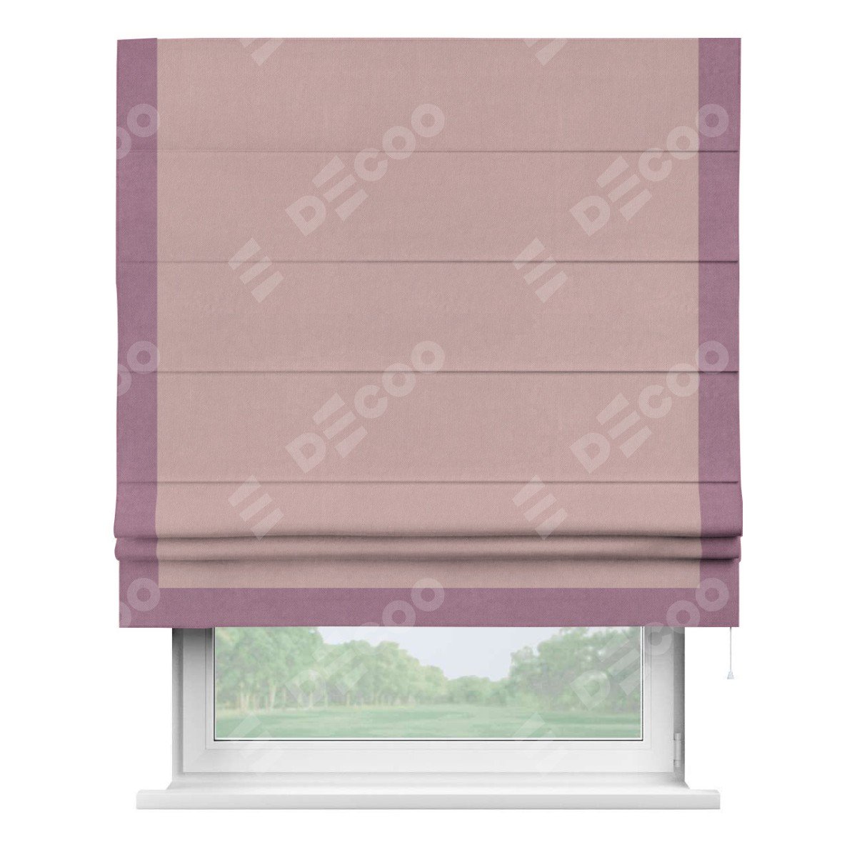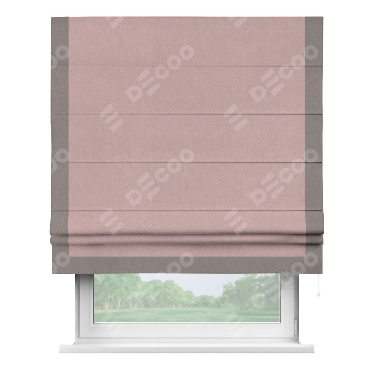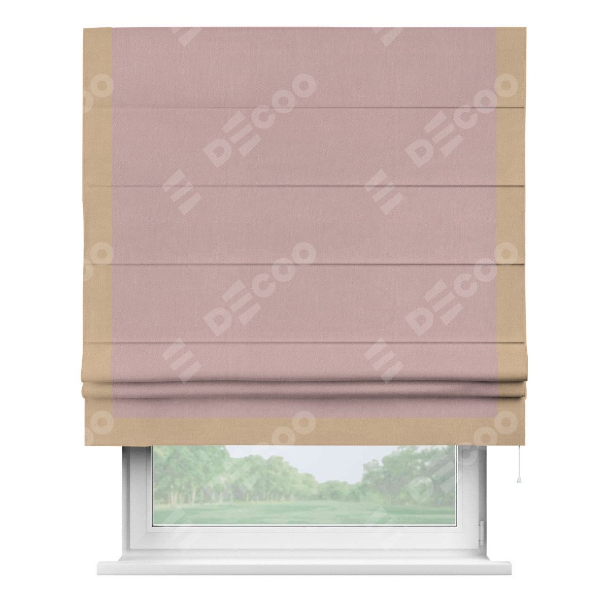 Римская штора производителя «Cortin», используется для проёма, пошита из ткани вельвет розовая пудра, артикул ткани 14132. Отделка шторы кантом «Виктория», ткань для канта используется из вельвета разной расцветки на выбор. Имеет универсальный механизм и подходит для монтажа: на потолок, на стену и в нишу.
