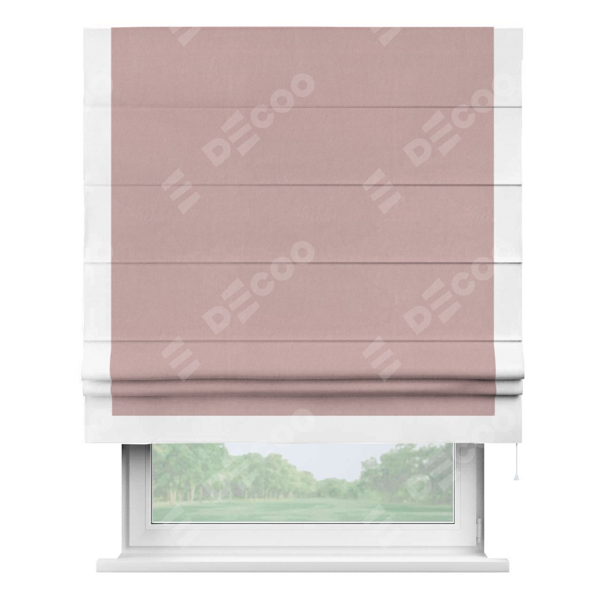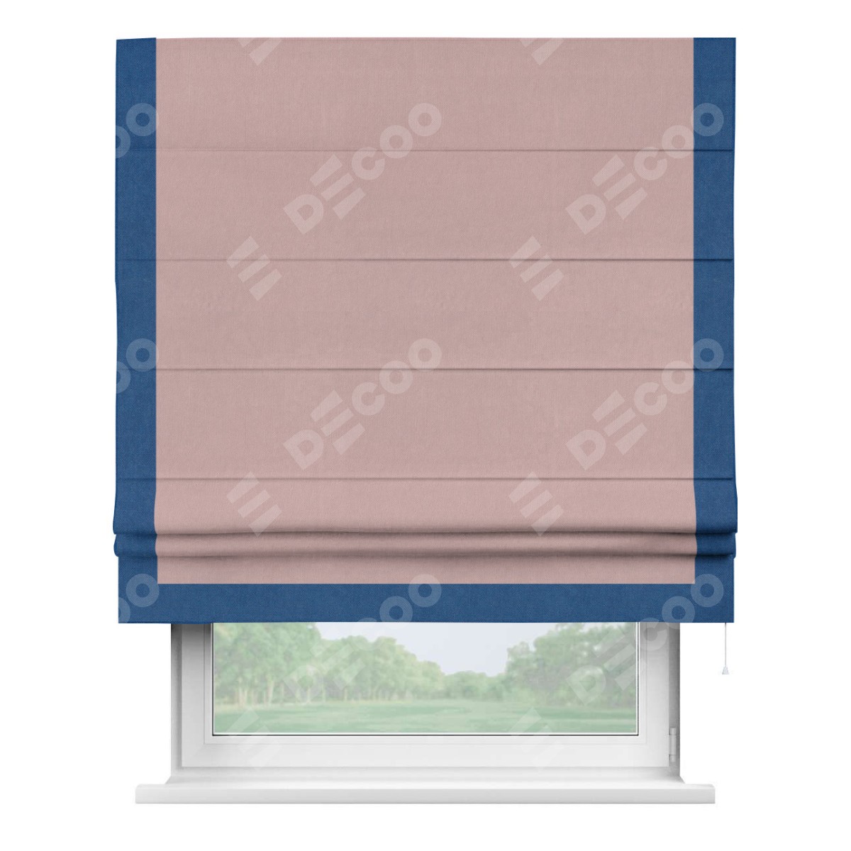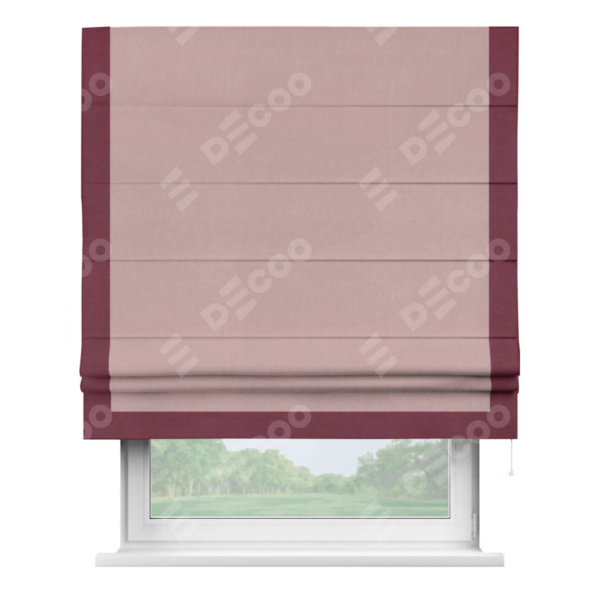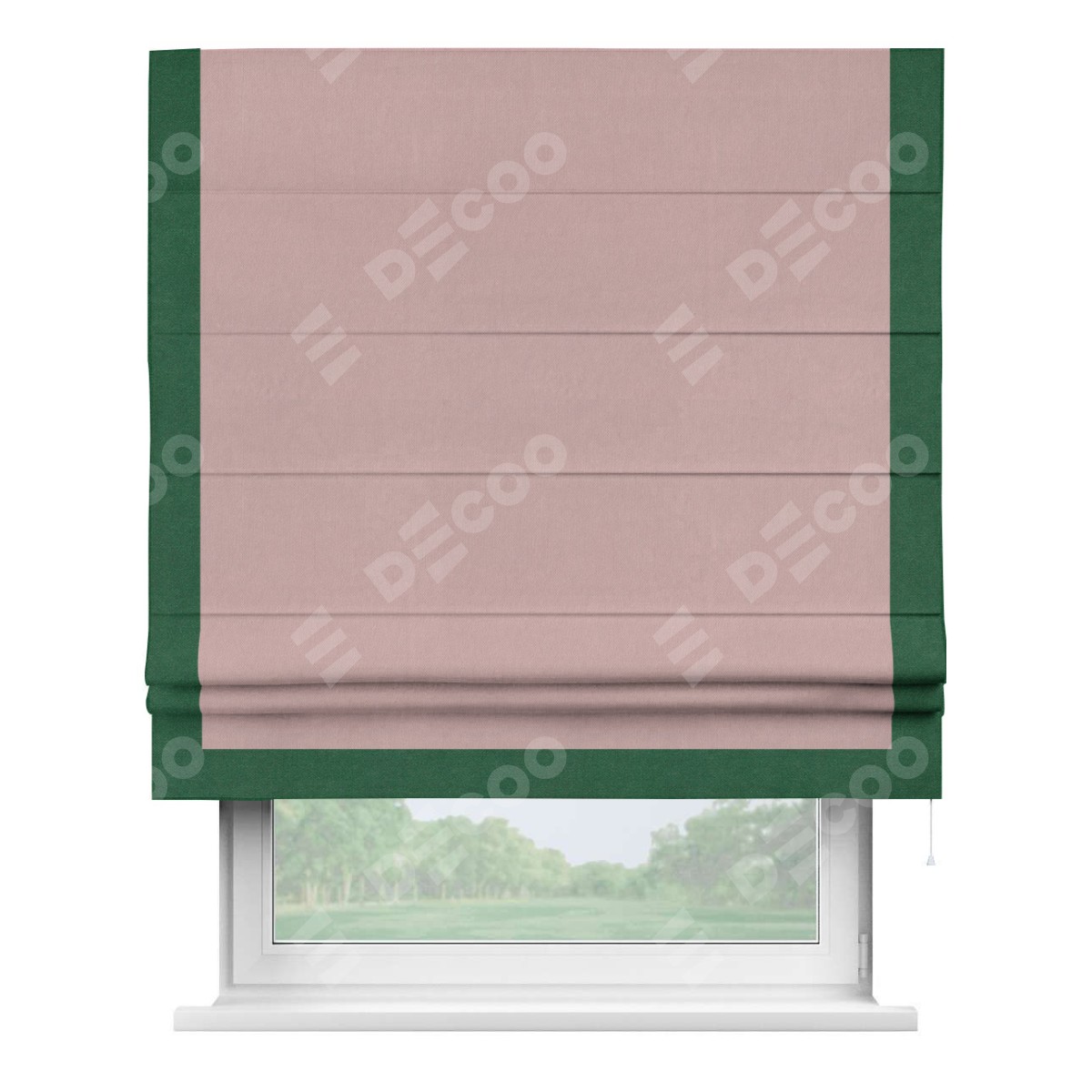 Римская штора производителя «Cortin», используется для проёма, пошита из ткани вельвет розовая пудра, артикул ткани 14132. Отделка шторы кантом «Виктория», ткань для канта используется из вельвета разной расцветки на выбор. Имеет универсальный механизм и подходит для монтажа: на потолок, на стену и в нишу.