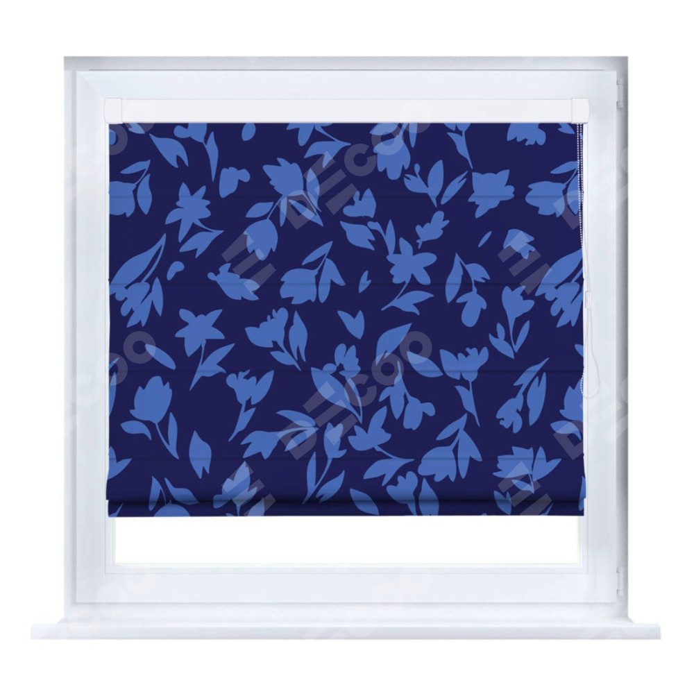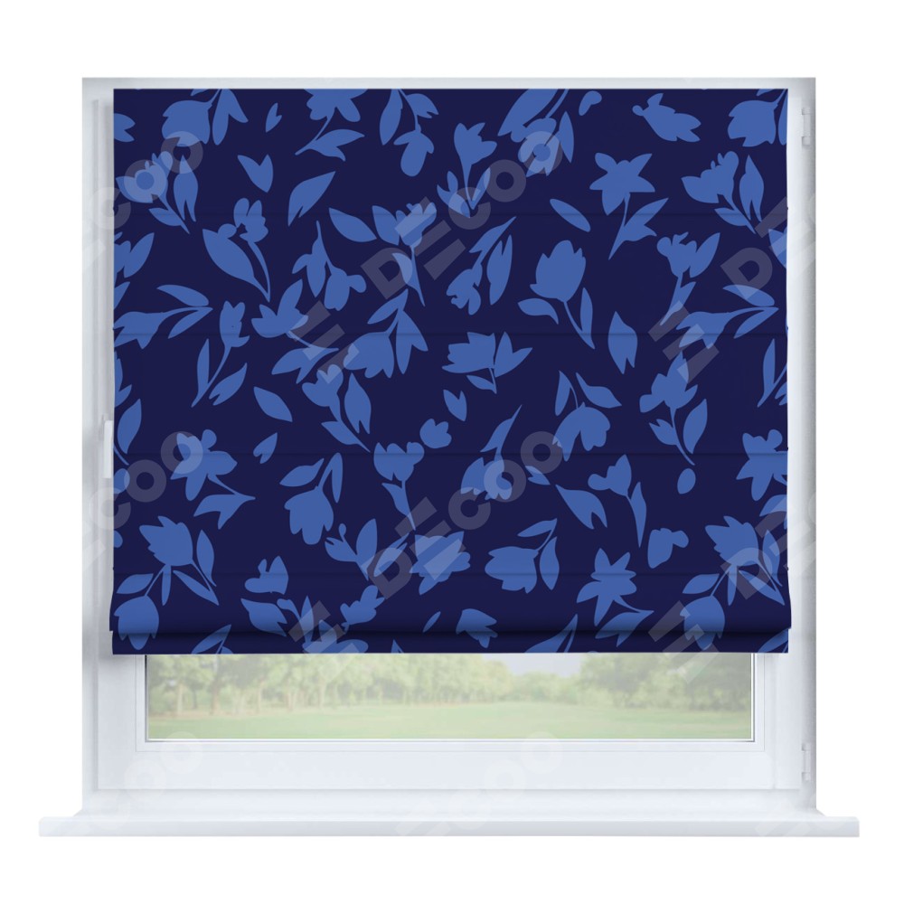 Римская штора производителя «Cortin», устанавливается на створку окна, пошита из ткани блэкаут с нанесением сублимационной печати «Синие цветы». Штора шьётся по индивидуальным размерам, для данного типа римской шторы возможная ширина от 35 до 150 см., высота до 250 см.