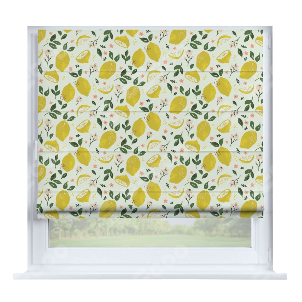 Римская штора производителя «Cortin», устанавливается на створку окна, пошита из ткани блэкаут с нанесением сублимационной печати «Сочные лимоны». Штора шьётся по индивидуальным размерам, для данного типа римской шторы возможная ширина от 35 до 150 см., высота до 250 см.