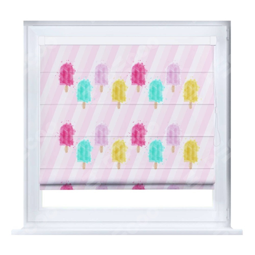 Римская штора производителя «Cortin», устанавливается на створку окна, пошита из ткани блэкаут с нанесением сублимационной печати «Фруктовое мороженое». Штора шьётся по индивидуальным размерам, для данного типа римской шторы возможная ширина от 35 до 150 см., высота до 250 см.