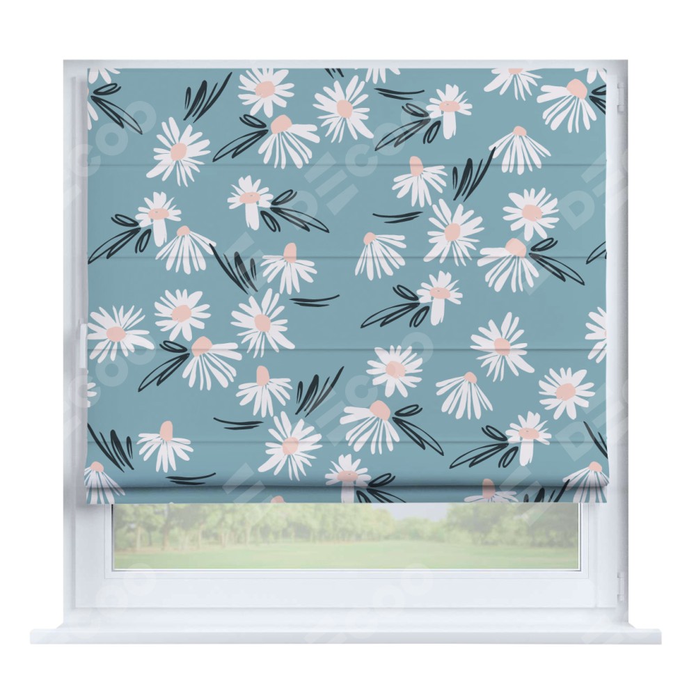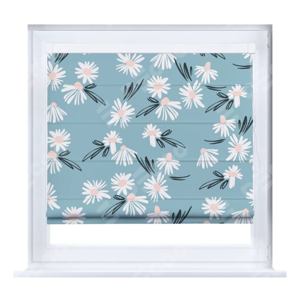 Римская штора производителя «Cortin», устанавливается на створку окна, пошита из ткани блэкаут с нанесением сублимационной печати «Чудесные ромашки». Штора шьётся по индивидуальным размерам, для данного типа римской шторы возможная ширина от 35 до 150 см., высота до 250 см.