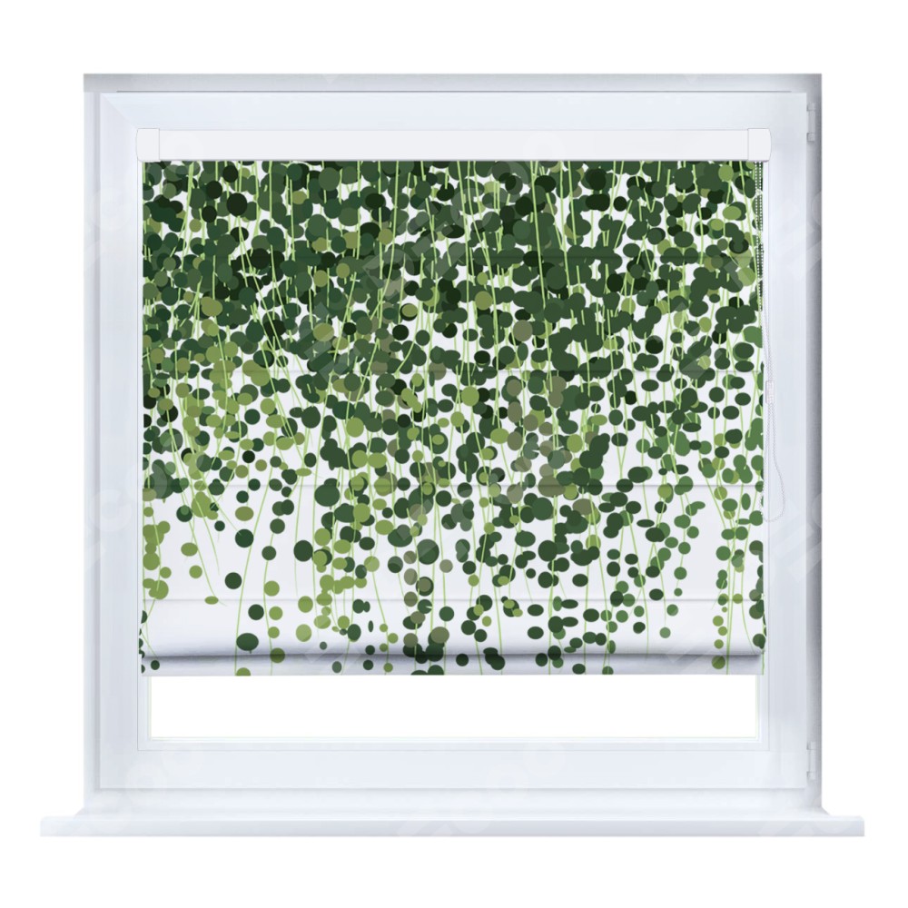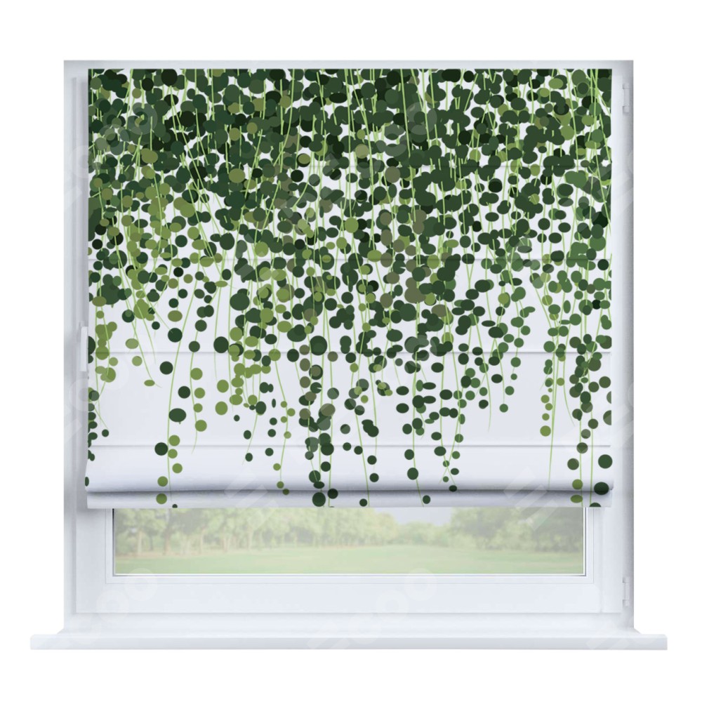 Римская штора производителя «Cortin», устанавливается на створку окна, пошита из ткани блэкаут с нанесением сублимационной печати «Зелёный занавес». Штора шьётся по индивидуальным размерам, для данного типа римской шторы возможная ширина от 35 до 150 см., высота до 250 см.
