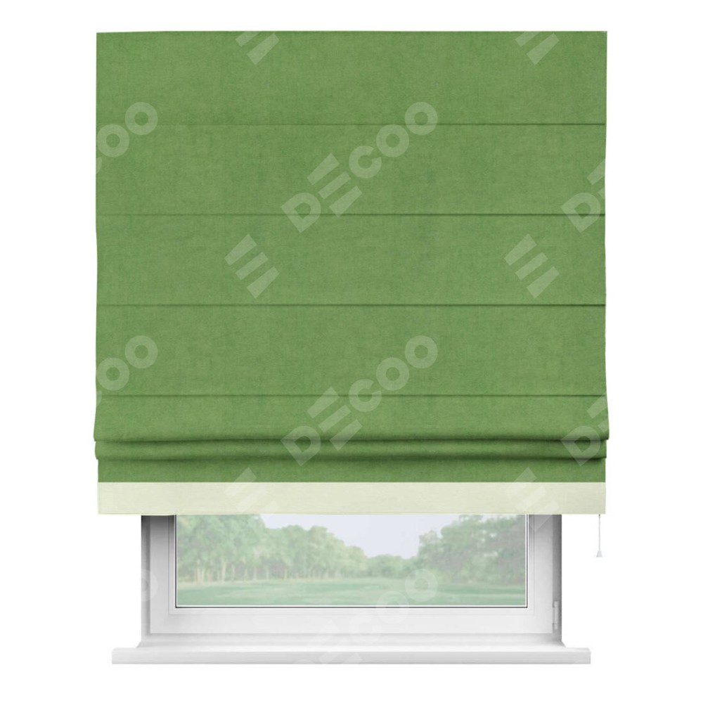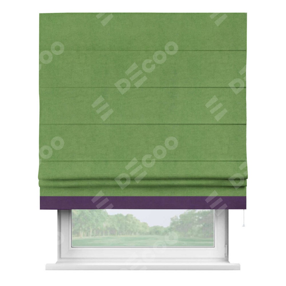 Римская штора производителя «Cortin», используется для проёма, пошита из ткани вельвет салатовый, артикул ткани 87072. Отделка шторы кантом «Джестер», ткань для канта используется из вельвета разной расцветки на выбор. Имеет универсальный механизм и подходит для монтажа: на потолок, на стену и в нишу.