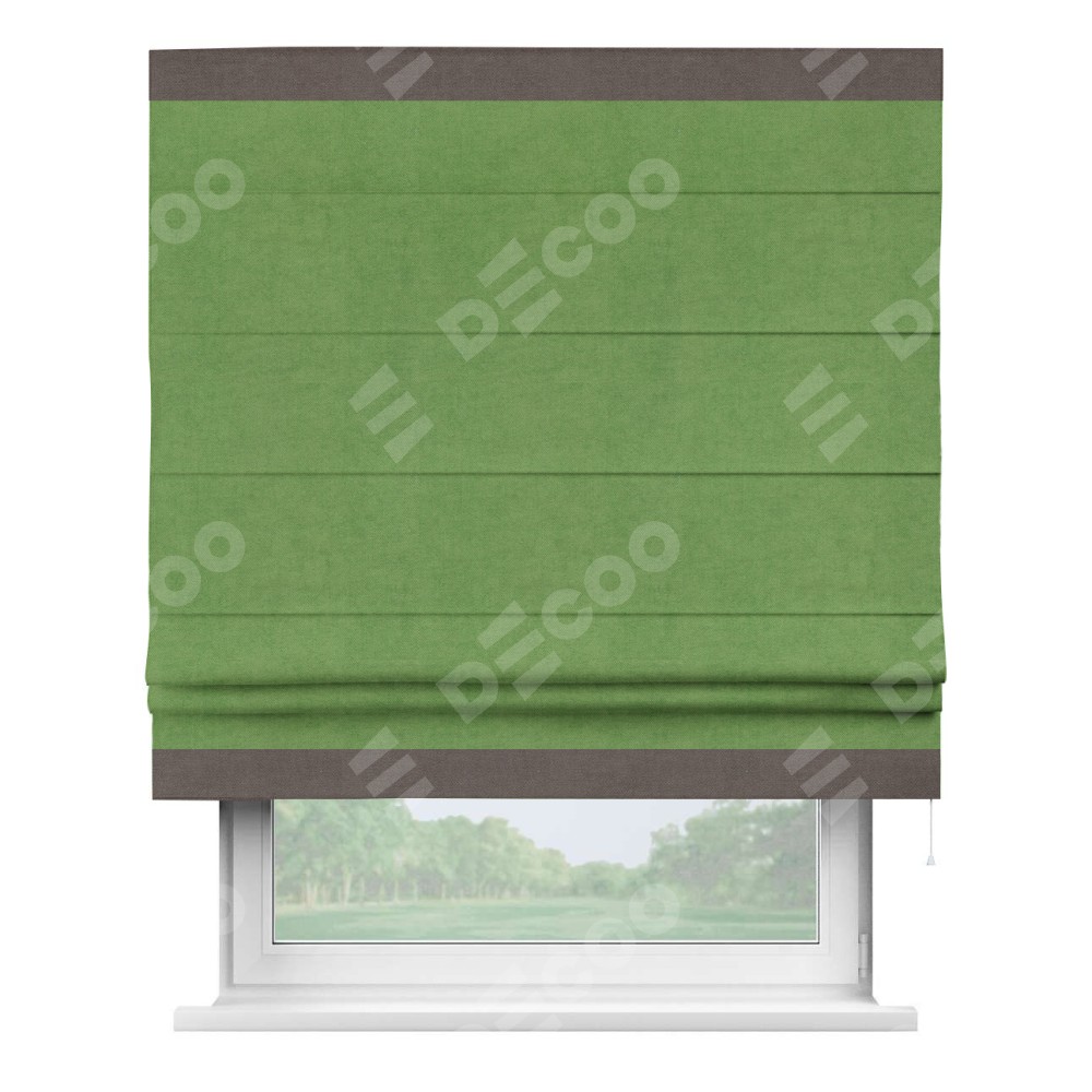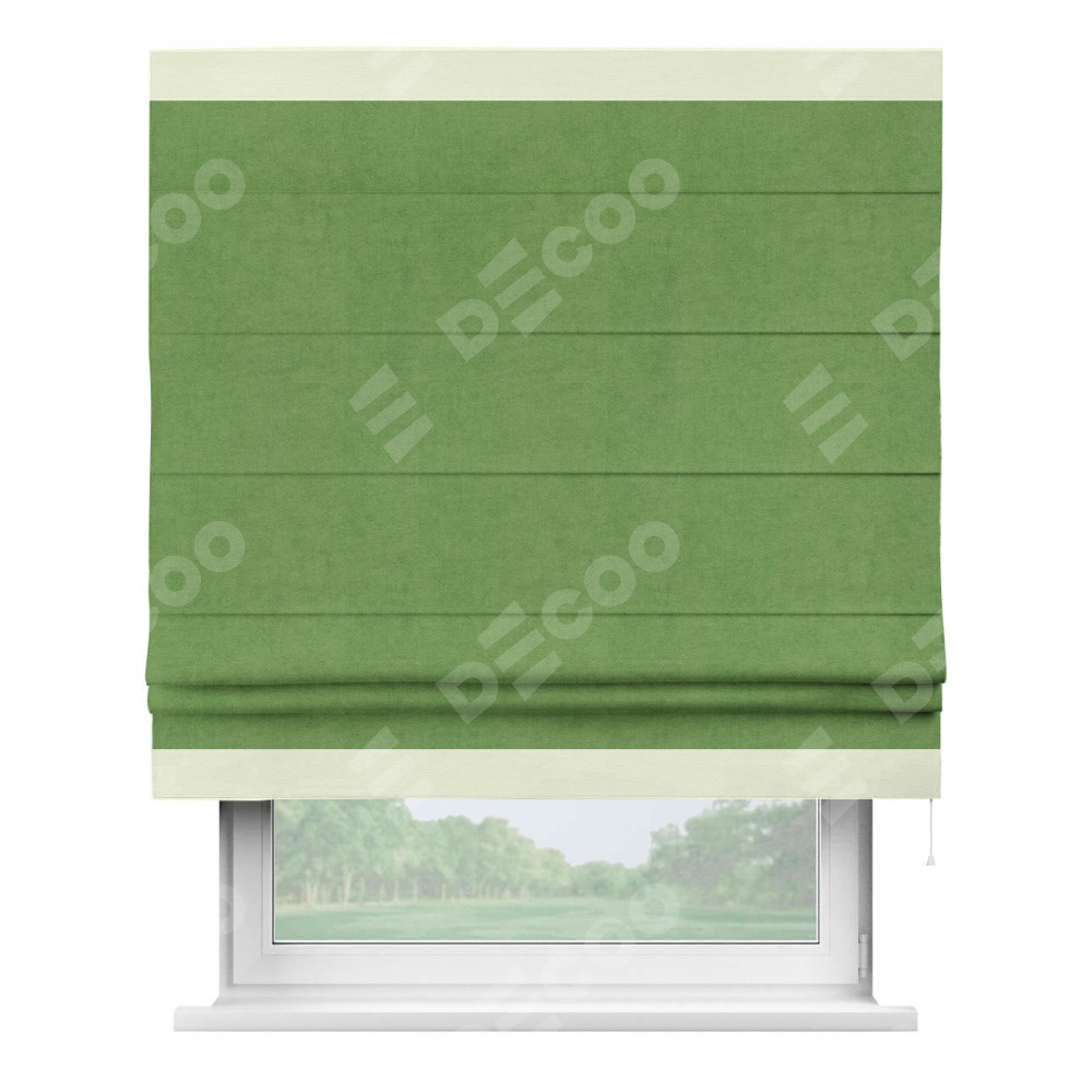 Римская штора производителя «Cortin», используется для проёма, пошита из ткани вельвет салатовый, артикул ткани 87072. Отделка шторы кантом «Горизонт», ткань для канта используется из вельвета разной расцветки на выбор. Имеет универсальный механизм и подходит для монтажа: на потолок, на стену и в нишу.