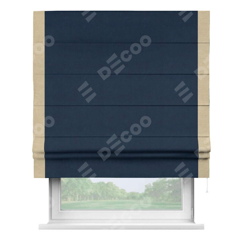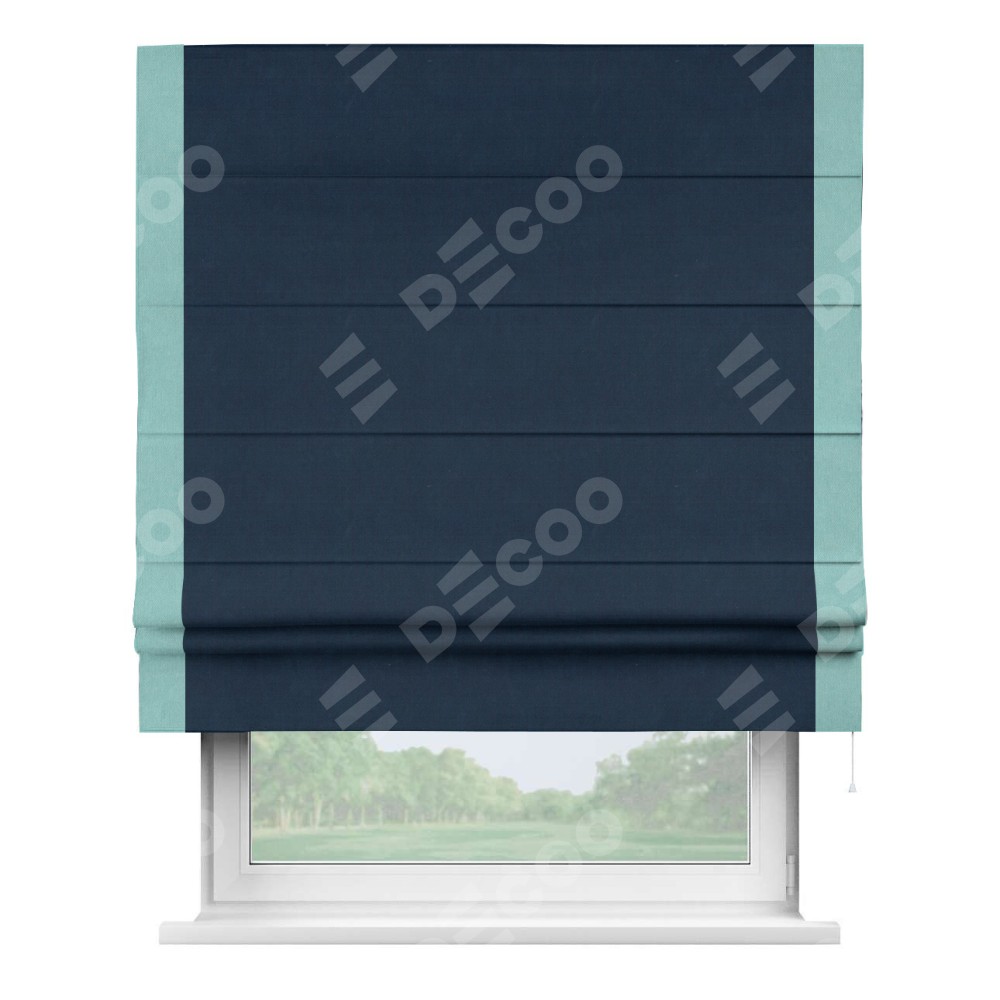 Римская штора производителя «Cortin», используется для проёма, пошита из ткани вельвет темно-синий, артикул ткани 14152. Отделка шторы кантом «Стрим Дуо», ткань для канта используется из вельвета разной расцветки на выбор. Имеет универсальный механизм и подходит для монтажа: на потолок, на стену и в нишу.