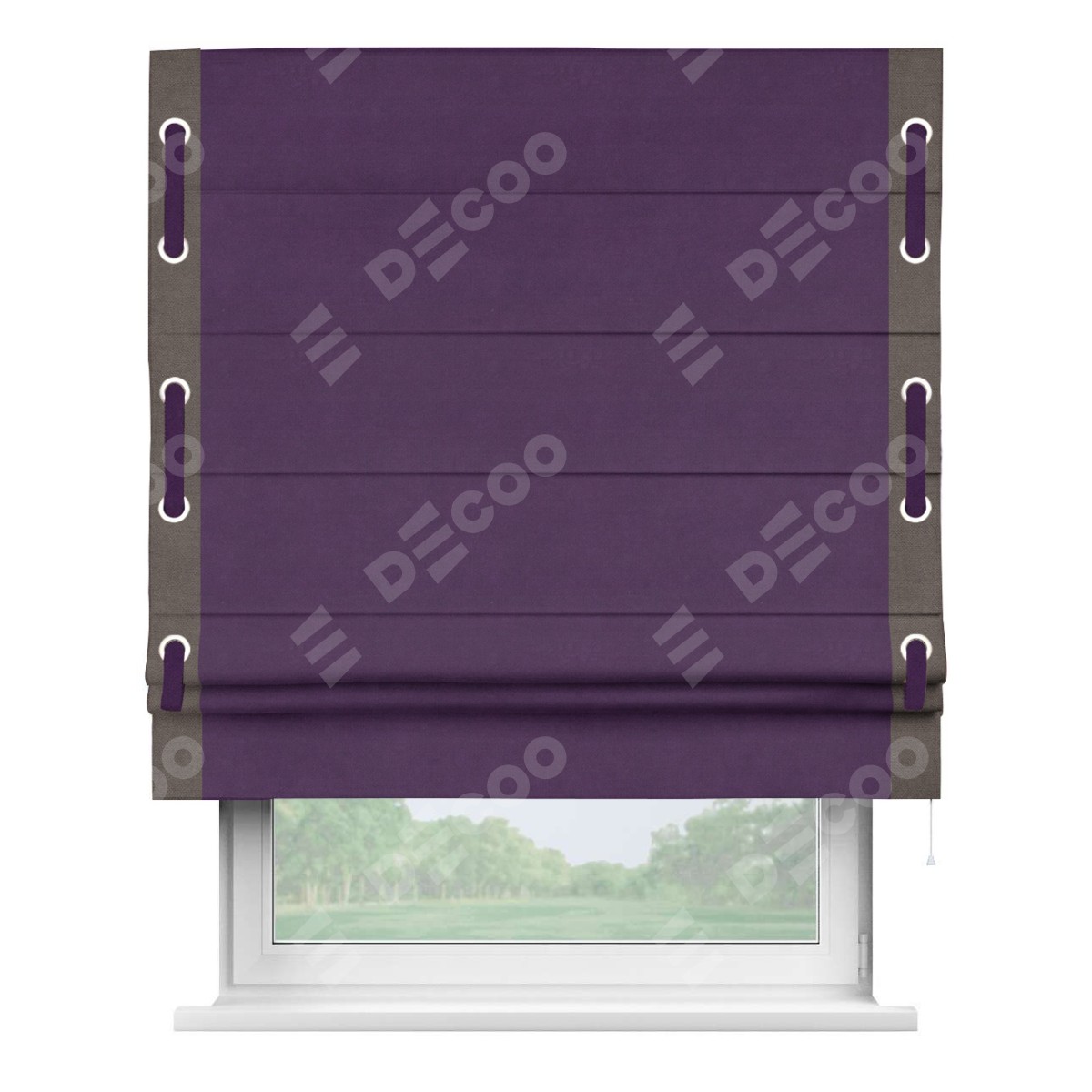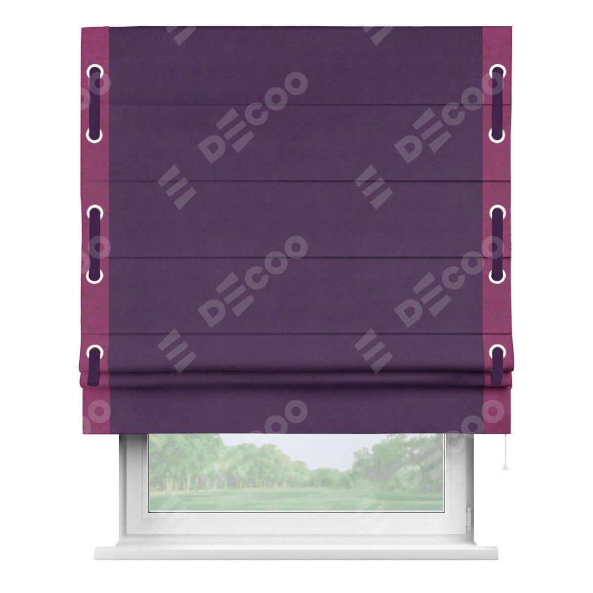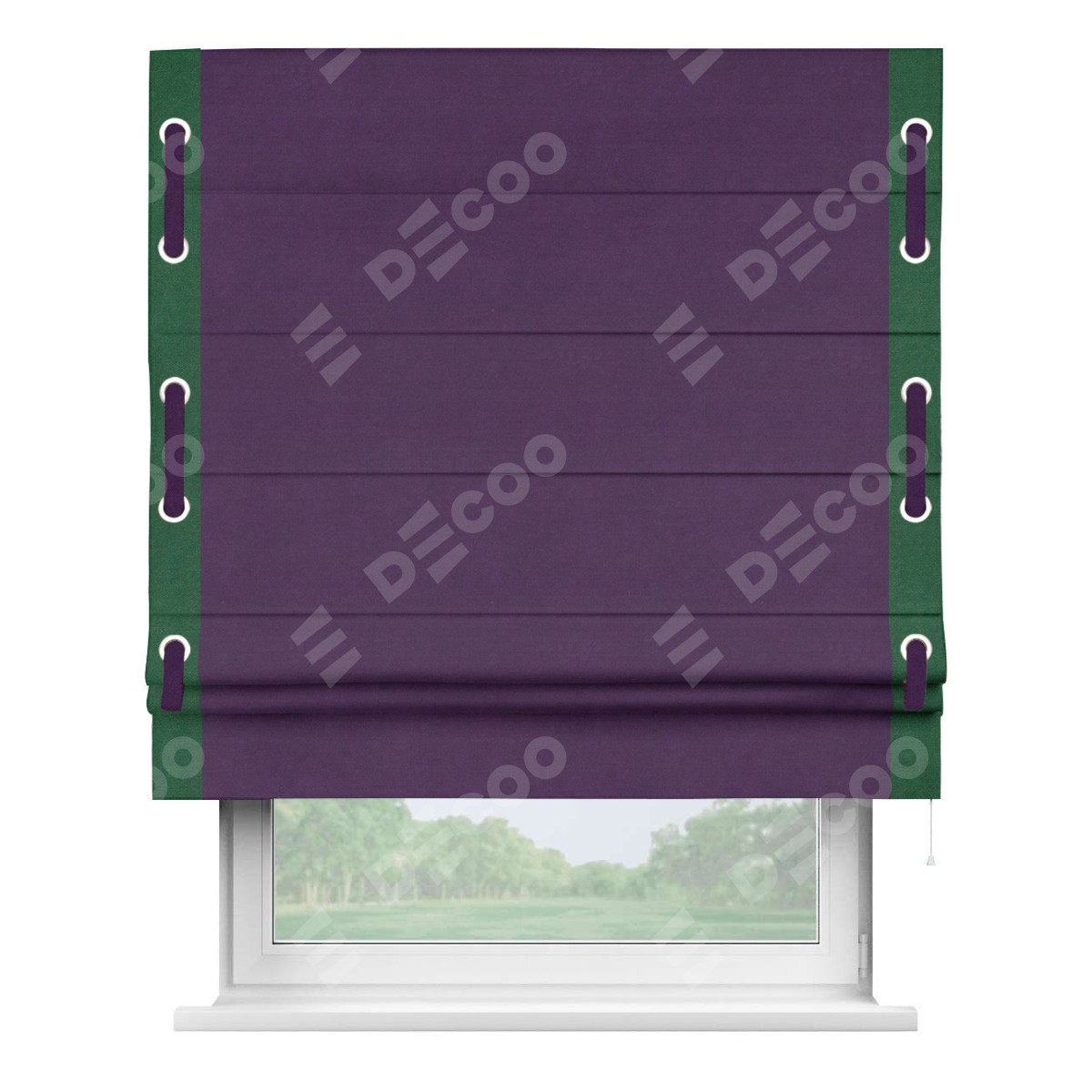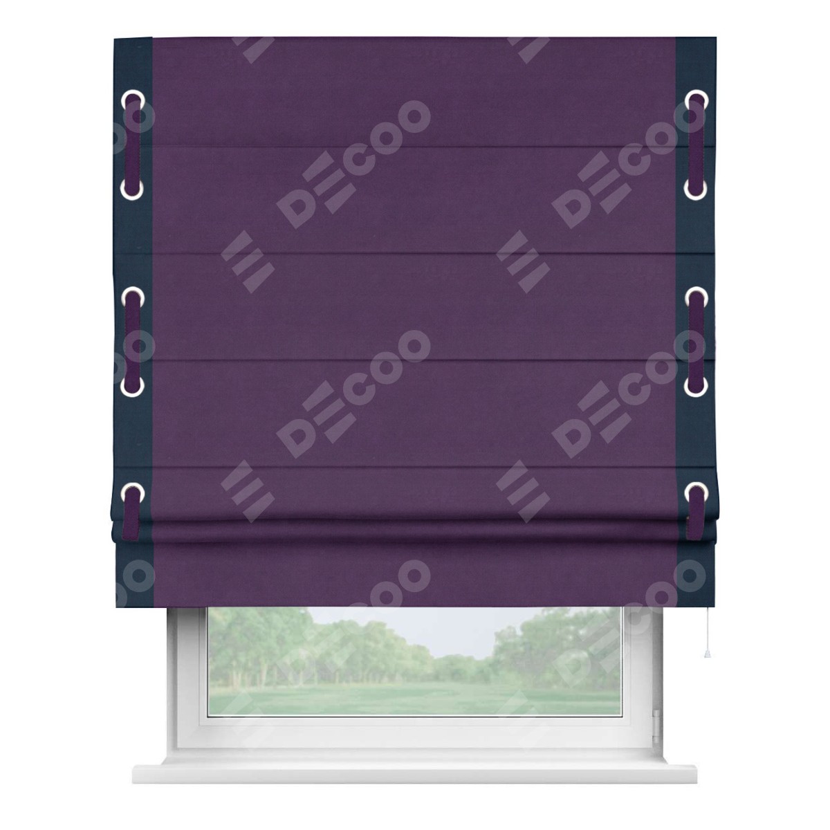 Римская штора производителя «Cortin», используется для проёма, пошита из ткани вельвет темно-фиолетовый, артикул ткани 17753. Отделка шторы кантом «Стрим Дуо» на кантах расположены люверсы с пояском, ткань для канта используется из вельвета разной расцветки на выбор. Ткань для пояска обычно используется из основной ткани шторы, а так же можно сделать из любой расцветки по желанию. Имеет универсальный механизм и подходит для монтажа: на потолок, на стену и в нишу.