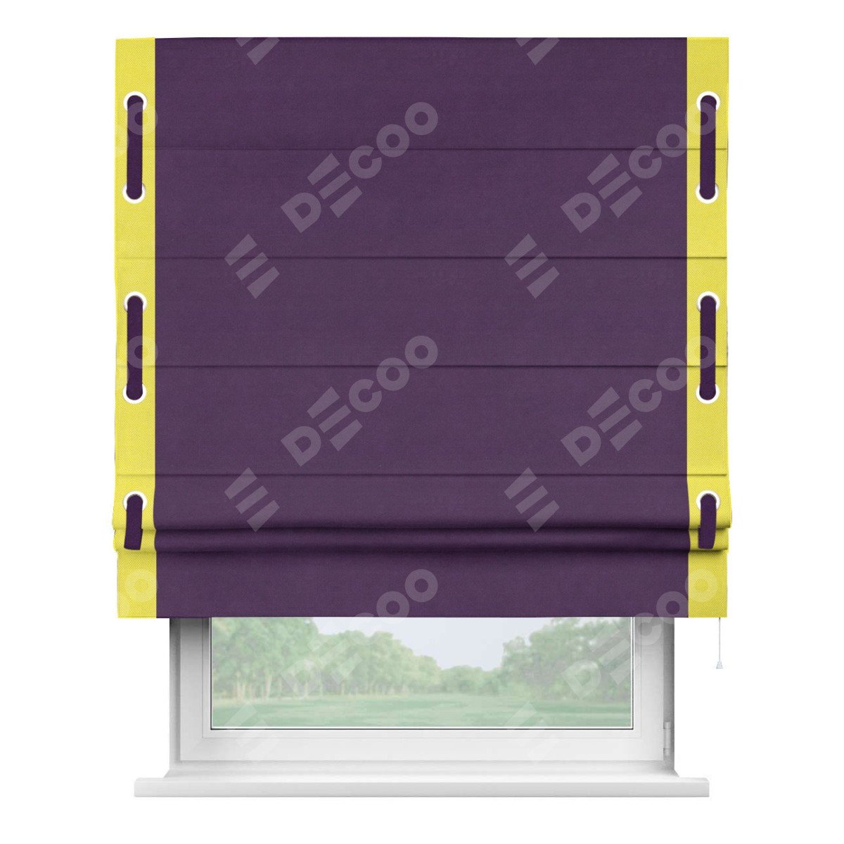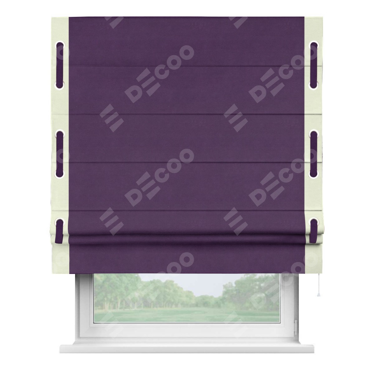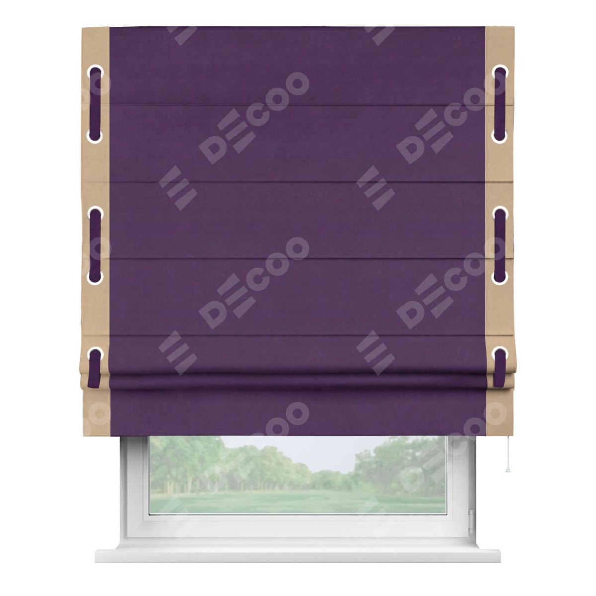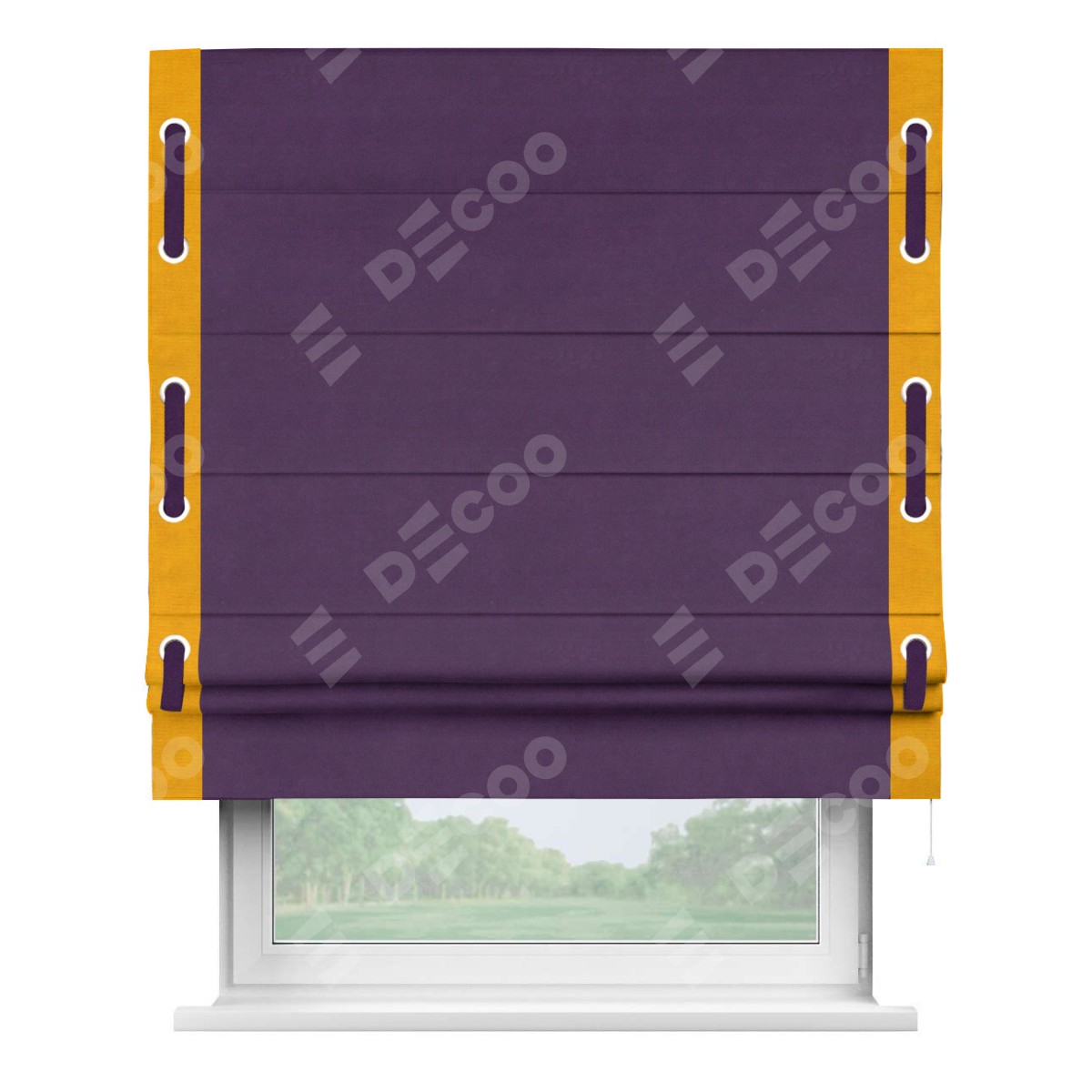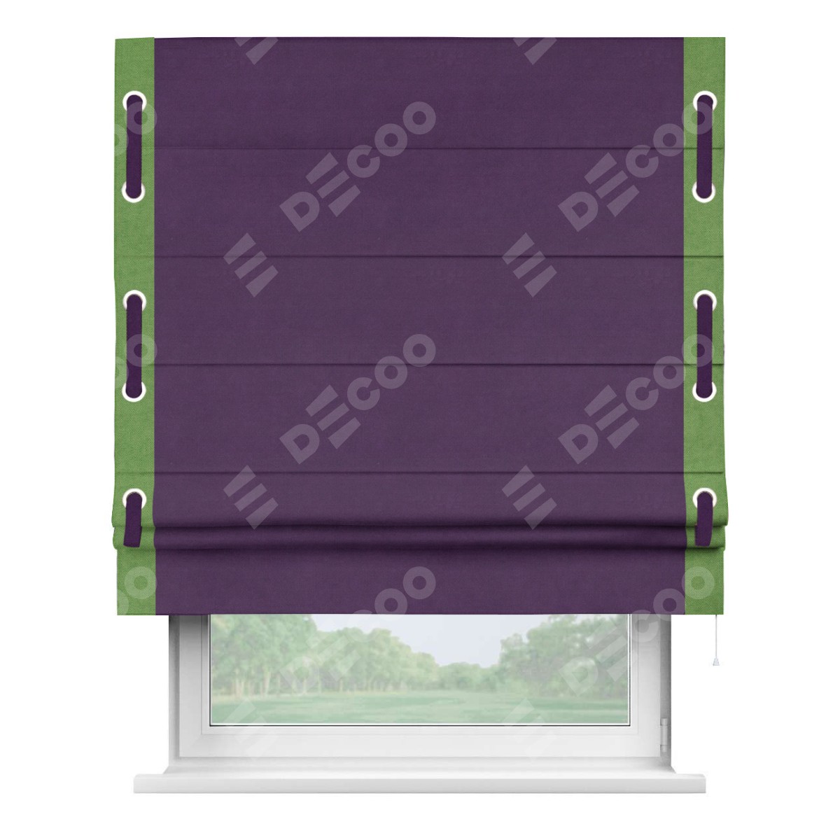 Римская штора производителя «Cortin», используется для проёма, пошита из ткани вельвет темно-фиолетовый, артикул ткани 17753. Отделка шторы кантом «Стрим Дуо» на кантах расположены люверсы с пояском, ткань для канта используется из вельвета разной расцветки на выбор. Ткань для пояска обычно используется из основной ткани шторы, а так же можно сделать из любой расцветки по желанию. Имеет универсальный механизм и подходит для монтажа: на потолок, на стену и в нишу.